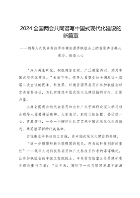 2024全国两会共同谱写中国式现代化建设的新篇章——领导人在民革科技界环境资源界联组会上的重要讲话凝心聚力、振奋人心深入调查研究,积极建言资政,广泛凝聚共识,助力中国式现代化建设。6日下午,领导人看望参加全国政协十四届二次会议的民革、科技界、环境资源界委员并参加联组会时发表重要讲话,为扎实推进中国式现代化建设指明方向、汇聚力量。出席全国两会的代表委员和会外广大干部群众深入学习领会领导人重要讲话精神。大家表示,新时代新征程,要团结一心、勇毅前行,一步一个脚印扎扎实实把中国式现代化向前推进,共同谱写新的壮美篇章。实现高水平科技自立自强,是中国式现代化建设的关键。进一步增强科教兴国强国的抱负,担当起科技创新的重任——领导人对科技界委员和广大科技工作者的谆谆嘱托,让参加联组会的中国工程院院士、中关村实验室主任吴建平委员感到重任在肩:近年来,国际下一代互联网发展不断演进,我们一定要打好互联网关键核心技术攻坚战、持久战,把创新主动权、发展主动权掌握在自己手中,为网络强国建设和高质量发展提供保障。领导人强调培育发展新质生产力的新动能,中国科学院院士、国家纳米科学中心研究员赵宇亮委员对此有自己的体会:从制度优势到超大规模市场,从完备的工业体系到庞大的科技人才队伍,我国发展新质生产力具有很多优势。我们要发挥好、利用好这些优势,深化科技体制改革和人才发展体制机制改革,将优势转化成实实在在的成果。中国电科首席专家柏松长期从事基础研究,带领团队持续攻关第三代半导体碳化硅器件研发创新。领导人要求加强基础研究和应用基础研究,令他深感振奋:我们将聚焦新质生产力发展需要的前瞻性、先导性前沿技术,持续开展相关领域从基础理论研究到产业化的全链条攻关,为加快培育新兴产业、未来产业筑牢科技创新根基。事业发展,要在创新;创新之道,唯在得人。大学具有教育、科技、人才三位一体的独特优势,在创新型人才培养和科技创新上有着自己的使命担当。电子科技大学高能电子学研究所所长魏彦玉代表说,我们将按照领导人要求,持续深化教育科技人才综合改革,根据科技发展新趋势和新质生产力发展需要,优化学科建设和人才培养模式,为高水平科技自立自强培养更多、更优秀的人才。中国式现代化是人与自然和谐共生的现代化。参加联组会后,北京首创环保集团智慧环保事业部总经理黄绵松委员反复领会领导人强调的全面准确落实精准治污、科学治污、依法治污方针的要求。他说:作为生态环境工作者,感到今后大有可为。我将带领团队以新一代信息技术、智慧化技术赋能传统的环保行业,系统性推进行业效率的提升,助力以生态环境高水平保护支撑经济社会高质量发展。领导人强调,广大环境资源界委员要在加强生态环境保护、以高水平保护支撑高质量发展上作出新贡献。在联组会现场发言的生态环境部海洋生态环境司副司长胡松琴委员表示:这是领导人对环境资源界委员提出的要求,也是对我们海洋工作者的殷殷嘱托。加强海洋生态文明建设,是生态文明建设的重要组成部分。我们将坚持陆海统筹、河海联动,持续推进重点海域综合治理攻坚战,继续抓好美丽海湾建设,让人民群众享受到碧海蓝天、洁净沙滩。千里之外,一直践行绿水青山就是金山银山理念的浙江安吉余村村,村民们早已尝到了生态饭的甜头。村党支部书记汪玉成代表在驻地学习了领导人的重要讲话,感慨万千:领导人强调拓展生态产品价值实现路径,为我们指明了方向。我们要把生态文明理念不断深入贯彻落实好,让看得见的绿水青山源源不断变成村民摸得着的股份红利,变成老百姓的幸福靠山!初春时节,塞外明珠乌梁素海正等待着冰雪消融。内蒙古自治区巴彦淖尔市乌梁素海生态保护中心主任包巍告诉记者,目前,乌梁素海水质稳定,鸟类和鱼类种群增加,生物多样性持续向好。他们将牢记领导人强调的夯实高质量发展的生态基础,不断改善湖区生态,为加强生态环境保护、以高水平保护支撑高质量发展作贡献。中国式现代化是包括台湾同胞在内的全体中华儿女的现代化。联组会上,民革福建省委会主委夏先鹏委员围绕加强两岸产业链供应链合作作了发言。领导人的重要讲话,深刻阐述了海峡两岸融合发展的重要性。夏先鹏说,近年来两岸产业链供应链合作取得了长足发展,但产业合作潜力尚未有效释放。我们将持续探索促进台商台企融入大陆产业链供应链体系的多元化路径,支持台企高质量发展,融入新发展格局。深化两岸各领域融合发展,这是领导人对民革和所有从事对台工作人员共同的要求。江苏省台联会长邹振球代表表示,未来我们将用心搭建多领域、多类型、多层次的融合发展平台,助力台商台胞共享发展机遇、安心扎根大陆。上海市总商会副会长、来伊份总裁郁瑞芬委员表示,领导人的重要讲话为两岸交流合作和融合发展开辟了更为广阔的空间。只要两岸同胞齐心协力、共谋发展,必能共享发展硕果,共创两岸繁荣与发