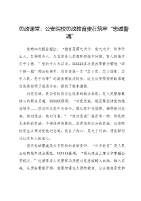 思政课堂:公安院校思政教育贵在筑牢忠诚警魂党的XX大报告指出:教育是国之大计、党之大计。培养什么人、怎样培养人、为谁培养人是教育的根本问题。育人的根本在于立德。党的十八大以来,XXXXXX多次提出要着力锻造四个铁一般的公安铁军,培育造就一支忠于党、忠于国家、忠于人民、忠于法律的高素质政法队伍,这为公安院校思政课建设发展指明了前进方向,提供了根本遵循。对党忠诚,是公安队伍与生俱来的政治品质,是人民警察最核心的职业灵魂。XXXXXX强调:对党忠诚,就是要坚持党的绝对领导……坚决听从党中央命令、服从党中央指挥,确保绝对忠诚、绝对纯洁、绝对可靠。绝对忠诚就是唯一的、彻底的无条件的忠诚,不掺任何杂质的、没有任何水分的忠诚。公安院校学生必须对党绝对忠诚,发自于内心,见之于行动,用实际行动让党和人民放心。筑牢忠诚警魂是公安院校的政治责任。公安姓党是人民公安的根本政治属性。XXXXXX强调:要从政治上建设和掌握公安机关。这就要求人民警察必须把对党忠诚铸入血脉、融入灵魂。从预备警察开始,就要加强这方面的教育。公安教育是党和国家教育事业的重要组成部分,公安院校的职责任务就是培养党和人民的忠诚卫士。公安院校必须培养一支坚定不移听党话、矢志不移跟党走、忠诚奉献为人民,脚踏实地,敢想敢为又善作善成,有理想、敢担当、能吃苦、肯奋斗的新时代公安铁军。筑牢忠诚警魂是锻造新时代公安铁军的应有之义。新时代公安机关承担着捍卫政治安全、维护社会安定、保障人民安宁的使命任务。和平年代,公安队伍是一支牺牲最多、奉献最大的队伍几乎是时时在流血、天天有牺牲。忠诚警魂是人民警察最重要的价值准则,是勇担使命的精神源泉。要锻造一支对党绝对忠诚的警察队伍,确保刀把子牢牢掌握在党和人民手中。筑牢忠诚警魂是思政课立德树人的使命担当。XXXXXX在全国学校思想政治理论课教师座谈会上指出,落实立德树人的根本任务,坚持教育为人民服务、为中国共产党治国理政服务、为巩固和发展中国特色社会主义制度服务、为改革开放和社会主义现代化建设服务。公安院校思政课是忠诚警魂教育的中心环节和关键课程。将忠诚警魂教育全面融入公安院校思政课教学实践,是公安院校贯彻政治建警、政治建校办学方针的重要抓手,是锻造新时代公安铁军的必然要求。提升忠诚警魂融入公安院校思政课育人效能。公安院校要把筑牢忠诚警魂作为一项战略性工作抓实抓好。坚持系统文可居文库——海量学习资料,手机电脑下载www.wenkeju.com观念,坚持问题导向,坚持守正创新,把忠诚警魂教育贯穿人才培养全周期、全场域,形成齐抓共管协同培育机制,实现铸绝对忠诚警魂、强过硬担当警能、塑廉洁干净警品的有机统一。协同推进打造一支优秀的思政课教师队伍。强警先强师,练兵先练教。公安院校思政课教师是学生成长成才、从警报国的引路人,担负着为党育人、为国育才、为警铸剑的使命,要做经师和人师相结合的大先生。一方面,要配齐配强专职思政教师队伍。以四有好老师为标准,建强一支政治过硬、师德高尚、功底扎实、了解实战的教师队伍。另一方面要充实优化兼职思政教师队伍,完善协同育人大格局。推进思政课教师+专业课教师+公安实务骨干的创新团队建设,打造一支政治过硬、科学完备、优势突出、结构合理、专兼结合的思政教师队伍体系。系统谋划构筑科学完备的忠诚警魂教育体系。推动完善具有公安特色的课程体系、教材体系、教学体系,推进思政课程与课程思政深度融合,推动忠诚警魂教育内涵式高质量发展。必须把坚定理想信念与提升实战本领结合起来。聚力创新思政+课程体系建设,思政+公安业务涵养为民情怀,思政+理想信念筑牢忠诚警魂,思政+警务实战提升斗争本领进一步推动思政课程系统化、实战化,打造系列思政金课。文可居文库——海量学习资料,手机电脑下载www.wenkeju.com常态化开展忠诚警魂教育主题实践活动,赓续忠诚基因,强化忠诚信念,把公安英模的榜样力量转化为学警的忠诚实践。守正创新构筑特色警营文化,涵养忠诚警魂。一是坚持从严管理,锻造忠诚警魂。要按照严于公安机关、高于公安机关的标准,完善警务化管理质量标准体系,培养忠诚使命、服从命令、令行禁止的警察职业精神、严明纪律作风。二是开展实战实训,锤炼忠诚警魂。健全课堂教学、实验实训、见习实习相结合的实战育人体系,强化警察职业荣誉感、使命感,让学警在实战实训中感受忠诚的力量,在克服困难中砥砺忠诚的品格。三是丰富警营生活,淬炼忠诚警魂。打造忠诚警魂警营文化,制度化常态化开展系列活动,以文化人、以文育警。四是发挥融媒体作用提升忠诚警魂文化宣传效果。多渠道全方位把忠诚警魂元素融入到警营文化培树宣传全周期、全链条,不断提高忠诚警魂文化影响力。加