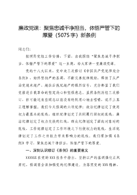 廉政党课:聚焦忠诚干净担当,体悟严管下的厚爱(5075字)新条例同志们:按照局党组工作安排,下面,由我围绕聚焦忠诚干净担当,体悟严管下的厚爱这一主题,给大家讲一堂廉政党课。党的十八大以来,党中央三次修订《中国共产党纪律处分条例》,始终坚持严的基调,不断完善纪律规矩,释放了从严治党越来越严、越往后执纪越严的强烈信号,充分彰显了我们党推进自我革命的坚定决心和坚强意志。虽然条例历经三次修订,但可能还有些同志以前没有特别用心地去咀嚼,说不上真正理解掌握。我们今天强调的六项纪律:政治纪律划定了使用权力最基本的底线,组织纪律划定了共同履行职权的底线,廉洁纪律划定了权力交换的红线,群众纪律划定了面向对象时的底线,工作纪律划定了工作环境之下行使权力的底线,生活纪律划定了工作之外权力带来影响力的底线。我们要加强《条例》学习,聚焦忠诚干净担当,体悟严管下的厚爱。一、深刻认识修订《条例》的重要意义XXXXXX在党的XXX报告中指出,坚持以严的基调强化正风肃纪,强调要全面加强党的纪律建设。为落实党的XXX精神,此次修订《条例》,将近年来我们党强化正风肃纪的理论创新、实践创新、制度创新成果及时固化为纪律规范,释放从严治党越来越严、越往后执纪越严的强烈信号,以严明的纪律确保全党目标一致、团结一致、步调一致。一是促进全党深刻领悟两个确立的决定性意义、坚决做到两个维护的必然要求。XXXXXX多次就开展纪律学习教育发表重要讲话、作出重要指示,为开展纪律学习教育提供根本遵循。全体党员干部要提高政治站位,主动对标对表,坚决把思想和行动统一到党中央决策部署上来,高标准高质量抓好纪律学习教育。要从学纪入手,推动党员干部强化遵守纪律的自觉,更加深刻把握经信工作的政治性、人民性,始终坚持党的全面领导和党中央的集中统一领导,确保在思想上、政治上、行动上始终同以XXX同志为核心的党中央保持高度一致。二是推进全面从严治党的紧迫要求。全面从严治党永远在路上近年来,局党组和党员干部不断强化全面从严治党的思想自觉和行动自觉,基层党建取得新成效,政治生态持续向好。但是,全面从严治党的任务仍然艰巨,对党的纪律建设不够重视、纪律意识淡薄等问题仍不同程度存在。要进一步深化对加强党的纪律建设重要性的认识,把纪律学习教育作为持续净化政治生态的有力抓手,加快补齐短板弱项,把各项纪律规矩立起来、严起来,一体推进三不文可居文库——海量学习资料,手机电脑均可下载www.wenkeju.com腐,教育引导广大党员干部从思想上固本培元,提高党性觉悟,增强拒腐防变能力。三是总结从严管党治党经验、实现制度与时俱进的实践要求。党的十九大把纪律建设纳入党的建设总体布局,党中央持之以恒加强纪律建设,聚焦关键少数抓纪律,健全党员干部日常行为管理规范,推进领导干部能上能下工作,整治形式主义为基层减负,深入治理民生领域腐败和不正之风,纪律建设取得重要的实践成果和制度成果。《条例》在总结实践经验基础上,与时俱进完善纪律规范,有利于充分发挥纪律建设标本兼治的利器作用,推动全面从严治党向纵深发展。二、准确把握《条例》修订的主旨要义《条例》是管党治党的重要基础性法规,我们要认真学习理解《条例》,准确把握《条例》的内涵要义和实践要求。(一)严明政治纪律和政治规矩。《条例》把坚决维护以XXX同志为核心的党中央权威和集中统一领导作为出发点和落脚点,进一步充实完善各级党组织和全体党员在政治方向、政治立场、政治言论、政治行为方面必须遵守的纪律规矩。一是牢牢把握党的纪律建设的政治属性和时代特征,在总则中增写坚持自我革命为以中国式现代化全面推进强国建设、民族复兴伟业提供坚强纪律保障等内容,并在分则具体条文中文可居文库——海量学习资料,手机电脑均可下载www.wenkeju.com贯通体现。二是完善保障党中央政令畅通的纪律条款,在政治纪律中增加对不顾党和国家大局、搞部门或者地方保护主义行为的处分规定,将贯彻党中央决策部署只表态不落实行为由违反工作纪律调整到违反政治纪律。三是落实党的XXX关于加快构建新发展格局,着力推动高质量发展的决策部署,在总则中要求党组织和党员切实践行正确的权力观、政绩观、事业观,在分则政治纪律中充实党员领导干部政绩观错位,违背新发展理念、背离高质量发展要求的处分规定,将搞劳民伤财的形象工程政绩工程行为由违反群众纪律调整到违反政治纪律。四是充实对党不忠诚不老实、破坏党的团结统一的处分条款,增写搞政治攀附、结交政治骗子等行为的处分规定。五是针对执纪监督中发现的问题,增写对私自阅看、浏览、收听有严重政治问题资料、情节严重行为的处分规定,进一步完善对党员信仰宗教、个人搞迷信活动行为的处理处分条款。(二)加强全方位管理和经常性监督。XXXXXX强调,要加强对干部经常性