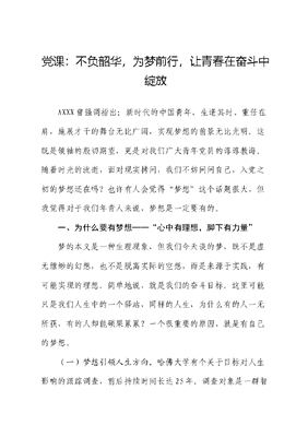党课:不负韶华,为梦前行,让青春在奋斗中绽放AXXX曾强调指出:新时代的中国青年,生逢其时、重任在肩,施展才干的舞台无比广阔,实现梦想的前景无比光明。这既是领袖的殷切期望,更是对我们广大青年党员的谆谆教诲。随着时光的流逝,面对现实拷问,我们不妨问问自己,入党之初的梦想还在吗?也许有人会觉得梦想这个话题很大,但我觉得对于我们年青人来说,梦想是一定要有的。一、为什么要有梦想——心中有理想,脚下有力量梦的本义是一种生理现象,但我们今天谈的梦,既不是虚无缥缈的幻想,也不是脱离实际的空想,而是来源于实践,有可能实现的理想。简单地说,就是我们的奋斗目标。这里可能只是我们人生中的一个驿站,同样的人生,为什么有的人一无所获,有的人却能硕果累累?一个很重要的原因,就是有自己的梦想。(一)梦想引领人生方向。哈佛大学有个关于目标对人生影响的跟踪调查,前后持续时间长达25年。调查对象是一群智力、学历等各方面条件都差不多的人。调查发现,其中27%的人没有目标,60%的人目标模糊,10%的人目标清晰但较短,只有3%的人目标清晰而长远。25年后的跟踪结果显示,那27%的人几乎生活在社会底层,25年来生活上都需要社会救济,并且常常仇恨他人埋怨社会;60%的人生活在社会中下层,生活工作安稳但都没什么特别成就;10%的人生活在社会中上层,短期目标不断实现,生活状态稳步上升;而那3%的人,在这25年里一直朝着目标不懈努力,几乎都成为了社会精英。这个调查结果深刻揭示了奋斗目标对人生的重要性。这段历程是我们人生中完善心智、丰富知识、储备能量的重要时期,这段经历将决定着我们会有一个怎样的人生,必须要制定一个引领自己成长的目标。(二)梦想赋予强劲动力。大家应该都有这样的体会,当我们很想实现某个目标时,心里就会有很强的动力。AXXX的七年知青岁月大家都耳熟能详,他正是靠着想为老百姓办实事的梦想,在极端艰苦的环境下,先后闯过跳蚤关、饮食关和劳动关,带领乡亲们修梯田、打地坝,制沼气,办铁业社和文可居文库——海量学习资料,手机电脑均可下载www.wenkeju.com代销点等等,从一个不谙世事的青少年脱胎换骨为群众心里的主心骨,眼里的好后生,为成为人民领袖、全党核心奠定了坚实根基。志之所趋,无远勿届,穷山距海,不能限也。我们广大青年党员大多出生在新世纪,成长在新时代,在实现梦想的人生机遇面前,都应该叩问自己:你,准备好了吗?(三)梦想激发无限潜能。有句话说得好:我们决定不了人生的长度,但可以决定人生的宽度。这个宽度就取决于我们的梦想,因为梦想可以激发我们的无限潜能。无臂钢琴王子刘伟,10岁时就失去了双臂,2011年被评为感动中国人物,他曾说过:我的人生中只有两条路,要么赶紧死,要么好好活着。正是这个好好活着的梦想,催使他克服了种种困难,用双脚赶超常人,实现了人生的精彩。我们在平时的学习工作中,也会面临各种各样的困难,与其消极应付,不如迎难而上,在努力拼搏后你会发现,原来自己还可以这么优秀!二、应该有什么梦想——志当存高远,奋勇敢担当文可居文库——海量学习资料,手机电脑均可下载www.wenkeju.com伟大的领袖毛主席年少第一次离开韶山时,就写下孩儿立志出乡关,学不成归誓不还,埋骨何须桑梓地,人生何处不青山的铮铮誓言;周总理在学生时代就立志为中华之崛起而读书;AXXX也曾语重心长的勉励广大青年青年一代有理想、有担当,国家就有前途,民族就有希望。大家都渴望成才,但无论你的梦想是什么,身为青年都要志存高远,敢于担当,因为奋斗的青春最美丽。首先,个人梦要融入强国梦。梁启超在《少年中国说》里面讲到故今日之责任,不在他人,而全在少年。少年强则国强,少年进步则国进步。AXXX多次通过写信座谈等方式,对当代中国青年寄予殷切期望,比如得其大者可以兼其小,中国梦是国家的梦、民族的梦,也是包括广大青年在内的每个中国人的梦。实现中华民族伟大复兴的中国梦,需要一代又一代有志青年接续奋斗。广大青年要勇敢肩负起时代赋予的重任,志存高远,脚踏实地,努力在实现中华民族伟大复兴中国梦的生动实践中放飞青春梦想。作为青年一代,我们应文可居文库——海量学习资料,手机电脑均可下载www.wenkeju.com从国家利益出发、从大众福祉出发,把个人的小目标与实现民族复兴梦紧密相连。其次,个人梦要贴合自身实际。适合自己的才是最好的。梦想与空想只有一步之遥,那就是脱离实际。长征是一步步走出来的,梦想是一点点汇聚成的。我们入党之初都有自己的梦想,都有在奋斗的想法,但只有确立一些符合自身实际的小目标,才能一步一步实现自己的大目标。从大处着眼,从实际出发,从小处着手,积少成多一点一点实现自己的梦想。三、如何实现梦想——锲而