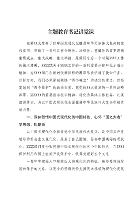 主题教育书记讲党课党的XX大擘画了以中国式现代化推进中华民族伟大复兴的宏伟蓝图,明确了一系列具有全局性、战略性、前瞻性的重要思想重要观点、重大战略、重大举措,是做好今后一个时期XXXX工作的根本遵循。XXXXXX关于XXXX工作的一系列重要论述和批示批示精神,为XXXX部门在新时代新征程的履职尽责明确了使命任务、目标方向。我们必须深刻领悟两个确立的决定性意义,以坚定做到两个维护的政治自觉,把党的XX大提出的一系列战略部署、XXXXXX的重要指示批示精神,转化为具体工作任务,扎实推进落实,为以中国式现代化全面推进中华民族伟大复兴积极贡献力量。一、深刻领悟中国式现代化的中国特色,心怀国之大者学思想、担使命以中国式现代化全面推进中华民族伟大复兴,是中国共产党领导的社会主义现代化,是基于自己国情、符合中国实际的现代化。XXXX部门要全面把握中国式现代化的五个中国特色,在XXXX保护利用和国土空间开发保护中,统筹处理好五个关系。一要牢牢把握人口规模巨大的现代化的特征,统筹处理好发展和保护的关系,以更小的资源代价支撑更大规模的现代化发展需要;二要牢牢把握全体人民共同富裕的现代化特征,统筹处理好公平和效益的关系,以高质量资源保障,支撑人民群众共享发展成果;三要牢牢把握物质文明和精神文明相协调的现代化特征,统筹处理好历史文化传承和城乡开发建设的关系,以更加科学的规划建设支撑中华传统文化的继承创新;四要牢牢把握人与自然和谐共生的现代化特征,统筹处理人与自然的关系,构建节约资源和保护环境的空间格局、生产方式以美丽中国的新姿态走进现代化;五要牢牢把握走和平发展道路的现代化特征,统筹处理好发展和安全的关系,坚决维护国土安全、国家安全,以更加务实的举措保障粮食安全、生态安全、数据安全。二、清醒认识XXXX工作面临的形势,在把握两个大局中找定位、明职责XXXXXX强调,必须牢固树立高度自觉的大局意识,自觉从大局看问题,把工作放到大局中去思考、定位、摆布。我们认真学习XXX新时代中国特色社会主义思想,深刻领悟党的XX大精神,面对以中国式现代化全面推进中华民族伟大复兴这个大局,系统分析XXXX工作面临的形势,明确严守资源安全底线、优化国土空间格局、促进绿色低碳发展、维护资源资产权益的XXXX工作定位。严守资源安全底线。新征程上,国家安全面临的外部压力前所未有,XXXX领域安全形势不容乐观。十八亿亩耕地绝不能有任何闪失,必须实至名归,重要能源矿产资源对外依存度高,地理信息安全、地质灾害和海洋灾害防治等都面临严峻形势,一刻也不能放松。XXXX系统必须把严守资源安全底线作为思考和推动工作的前提,既要充分利用两个市场、两种资源,也要未雨绸缪加强国内生产保障能力,在国内国际双循环中增强我国资源保障能力,实现高质量发展和高水平安全良性互动。优化国土空间格局。加快构建以国内大循环为主体、国内国际双循环相互促进的新发展格局,强调构建优势互补、高质量发展的区域经济布局和国土空间体系。我们要深刻领悟,构建新发展格局是在国内统一大市场基础上形成大循环,既要坚持全国一盘棋,也要发挥各地区比较优势,促进优势互补、各展其长、协调发展。要围绕区域协调发展战略、区域重大战略、主体功能区战略和新型城镇化战略实施,完善国土空间规划体系和空间治理政策,优化国土空间发展格局,推动解决区域、城乡、陆海空间发展不平衡不充分问题,支撑构建新发展格局。XXXX系统必须把优化国土空间格局作为一项长期战略,整体谋划国土空间开发,统筹人口分布、经济布局、国土利用、生态环境保护,科学布局生产空间、生活空间、生态空间,更好支撑高质量发展。促进绿色低碳发展。高质量发展是全面建设社会主义现代化国家的首要任务,强调推动经济社会发展绿色化、低碳化是实现高质量发展的关键环节。我们要深刻领悟,发展仍然是我们党执政兴国的第一要务,但发展应当是高质量的发展;绿色低碳发展是化解我国资源环境紧约束的根本出路,是促进经济结构升级的必然要求,是满足人民对美好生态环境需要的必然选择。XXXX系统必须站在人与自然和谐共生的高度,牢固树立绿水青山就是金山银山的理念,完整、准确、全面贯彻新发展理念,坚持节约优先、保护优先、自然恢复为主的方针,协同推进降碳、减污、扩绿、增长,推进生态优先、节约集约、绿色低碳发展,坚持山水林田湖草沙一体化保护和系统治理,努力以较少的资源消耗、较小的生态损害支撑更大规模的经济发展,提升生态系统的多样性稳定性、持续性,积极促进碳达峰碳中和。维护资源资产权益。XXXX资产产权制度是市场经济运行的基本制度之一,涉及国家、集体、企业、个人等重大财产利益。我区XXXX资产产权制度还不健全,一些深层次问题还没有完全破题资源资产产权价值显化不够。XXXX系统必须按照充分发挥市场在资源配置中的决定性作用,更好发