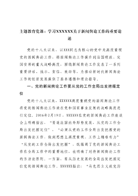 主题教育党课:学习XXXXXX关于新闻舆论工作的重要论述党的十八大以来,以XXX同志为核心的党中央高度重视党的新闻舆论工作,将新闻舆论工作提升到治国理政、定国安邦的重大战略高度,围绕新闻舆论工作发表了一系列重要讲话、批示、贺信、致辞等,为推动新时代新闻舆论工作的创新发展提供了基本遵循和理论指导。一、党的新闻舆论工作要从党的工作全局出发把握定位党的十八大以来,XXXXXX高度重视党的新闻舆论工作将党的新闻舆论工作放在党和国家事业发展的战略高度进行定位。2016年2月19日,XXXXXX在党的新闻舆论工作座谈会上明确指出,要适应国内外形势发展,从党的工作全局出发把握定位,必须从党的工作全局出发把握党的新闻舆论工作,做到思想上高度重视、工作上精准有力从党的工作全局出发把握,既强调了党的新闻舆论工作在全局工作中的重要地位,也明确了对待新闻舆论工作的方法论原则。一方面,要从历史发展的全局出发把握定位党的新闻舆论工作。XXXXXX指出:马克思主义政党历来把新闻舆论工作作为进行革命斗争的有力武器,重视党的新闻舆论工作,是我们党的优良传统,也是革命建设改革事业不断取得胜利的一个重要法宝。这从历史维度深刻阐明了新闻舆论工作的地位作用。另一方面,要从党和国家事业发展的全局出发把握定位党的新闻舆论工作XXXXXX着眼于当下,指出:党的新闻舆论工作是党的一项重要工作。做好党的新闻舆论工作,事关旗帜和道路,事关贯彻落实党的理论和路线方针政策,事关顺利推进党和国家各项事业,事关全党全国各族人民凝聚力和向心力事关党和国家前途命运,做好党的新闻舆论工作,营造良好舆论环境,是治国理政、定国安邦的大事。在会见中国记协第九届理事会全体代表和中国新闻奖、长江韬奋奖获奖者代表时,XXXXXX再次指出,做好党的新闻舆论工作,营造良好舆论环境,是治国理政、定国安邦的大事,党的新闻舆论工作是党的工作的重要组成部分XXXXXX从治党治国的战略高度,用一项重要工作五个事关重要组成部分精准定位新闻舆论工作在党的全局工作中的重要位置,阐释了党的新闻舆论工作与党和国家全局工作的内在关系,为党的新闻舆论工作做到思想上高度重视、工作上精准有力提供了重要指导。二、党的新闻舆论工作要牢牢把握党性原则党性原则是党的新闻舆论工作历来所必须坚持的一项根本原则。XXXXXX不仅在多个场合反复强调新闻媒体的党性原则,而且从理论层面作出深刻全面的论证和阐释,指明牢牢坚持党性原则的途径方法。在根本要义上,坚持党性原则就是要坚持党对新闻舆论工作的领导,坚持正确政治方向。2013年8月19日,XXXXXX在全国宣传思想工作会议上提出,要坚持党管媒体原则不动摇,坚持政治家办报办刊、办台、办新闻网站。在党的新闻舆论工作座谈会上,XXXXXX进一步提出:党性原则是党的新闻舆论工作的根本原则。党管宣传、党管意识形态、党管媒体是坚持党的领导的重要方面。XXXXXX结合新闻舆论工作的特点将党性原则具体化为党管宣传、党管意识形态、党管媒体有针对性地提出新闻宣传领域坚持党性原则的具体要求。XXXXXX高度重视媒体的政治导向,提出八个讲导向:各级党报党刊、电台电视台要讲导向,都市类报刊、新媒体也要讲导向;新闻报道要讲导向,副刊、专题节目、广告宣传也要讲导向;时政新闻要讲导向,娱乐类、社会类新闻也要讲导向;国内新闻报道要讲导向,国际新闻报道也要讲导向。将党性原则覆盖到包括新媒体在内的所有媒体中。在价值立场上,坚持党性原则要全面把握好党性和人民性的关系。XXXXXX明确指出,党性和人民性从来都是一致的、统一的……从本质上说,坚持党性就是坚持人民性,坚持人民性就是坚持党性,党性寓于人民性之中,从党性和人民性的辩证关系角度,对二者的内在联系进行了全面系统的阐释。在党的新闻舆论工作座谈会上XXXXXX结合新闻舆论工作特点,进一步指出新闻媒体要把对党负责和对人民负责统一起来、把服务群众同教育引导群众结合起来、把满足需求同提高素养结合起来,明确对党负责和对人民负责的内在统一性,为践行党性与人民性相统一原则提供了行动指南和价值遵循。在行动取向上,坚持党性原则要遵循团结稳定鼓劲、正面宣传为主的基本方针。2013年8月19日,XXXXXX在全国宣传思想工作会议上指出:关键是要提高质量和水平,把握好时、度、效,增强吸引力和感染力,让群众爱听爱看、产生共鸣,充分发挥正面宣传鼓舞人、激励人的作用。在党的新闻舆论工作座谈会上,XXXXXX结合新闻舆论工作的特点,对这一方针作出进一步阐释,坚持团结稳定鼓劲、正面宣传为主,涉及怎样看待真实性这个重大问题,搞清楚是个别真实还是总体真实,不仅要准确报道个别事实,而且要从宏观上把握和反映事件或事物的全貌。在如何坚持这一方针的问题