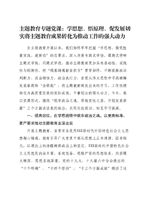 主题教育专题党课:学思想、悟原理、促发展切实将主题教育成果转化为推动工作的强大动力自主题教育开展以来,我们始终牢牢把握学思想、强党性重实践、建新功的总要求,深入开展专题式学悟、课题式学研主题式学践、问题式学改,推动主题教育更加具有基础性、实践性与创新性。把强基铸魂彰显担当贯穿始终,不断提高政治判断力、政治领悟力、政治执行力,自觉从伟大思想中寻找破解发展难题的金钥匙,将主题教育焕发出来的学习、工作热情转化为高质量发展的实际成效、干事创业的强大动力。今天,我以党课形式,围绕筑牢政治之魂、厚植党性之基、开创发展新篇三个方面谈谈我的体会,共同交流探讨、相互学习提高。一、提高站位,在学思践悟中筑牢政治之魂,以更高标准、更严要求推动主题教育走深走实开展主题教育,首要任务是用XXX新时代中国特色社会主义思想凝心铸魂,教育引导广大党员干部从思想上正本清源、固本培元,以理论上的清醒确保政治上的坚定。XXX新时代中国特色社会主义思想是内涵丰富、系统完备、逻辑严密的思想体系,内容博大精深、思想系统深邃,党的十九大、十九届六中全会提出的十个明确、十四个坚持、十三个方面成就概括了这一思想的主要内容。真学真懂、学好用好XXX新时代中国特色社会主义思想,要从充分认识重大理论和实践意义入手,领会好、把握好这一思想的世界观和方法论,运用好、坚持好根本政治立场科学的思想方法。党的XX大报告把XXX新时代中国特色社会主义思想的世界观和方法论概括为六个坚持,即必须坚持人民至上坚持自信自立,坚持守正创新,坚持问题导向,坚持系统观念,坚持胸怀天下,这是XXX新时代中国特色社会主义思想活的灵魂,集中体现了这一思想的重大理论和实践意义。一是要提高站位。广大党员干部一定要提升政治觉悟,深刻认识开展开展XXX新时代中国特色社会主义思想主题教育的重大现实意义和深远历史意义,切实增强做好工作的责任感和使命感,以坚韧顽强的斗争精神、较真碰硬的工作态度、务实创新的工作作风,把这项重大政治任务扛在肩上、抓在手上,务求取得扎扎实实的成效。二是要学深悟透。以开展XXX新时代中国特色社会主义思想主题教育为契机,推进XXX新时代中国特色社会主义思想主题教育常态化制度化,注重采取理论和实践、历史和现实、当前和未来相结合的方法,真正领会深、领会透这一科学理论,更加自觉地为实现新时代党的历史使命不懈奋斗。三是要融会贯通。要以高度自觉接受主题教育锻造洗礼,推动主题教育同业务工作深度融合,不断提高政治判断力、政治领悟力、政治执行力,自觉从伟大思想中寻找破解发展难题的金钥匙,作为推动事业发展的最高政治原则和根本政治责任,确保各级党组织和广大党员干部坚定沿着XXXXXX指引的方向奋勇前进。二、唯真唯实,在学思践悟中厚植党性之根,以更大力度、更实举措推动党员教育提质增效XXXXXX指出,党性是党员干部立身、立业、立言、立德的基石。党性基石不牢固,各类问题就很难从根本上解决。这次主题教育,把加强党性修养作为重要内容。我们要认真落实强党性要求,自觉用XXX新时代中国特色社会主义思想改造主观世界,深刻领会这一思想关于坚定理想信念、提升思想境界、加强党性锻炼等一系列要求,一刻不停地加强党性修养和党性锤炼,永葆政治本色。一要强化理论武装。理论修养的深度决定着党性修养的高度要坚持把学懂弄通做实XXX新时代中国特色社会主义思想作为必修课、首修课、终身课,毫不松懈地加强党的创新理论武装,筑牢坚定马克思主义信仰、中国特色社会主义信念的思想根基,以理论上的清醒永葆政治上的坚定。要自觉主动学。制定个人学习计划,坚持学原文、读原著、悟原理,认真学习《XXX新时代中国特色社会主义思想专题摘编》等著作,持续抓好党史、新中国史、改革开放史、社会主义发展史学习教育,推动理论学习常态化长效化。二要强化对党忠诚。对党忠诚是共产党人首要的政治品质,也是党性修养的关键所在。要坚持旗帜鲜明讲政治,时时、事事处处用政治眼光审视问题,用政治标尺校准工作,用政治纪律约束言行举止,把对党绝对忠诚体现到坚定捍卫两个确立、坚决做到两个维护上。有句话很发人深省,因为我们走的太远,以至于忘了当初为什么出发。近年来,随着西方思想思潮的不断涌入,社会价值观趋向多元化,有些党员在入党的问题上功利化、庸俗化,他们入党以后就把党员身份不当回事,忘记了当初入党的誓言,忘记了当时的满腔热血。每当回首入党历程时我们都应该扪心自问,还能否做到初心不改,对党组织不懈的追求、那种信誓旦旦的决心?初心不改就是要做到始终如一,既是人生的始终,也是党的事业、人民的利益的始终。三要强化道德修养。道德修养是党性修养的基石,XXXXXX指出,道德之于个人、之于社会,都具有基础性意义,做人做事第一位的是崇德修身,要求党员干部特别是领导干部务必把加强