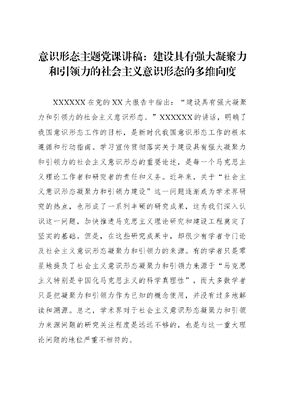 意识形态主题党课讲稿:建设具有强大凝聚力和引领力的社会主义意识形态的多维向度XXXXXX在党的XX大报告中指出:建设具有强大凝聚力和引领力的社会主义意识形态。XXXXXX的讲话,明确了我国意识形态工作的目标,是新时代我国意识形态工作的根本遵循和行动指南。学习宣传贯彻落实关于建设具有强大凝聚力和引领力的社会主义意识形态的重要论述,是每一个马克思主义理论工作者和研究者的责任和义务。近年来,关于社会主义意识形态凝聚力和引领力建设这一问题逐渐成为学术界研究的热点,也形成了一系列丰硕的研究成果,这为我们深入认识这一问题,加快推进马克思主义理论研究和建设工程奠定了坚实的基础。但是,在这些研究成果中,却很少有学者专门论及社会主义意识形态凝聚力和引领力的来源。有的学者只是零星地提及了社会主义意识形态凝聚力和引领力来源于马克思主义特别是中国化马克思主义的科学真理性,而大多数学者只是把凝聚力和引领力作为已知的概念使用,并没有过多地解读和溯源。总之,学术界对于社会主义意识形态凝聚力和引领力来源问题的研究关注程度是远远不够的,也是与这一重大理论问题的地位严重不相符的。一、主体维度:中国共产党先进性建设意识形态凝聚力和引领力的建设程度往往与意识形态建构者和宣传者的本质有着紧密的关系。社会主义意识形态建设的主体就是马克思主义政党,这是由社会主义意识形态的内涵和性质所决定的,而我国的建设主体只能是马克思主义政党———中国共产党。实质上,社会主义意识形态建设就是从心理认知层面更加确认了中国共产党是领导中国人民走向民族复兴的坚强领导核心。中国共产党作为一个负责任的马克思主义政党,是可以作为社会主义意识形态建设的主体的,这是对我国意识形态工作的经验总结,也是制胜法宝。总之,中国共产党的先进性决定了我国能够建设具有强大凝聚力和引领力的社会主义意识形态,能够整合社会力量,凝聚人民共识,指导人民实践。中国共产党的先进性建设,从历史上讲就是党领导人民所取得的历史性成就。中国共产党自成立之初,就将为人民谋幸福、为民族谋复兴镌刻在自己的旗帜上。19xx年,经过xx年的奋斗,党带领人民取得新民主主义革命的胜利,建立了新中国,中国人民第一次成为国家的主人。19xx年,党带领人民开启了改革开放的历史征程,勤劳、勇敢、善良的中国人民通过自己的双手,实现了物质和精神上的双重富足。党的十八大的召开,标志着我国进入社会主义新时代。我国日益走近世界舞台的中央,在中华民族伟大复兴的康庄大道上奋勇行进,在发展自身的同时,积极构建人类命运共同体,创造人类文明新形态,为人类发展进程中所遇到的问题提供了中国智慧和中国方案。中国共产党百年奋斗史,就是带领人民从一个胜利走向另一个胜利,从而建立起人民对于中国共产党的拥护和信任。中国共产党的先进性建设,从理论上讲就是因为党有着自我革命的精神。党的十八大以来,XXXXXX多次强调自我革命精神对于党的先进性建设的重要性。XXXXXX指出,自我革命就是使党不断自我净化、自我完善、自我革新、自我提高,勇于自我革命,是我们党最鲜明的品格,也是我们党最大的优势。中国共产党需要自我革命,也能够自我革命,这是马克思主义政党的性质使然,也是最大优势。中国共产党的百年奋斗史已经深刻说明,我们党敢于直面问题、敢于承认错误,并能够迅速、果断地与各种错误划清界限,对任何有损人民利益和党的自身形象的行为采取零容忍的态度,从而永葆我们党的先进性。新时代,我国的发展既面临着重大的历史机遇,也面临着不少风险挑战。有外部风险,也有内部风险;有一般风险,也有重大风险。在新形势下,中国共产党要勇于自我革命,善于自我革命,就要建立不忘初心、牢记使命的长效机制,从根本上保持党的先进性,从而让我们党永远以人民性政党的光辉形象带领人民奋勇前进。中国共产党的先进性建设,从现实上讲就在于党能够时刻保持与人民群众的血肉联系。中国共产党根基在人民、血脉在人民,人民性是党的本质属性。中国共产党自成立之初,就确立了全心全意为人民服务的根本宗旨。密切与人民群众的血肉联系,是中国共产党领导中国革命、建设、改革取得成功的制胜法宝,是中国共产党的巨大政治优势。党的十八大以来,以XXX同志为核心的党中央坚持以人民为中心的发展思想,深刻阐明了人民的主体地位,开启了新时代党的群众工作的新局面。密切保持与人民群众的血肉联系,就是要贯彻落实党的群众路线,各级党员干部以身作则、言传身教。要言传,各级党员干部要给人民群众讲党的先进理论,特别是要用XXX新时代中国特色社会主义思想来解决现实问题,突显其强大现实解释力和实践指引力;要身教,各级党员干部要不忘初心、牢记使命,真真切切为人民办好事、办实事,用实际行动凝聚人们的共识。二、内容维度:马克思主义中国化时代化马克思认为:理论只要说服人,就能掌握群众;而理论只