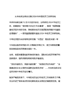 从中央政治局会议看2024年中国经济工作新动向中共中央政治局12月8日召开会议,分析研究2024年经济工作,明确提出坚持稳中求进工作总基调,强调巩固和增强经济回升向好态势,持续推动经济实现质的有效提升和量的合理增长,一系列重要部署传递出2024年经济工作新动向。今年经济回升向好明年迎来实施十四五规划的关键一年今年是全面贯彻党的XX大精神的开局之年,是三年新冠疫情防控转段后经济恢复发展的一年。当前,我国发展面临的形势错综复杂,国际政治经济环境不利因素增多,国内周期性和结构性矛盾叠加。顶住外部压力、克服内部困难我国经济回升向好全面建设社会主义现代化国家迈出坚实步伐……中央政治局会议这样总结今年经济运行情况。复杂严峻的形势下,今年的经济运行和经济工作成绩来之不易,充分印证了党中央对形势判断和相关决策的正确性预见性。展望新的一年,领导人在12月6日召开的党外人士座谈会上也作出判断:我国经济恢复仍处在关键阶段。2024年,是中华人民共和国成立75周年,是实施十四五规划的关键一年,做好经济工作至关重要。加大宏观调控力度切实增强经济活力、防范化解风险、改善社会预期巩固和增强经济回升向好态势持续推动经济实现质的有效提升和量的合理增长……针对明年经济工作,中央政治局会议作出系列部署。国家发展改革委国民经济综合司负责人说,会议提出的三个统筹是明年经济工作需要把握的重要原则。统筹扩大内需和深化供给侧结构性改革,把两者有机结合起来,增强国内大循环内生动力和可靠性,提升国际循环质量和水平。统筹新型城镇化和乡村全面振兴,坚持不懈抓好三农工作,把农业转移人口市民化摆到更加突出位置,推动城乡融合发展。统筹高质量发展和高水平安全,扭住高质量发展不动摇,持续有效防范化解重点领域风险,加强国家安全能力建设,以新安全格局保障新发展格局。要坚持稳中求进、以进促稳、先立后破中央政治局会议指出,明年要坚持稳中求进、以进促稳、先立后破,强化宏观政策逆周期和跨周期调节,继续实施积极的财政政策和稳健的货币政策。坚持稳中求进、以进促稳、先立后破,关键是把握好蕴含其中的辩证关系。国家发展改革委国民经济综合司负责人说,推进各项工作都需要尊重规律。在稳的基础上推动进,通过经济结构、发展质量、重大改革上的进来实现稳。在立和破上也需要把握好先后顺序,否则会影响经济发展大局,这也是经济工作的重要方法论。清华大学中国发展规划研究院常务副院长董煜认为,当前经济运行中的问题既有短期的也有长期的。从会议部署看,明年宏观政策将更精准发力,多做加法,采取更加积极主动的支持政策,用发展的办法解决问题,进一步提振信心。此外,会议强调,积极的财政政策要适度加力、提质增效,稳健的货币政策要灵活适度、精准有效。今年以来,我国继续实施积极的财政政策和稳健的货币政策,加大宏观政策调控力度,加强各类政策协调配合,努力推动经济总体回升向好,扎实推进高质量发展。会议在明确适度加力的同时,强调提质增效,有助于强化财政政策的针对性。中国社科院财政税收研究中心主任杨志勇说,在近年来我国持续实施积极的财政政策背景下,明年的财政政策仍将继续发力、保持积极、提质增效,更加精准、更有针对性地发挥作用。上海金融与发展实验室主任曾刚认为,通过稳健的货币政策做好逆周期和跨周期调节,保持货币信贷总量和社会融资规模合理增长,用好结构性货币政策工具,实现灵活适度、精准有效,有力有效支持实体经济稳定增长。中央政治局会议提出,要增强宏观政策取向一致性,加强经济宣传和舆论引导。增强宏观政策取向一致性,既能提升政策效果,又有助于稳定市场预期。曾刚说,一方面要实现新旧政策的接续,另一方面要做好财政、货币、产业、监管等政策的协调配合,形成共促高质量发展的合力。加快构建新发展格局为高质量发展持续注入强大动力构建新发展格局,关键在于实现经济循环的畅通无阻,主要取决于供给和需求两端是否动力强劲、总体匹配,动态平衡、良性互动。对此,中央政治局会议提出统筹扩大内需和深化供给侧结构性改革,并作出一系列重要部署。围绕供给端,会议提出,要以科技创新引领现代化产业体系建设,提升产业链供应链韧性和安全水平。当前,新一轮科技革命和产业变革深入发展,辐射范围之广、影响程度之深前所未有。要坚持把科技创新作为主动力,以科技创新引领产业变革、提升产业能级,补短板、锻长板,大力培育新的支柱产业,不断开辟发展新领域新赛道,塑造发展新动能新优势。董煜说。围绕需求端,会议提出,要着力扩大国内需求,形成消费和投资相互促进的良性循环。国家发展改革委国民经济综合司负责人说,一方面,满足消费需求特别是人民日益增长的美好生活需要,要不断提高有效供给能力和质量,改善供给需要有效投资;另一方面,在投资