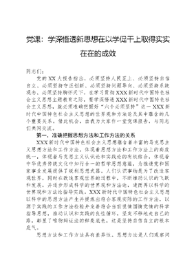 党课:学深悟透新思想在以学促干上取得实实在在的成效同志们:党的XX大报告指出,必须坚持人民至上、必须坚持自信自立、必须坚持守正创新、必须坚持问题导向、必须坚持系统观念、必须坚持胸怀天下。在学习贯彻XXX新时代中国特色社会主义思想主题教育之际,要学深悟透XXX新时代中国特色社会主义思想,就必须准确把握好六个必须坚持这一XXX新时代中国特色社会主义思想的世界观和方法论及其中蕴含的几个重要关系。借此机会,由我为大家作一堂党课报告,与同志们共同交流。第一,准确把握思想方法和工作方法的关系XXX新时代中国特色社会主义思想蕴含着丰富的马克思主义思想方法和工作方法,体现着思想方法和工作方法上的高度统一,体现着马克思主义认识论和实践论的有机结合,体现着中华优秀传统文化中知行合一的哲学思想意蕴,为推进党和国家事业发展提供了锐利思想武器。人们认识事物是为了改造客观世界,同时在改造客观世界的过程中,不断推动认识的飞跃和发展,并逐步形成科学的世界观和方法论,进而再以科学的世界观和方法论指导实践。XXX新时代中国特色社会主义思想以科学的思想方法产生并提炼出符合客观实际的工作方法,以源于实践的工作方法检验并完善符合当前世情国情党情的科学指导思想,推动认识和实践的良性循环,坚定不移地走自己的路,彰显了唯物辩证法的鲜亮底色,这是坚持自信自立的根本底气。思想方法和工作方法具有差异性。思想方法是人们观察问题、分析问题,即认识世界的根本方法;工作方法是思想方法在实践中的具体体现,是确保思想方法落地落实的必要手段,即改造世界的根本方法。实事求是、独立自主、矛盾分析、群众路线等是XXX新时代中国特色社会主义思想中的思想方法,是方法论中的基础逻辑。目标引领、顶层设计、问题导向、调查研究等是XXX新时代中国特色社会主义思想中的工作方法,是方法论中的实践逻辑,为做好实际工作,提供了极具价值的工具箱。因此,我们要注意区分好思想方法和工作方法,做到精准号脉、正确问诊,不断提高解决问题的本领,切实掌握好马克思主义思想方法和工作方法,不断提升运用马克思主义立场、观点、方法分析和解决问题的能力本领,确保党和国家各项事业顺利推向前进。第二,准确把握问题导向和目标导向的关系XXX新时代中国特色社会主义思想提出,必须坚持问题导向这一方法,这是对马克思主义世界观和方法论的继承和发展,体现了新时代中国共产党人发现问题的智慧、直面问题的勇气和解决问题的能力。坚持问题导向,就是要增强问题意识,时时刻刻思考现实中我们亟需解决的重大问题,时时刻刻思考未来发展中我们将会遇到的难题。这一方法告诉我们,当前我国面临着群众关注关切问题改革发展深层次问题国际局势紧张问题党的领导和党的建设问题等一系列重大问题。坚持问题导向就是要透过现象看本质,把握问题实质,敢于直面问题、善于解决问题。在新时代的十余年来,中国共产党人敢于直面问题,科学把握和分析全面深化改革中的深层次矛盾,妥善解决粮食安全、能源安全问题,有效应对四大考验和四种危险等重大问题。实践证明,坚持问题导向,就是要科学分析问题,将问题分类,把问题找准,并通过扎扎实实的调查研究,提出解决突出矛盾和问题的思路、办法。坚持目标导向和问题导向相统一,是XXX新时代中国特色社会主义思想的科学方法论,是推进中国式现代化的思维方法和重要路径。问题和目标是事物发展的一体两面,是辩证统一的有机整体。问题导向强调发现问题的自觉、解决问题的方法;目标导向强调解决问题的努力和实效。坚持目标导向和问题导向相统一,就是要以目标任务为统领,着力解决当代中国发展中存在的突出问题。人民对美好生活的向往是新时代中国共产党的奋斗目标,在这一目标指引下,中国共产党人要着力解决就业、教育、医疗、托育、养老、住房、安全等人民群众急难愁盼问题,让改革发展成果惠及千万百姓、造福千万百姓。只有紧紧锚定目标,从目标倒逼问题,积极破解改革发展稳定中各种难题,在不断克服困难、解决问题中向着既定目标迈进,才能确保各项工作扎实有效。第三,准确把握系统论和重点论的关系坚持系统观念,是XXX新时代中国特色社会主义思想的世界观和方法论的重要内容,主要表现为横向上的通观全局、统筹兼顾,涵盖了全局观、整体观、长远观等科学的思想方法和工作方法。系统观念是马克思主义关于事物普遍联系方法在实践中运用的结晶,是改革的系统性、整体性、协同性实践的理论升华,扎根于中国特色社会主义伟大实践之中,从整体视角把脉我国政治、经济、文化、社会、生态等各项事业发展状况。坚持系统观念,应该分清主次、把握重点。XXX新时代中国特色社会主义思想坚持两点论与重点论相统一,既保持心怀国之大者的全局视野,又善于把握战略重点和主攻方向,进而实现重要领域和关键环节的突破。由此可见XXX新时代中国特色社会主义思想在强调全面协