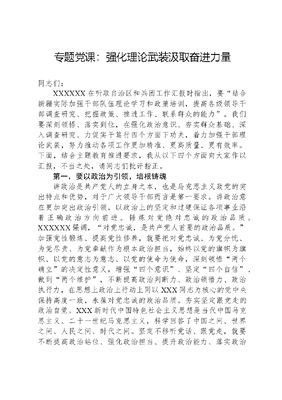 专题党课:强化理论武装汲取奋进力量同志们:XXXXXX在听取自治区和兵团工作汇报时指出,要结合新疆实际加强干部队伍理论学习和政策培训,提高各级领导干部调查研究、把握政策、推进工作、联系群众的能力。我们要深刻领悟、落实到位,在强化政治意识、夯实群众基础、深入调查研究、力促实干笃行四个方面下功夫,着力加强干部理论武装,努力推动各项工作更加精准、更高质量、更有效率。下面,结合主题教育推进要求,我从以下四个方面向大家作以汇报,不当之处,请同志们批评指正。第一,要以政治为引领,培根铸魂讲政治是共产党人的立身之本,也是马克思主义政党的突出特点和优势,对于广大领导干部而言是第一要求。讲政治意在更加突出政治引领,以政治上的坚定和过硬保证各项事业沿着正确政治方向前进。锤炼对党绝对忠诚的政治品质。XXXXXX强调,对党忠诚,是共产党人首要的政治品质。加强党性锻炼、提高党性修养,就要把对党忠诚、为党分忧、为党尽责、为党奉献作为根本政治担当,始终以党的旗帜为旗帜、以党的意志为意志、以党的使命为使命,深刻领悟两个确立的决定性意义,增强四个意识、坚定四个自信、做到两个维护,不断提高政治判断力、政治领悟力、政治执行力,在思想上政治上行动上同以XXX同志为核心的党中央保持高度一致,永葆对党忠诚的政治品质。夯实坚定跟党走的政治自觉。XXX新时代中国特色社会主义思想是当代中国马克思主义、二十一世纪马克思主义,科学回答了中国之问、世界之问、人民之问、时代之问。坚定不移听党话、跟党走,就要不断提高政治站位、强化政治担当、提升政治能力、落实政治责任,切实把思想和行动统一到XXXXXX重要讲话精神和党中央决策部署上来,完整准确全面贯彻新时代党的治疆方略,牢牢扭住社会稳定和长治久安总目标,把党中央安排部署贯彻到位、落实到位。恪守清正廉洁的政治本色。XXXXXX指出,作风问题本质上是党性问题。领导干部的作风直接关系党内风气和政治生态,关系民心向背,决定着党的群众基础。我们要时刻把党章中对党的干部提出的讲党性、重品行、作表率,做到自重、自省、自警、自励要求铭记于心,培养廉洁自律道德操守,严明党的政治纪律和政治规矩,处理好公和私、义和利、是和非、正和邪、苦和乐关系,知敬畏、存戒惧、守底线,敬畏党、敬畏人民、敬畏法纪,始终做政治上的明白人、作风上的正派人、廉洁自律的带头人。第二,要以人民为中心,强基固本人民性是马克思主义最鲜明的品格。人民立场是中国共产党的根本政治立场,是马克思主义政党区别于其他政党的显著标志。坚持以人民为中心是新时代坚持和发展中国特色社会主义的基本方略,也是贯穿XXX新时代中国特色社会主义思想的一条主线。江山就是人民,人民就是江山的经典论断深刻诠释了党的执政基础是广大人民群众,以人民为中心指明了新征程上必须走好新时代党的群众路线。以人民为中心是中国共产党的根本执政理念。党代表中国最广大人民根本利益,没有任何自己特殊的利益,从来不代表任何利益集团、任何权势团体、任何特权阶层的利益。我们党深入贯彻以人民为中心的发展思想,始终坚持以人民为中心的根本立场,时刻注重在发展中保障和改善民生,坚持发展为了人民、发展依靠人民、发展成果由人民共享,让发展成果更多更公平惠及全体人民。以人民为中心是中国共产党的宝贵经验。坚持人民至上是中国共产党百年奋斗历史经验之一。人民群众是历史的创造者、实践的主体,是群众路线的价值取向和出发点。在中国式现代化建设中,人民群众依法实行民主选举、民主协商、民主决策、民主管理、民主监督,依法通过各种途径和形式管理国家事务,管理经济和文化事业,管理社会事务,充分体现了党的以人民为中心的国家治理逻辑,彰显了党为不断实现人民对美好生活的向往而奋斗的价值追求。以人民为中心是中国特色社会主义的本质要求。XXXXXX指出,发展社会主义民主政治就是要体现人民意志、保障人民权益、激发人民创造活力,用制度体系保证人民当家作主。我们要树立正确的权力观、政绩观、事业观,积极践行党的群众路线,在改革发展稳定中强化系统观念、坚持系统思维,以保障和改善民生为重点加强社会建设,推进全面从严治党,反对特权思想和特权现象,充分彰显人民主体地位,更好体现人民意志、更好保障人民权益、进一步激发人民创造活力。第三,要以导向为抓手,深调细研调查研究是我们党的传家宝。党员干部特别是领导干部一定要用好传家宝、练好基本功,把实的要求落实到党和国家事业各方面全过程。一要坚持问题导向。当前,国内国际形势变化复杂而深刻,国内国际两个大局相互作用,新矛盾和旧问题彼此影响,新形势、新情况、新问题,都需要我们强化系统思维能力和分析研究能力,聚焦经济社会发展重点、人民群众急难愁盼,更加精准地贯彻新发展理念,以更加科学的创新方式方法,开辟新思路,想出新办法,不断提高发现