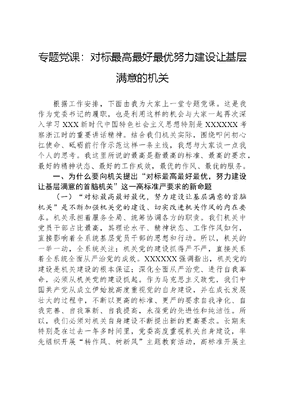 专题党课:对标最高最好最优努力建设让基层满意的机关根据工作安排,下面由我为大家上一堂专题党课。这是我作为党委书记的履职,也是利用这样的机会与大家一起再次深入学习XXX新时代中国特色社会主义思想特别是XXXXXX考察浙江时的重要讲话精神。结合我们机关实际,围绕叩问初心扛使命、砥砺前行作示范这样一条主线,我想与大家谈一点我个人的思考。我这里所说的最高是指最高的标准、最高的要求,最好的精神状态、最好的工作成效,最优的作风、最优的服务。一、为什么要向机关提出对标最高最好最优,努力建设让基层满意的首脑机关这一高标准严要求的新命题(一)对标最高最好最优,努力建设让基层满意的首脑机关是不断加强机关党的建设、切实改进机关作风的内在要求。机关承担着服务全局、统筹协调各方的职责。我们机关中党员干部占比最高,其理论水平、精神状态、工作作风如何,直接影响着全系统基层党员干部的思想和行动。所以,机关的一举一动,全系统关注;机关党的建设抓得严不严,直接关系着全系统全面从严治党的成效。XXXXXX强调指出,机关党的建设是机关建设的根本保证;深化全面从严治党、进行自我革命,必须从机关党的建设抓起。作为马克思主义政党,我们中国共产党从成立伊始就高度重视党的自身建设,并在成长发展壮大的过程中,不断以更高的标准、更严的要求自我净化、自我完善、自我革新、自我提高,永葆党的先进性和纯洁性。所以,我们必须对机关自身建设不断提出新的更高要求。长期来特别是在过去一年多时间里,党委高度重视机关自身建设,率先组织开展转作风、树新风主题教育活动,高标准开展主题教育,创新提出岗位就是责任、工作就要尽责一切围绕基层等新理念和快、实、高、严的工作新要求,推动广大机关同志提升服务基层意识,积极转变工作作风和方式方法,树立了机关的良好形象,受到了基层的广泛赞誉。但是,基层单位对我们机关的期盼要求也越来越高。我们必须要积极适应新任务新要求,呼应基层的新期盼,传承发扬我们党自我净化、自我完善、自我革新、自我提升的优良传统,不断加强和改进机关自身建设特别是党的建设,不断改进机关工作作风,切实战胜自己、提高自己、奋力前行。因此,我觉得有必要在快、实、高、严工作要求基础上,进一步拉高标杆,提出对标最高最好最优,努力建设让基层满意的首脑机关这一高标准严要求的新命题。(二)对标最高最好最优,努力建设让基层满意的首脑机关是积极担负起建设重要窗口新使命的必然要求XXXXXX在浙江考察时对浙江工作提出了努力成为新时代全面展示中国特色社会主义制度优越性的重要窗口的新目标新定位。建设重要窗口是我们浙江新的历史方位、新的努力方向,也是一项光荣的使命。建设重要窗口要展现全省域都是主角、全方位都要展示的姿态和担当,也就是要求我们每个单位、每个部门、每个人都要展示自己的小窗口,并把小窗口积极融入到全省的大窗口建设中去。我在传达省委全会精神时也专门强调,全系统上下都要以主角意识去建设好自己的小窗口。机关作为全系统的一个重要窗口,如何向全系统展示好自己的良好形象或者说美丽风景,我认为,必须要对标最高最好最优,努力让基层满意。如此,才能引领全系统上下切实把机关的职责和使命摆进去,积极担负起建设重要窗口的新使命,努力打造我们系统建设重要窗口的标志性成果,切实在全省重要窗口建设中展示好我们系统的小窗口。所以,我觉得有必要在这个时候,对机关提出对标最高最好最优,努力建设让基层满意的首脑机关的新命题。(三)对标最高最好最优,努力建设让基层满意的首脑机关是扎实推进治理体系和治理能力现代化的现实需要。我们系统在国家治理体系中发挥重要作用,是落实总体国家安全观、维护国家政治安全、确保社会大局稳定、促进社会公平正义、保障人民安居乐业的政治机关,必须把完善制度和提升治理能力作为重要举措和努力方向。机关作为全系统的首脑,在推进治理体系和治理能力现代化中理应发挥示范引领作用,这就要求我们机关工作人员不断提升管理服务能力。近年来,通过组织开展转作风、树新风强素质、树形象等活动,机关工作人员的管理服务能力确实得到了提升,内部管理体系也得到健全,较好发挥了机关的示范引领作用。但也要清醒认识到我们机关队伍中仍然存在个别同志能力不足、惯性思维严重、工作状态不佳、政治敏感性不强、纪律规矩意识不够等问题,与我们首脑机关的角色定位不相适应。因此,我觉得有必要提出对标最高最好最优,努力建设让基层满意的首脑机关的新命题,推动我们广大机关同志进一步统一思想认识,全面对标最高最好最优,奋力在扎实推进治理体系和治理能力现代化的过程中当好先锋、作好榜样。二、对标最高最好最优,努力建设让基层满意的首脑机关新命题下我们机关该怎么做对标最高最好最优,努力建设让基层