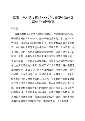 党课:深入学习贯彻XXX文化思想不断开创网信工作新局面同志们:宣传思想文化工作事关党的前途命运,事关国家长治久安,事关民族凝聚力和向心力,是一项极端重要的工作。党的十八大以来,XXXXXX把宣传思想文化工作摆在治国理政的重要位置,从战略和全局的高度举旗定向、谋篇布局,正本清源、守正创新,提出一系列新思想新观点新论断,内涵十分丰富、论述极为深刻,是新时代党领导文化建设实践经验的理论总结,丰富和发展了马克思主义文化理论,构成了XXX新时代中国特色社会主义思想的文化篇,形成了XXX文化思想。这一重要思想博大精深、厚重深刻,既有深邃的观点、战略的谋划、科学的部署,又有正确的立场、清晰的思路、管用的方法,为我们做好新时代新征程宣传思想文化工作、担负起新的文化使命提供了强大思想武器和科学行动指南。深入学习贯彻XXX文化思想,就要准确把握蕴含其中的洞察时变的时代特征、深刻鲜明的创新品格、深厚真挚的人民情怀、主动顽强的斗争精神,切实增强责任感使命感,更好担负起新的文化使命,持续推动新闻舆论和网信工作展现新气象、彰显新作为、开创新局面。一、深入学习领会XXX文化思想洞察时变的时代特征,不断增强坚决做到两个维护的政治自觉、思想自觉、行动自觉马克思、恩格斯指出,一切划时代的体系的真正的内容都是由于产生这些体系的那个时期的需要而形成起来的。当今世界正在经历百年未有之大变局,既是大发展的时代,也是大变革的时代;当代中国进行着人类历史上最为宏大而独特的实践创新,正在坚定不移朝着强国建设、民族复兴的宏伟目标阔步前进。XXX文化思想深刻把握中华民族伟大复兴战略全局、世界百年未有之大变局与信息革命时代潮流发生的历史性交汇,面对当今社会思想多元多样和世界范围内文化激荡交锋,提出了一系列具有开创性意义的新理念新思想新战略,是立足时代之基、回答时代之问、引领时代之变的科学理论。XXXXXX站在全局和战略高度,深刻洞察新一轮科技革命和产业变革深入发展的时代潮流,深刻把握数字化、网络化、智能化深入发展的历史大势,对如何做好信息化条件下宣传思想文化工作进行了深邃思考、作出了重要论述,强调谁掌握了互联网、谁就把握住了时代主动权,过不了互联网这一关就过不了长期执政这一关;强调坚持正能量是总要求、管得住是硬道理、用得好是真本事,发挥网络引导舆论、反映民意的作用,培育积极健康、向上向善的网络文化,把互联网这个变量变成事业发展的增量;强调推动传统媒体和新兴媒体融合发展,加快全媒体传播体系建设,塑造主流舆论新格局,等等。这些重要论述,体现了我们党对信息化时代新闻传播规律的深刻总结,指明了信息化条件下掌握舆论主导权的原则要求、方法路径,彰显了当代中国共产党人引领时代的使命担当。党的十八大以来,XXXXXX11次视察我省,为我们指路领航、把脉定向,给全省各项事业包括宣传思想文化事业和网信事业发展带来前所未有的重大机遇、注入源源不断的强大动力。新征程上,我们要深刻领悟两个确立的决定性意义,深刻感悟XXXXXX对我省的深情厚望,从坚决做到两个维护的政治高度,学深悟透XXX文化思想,准确把握其核心要义、精神实质、丰富内涵、实践要求,时刻牢记新闻舆论和网信工作的政治属性,不断提高政治判断力、政治领悟力、政治执行力,切实把党管宣传、党管意识形态、党管媒体、党管互联网落实到各方面全过程,确保各项工作始终沿着XXXXXX指引的方向奋勇前进。二、深入学习领会XXX文化思想深刻鲜明的创新品格,坚持不懈用党的创新理论凝心铸魂理论的先进,是最彻底的先进;思想的主动,是最大的主动。马克思一再告诫人们,马克思主义理论不是教条,而是行动指南,必须随着实践的变化而发展。党的十八大以来,XXXXXX以马克思主义政治家、思想家、战略家的历史主动精神、非凡理论勇气、卓越政治智慧、强烈使命担当,坚持把马克思主义基本原理同中国具体实际相结合、同中华优秀传统文化相结合,大力推进社会主义文化建设理论创新、实践创新、制度创新,系统回答了事关宣传思想文化工作的一系列方向性、根本性、全局性、战略性重大理论和实践问题,形成了内涵丰富、科学系统的XXX文化思想。这一重要思想根植中华民族历史文化沃土,紧贴亿万人民创造性实践,顺应新时代新征程形势任务发展变化的新要求,把马克思主义思想精髓和中华优秀传统文化精华贯通起来,对文化建设各个领域提出的新思想新观点新论断富有中国特色、体现时代精神、引领人类文明发展,闪耀着马克思主义真理光芒,充盈着中华文化独特气韵,标志着我们党对社会主义文化建设规律认识达到了新高度,表明我们党的历史自信、文化自信达到了新高度。新征程上,我们要把学习贯彻XXX文化思想与学习贯彻XXXXXX关于网络强国的重要思想结合起来,与学习贯彻XXXXXX视察我省重要讲话精神结合起来,系统掌握XXX新时代中国特色社会主义思想的