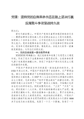 党课:坚持党的自我革命永远在路上坚决打赢反腐败斗争攻坚战持久战同志们:新时代新征程上,中国共产党肩负着更加艰巨的使命任务——要团结带领全国各族人民全面建成社会主义现代化强国、实现第二个百年奋斗目标、以中国式现代化全面推进中华民族伟大复兴。党的自我革命永远在路上,以自我革命引领社会革命,是百年大党的独有优势。借此机会,由我为大家作一堂廉政党课报告,与同志们共同交流。一、党的历史就是一部自我革命史XXXXXX明确指出:我们党继承和发展了马克思主义建党学说,形成了党关于自我革命的丰富思想成果。自我革命的勇气源于对真理的清醒认知,体现了中国共产党对马克思主义理论的继承和发展。中国共产党的百余年历史就是一部自我革命的历史。自1921年成立以来,中国共产党始终勇于自我革命、从严管党治党,通过自我革命解决了各种削弱党的纯洁性的问题,推动了党的事业全面发展。从1927年八七会议及时纠正陈独秀右倾机会主义错误、毛泽东提出枪杆子里出政权的著名论断,到1935年遵义会议结束了左倾教条主义错误、开始确立毛泽东在党内的领导地位,到延安整风运动、三反五反运动,再到党的十八大以来,党中央持续推进全面从严治党,强力开展反腐败斗争,党的自我革命一直在路上。勇于自我革命,是保持马克思主义政党先进性、纯洁性的必然要求。中国共产党能从最初只有50多名党员的弱党小党发展成为今天拥有9800多万名党员的大党强党,克服了一个又一个困难,取得了一个又一个辉煌成就,关键是因为党在推进社会革命的同时,不断进行自我革命。勇于自我革命是中国共产党区别于其他政党的显著标志,是党最鲜明的政治品格和强大的政治优势。特别是党的十八大以来,以XXX同志为核心的党中央把从严治党纳入四个全面战略布局,坚持严字当头、标本兼治,采取一系列横向到边、纵向到底的管党治党新举措,展现了前所未有的勇气和决心,全面从严治党取得显著成效,探索出了依靠党的自我革命跳出治乱兴衰历史周期率的第二个答案。全面从严治党是新时代党的自我革命的伟大实践,开辟了百年大党自我革命的新境界。在持续推进全面从严治党的过程中,我们党在政治、组织、思想、作风、纪律等方面存在的一系列问题得到了解决,无产阶级政党的政治本色得到了充分彰显,进一步巩固了无产阶级政党的执政地位。二、自我革命是巩固党的领导核心地位的必然要求(一)自我革命是巩固党的领导核心地位的根本保证。XXXXXX在党的XX大报告中明确指出:经过不懈努力,党找到了自我革命这一跳出治乱兴衰历史周期率的第二个答案。中国共产党的自我革命,就是要通过不断的自我净化、自我完善、自我革新、自我提高,经常并及时地解决自身存在的问题,克服自身存在的缺点,确保党始终保持生机活力。首先,自我革命是对马克思主义理论的继承和发展。马克思主义的理论品质和革命精神赋予了中国共产党自我革命的精神内核。马克思主义理论的革命性和战斗性,必然对无产阶级政党建设产生持久的影响。其次,自我革命是对中华优秀传统文化自省精神的进一步发展。中华优秀传统文化强调个人的自尊和自律,并逐渐发展形成了一系列自我反省和自我完善的方法。这些方法各不相同,但都强调自我反省和自我剖析是自我保护的重要方法,主张通过自省、自律、自强进行自我改造,其目的是实现人格的全面发展。中华优秀传统文化中的这些精华构成了中国共产党进行自我革命的思想来源和方法论基础。再次,自我革命是中国共产党在长期实践中形成的优良传统。中国共产党自成立之日起,就非常重视自我革命。在革命战争时期,毛泽东同志就倡导理论与实践相结合、密切联系群众、批评与自我批评相结合的工作作风,带领中国共产党在政治上、组织上、思想上、制度上逐步走向成熟。进入新时代,强调自我革命,是对当前世情国情党情的全面回应,也是对党加强自我革命这一优良传统的继承和发展。(二)自我革命是提高各级党组织凝聚力、战斗力的有效手段。党的力量来源于各级党组织,组织建设是党的建设的重要基础。自我革命是提高党组织凝聚力、战斗力的有效手段,是中国共产党对自身发展规律的深刻认识,也是中国共产党百余年来在实践中总结的重要经验。要提高各级党组织的凝聚力和战斗力,必须加强自我革命。一是通过自我革命来巩固党的组织。党的一切工作,要依靠坚强的组织来完成。中国共产党自成立以来,一直把党的支部建设放在重要位置,保证了党组织的严肃性和党的团结统一,为中国共产党的发展壮大打下了坚实的组织基础。二是通过自我革命保证党内监督的效果。党的十八大以来,中国共产党不断深入推进自我革命,以主动精神推动党的建设,加强对权力的制约和监督,确保其有效性,为纯洁党的组织、维护党的形象提供了有力保障。三是通过自我革命提高党组织的公信力。坚持党要管党,全面从严治党,是党的发展和党的建设的必由之路。中国共产党在长期的自我完善、自我革新过程中,获得了