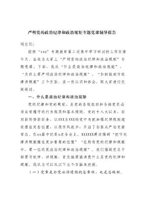 严明党的政治纪律和政治规矩专题党课辅导报告同志们:按照xxx专题教育第二次集中学习研讨的工作安排今天,由我为大家上严明党的政治纪律和政治规矩专题党课。下面,我从什么是政治纪律和政治规矩、为什么要严明政治纪律和政治规矩、如何做到守纪律讲规矩三个方面,谈一些认识和体会,同大家进行交流探讨。一、什么是政治纪律和政治规矩党的纪律和党的规矩,是党的各级组织和全体党员必须自觉遵守的行为规范和基本规则。党的十八大以来,面对新形势新任务,以XXX为XXX的党中央把加强纪律规矩建设摆在突出位置,以改作风起步,开启了全面从严治党新常态。在xx届中纪委x次全会上,XXXXXX再次强调把守纪律讲规矩摆在更加重要的位置在所有党的纪律和规矩中,第一位的是政治纪律和政治规矩。我们强调党员干部要守纪律、讲规矩,首先就要搞清楚什么是党的纪律和规矩。我认为可以从以下五个方面来把握。(一)党章是全党必须遵循的总章程,也是总规矩。XXXXXX就任后,公开发表的第一篇署名文章就是《认真学习党章、严格遵守党章》。他指出:党章是党的总章程,集中体现了党的性质和宗旨、党的理论和路线方针政策、党的重要主张,规定了党的重要制度和体制机制,是全党必须共同遵守的根本行为规范。没有规矩,不成方圆。党章就是党的根本大法,是全党必须遵循的总规矩。在中央纪委第二次全体会议上,XXX再次指出:每一个共产党员,特别是领导干部都要牢固树立党章意识,自觉用党章规范自己的一言一行,在任何时候都要做到政治信仰不变、政治立场不移、政治方向不偏。XXX的这些论述,深刻阐述了党章在党内生活、党的建设中的极端重要地位。党章是总规矩、总章程,主要体现在三个方面。第一它是全党整体意志的体现。党章内容包括党的活动和党的建设的基本规定,代表了全党的最高利益和最大利益,集中了全党的意志、信念和愿望。第二,它是党内的普遍行为规范。对党员权利和义务作出了明确规定,对党的制度各级党组织的行为规范、党的纪律作出了明确规定,是调解党内外各种关系的准则。第三,它是具有最高权威的党内法规。党章对党的性质、宗旨、指导思想、奋斗纲领和文可居文库——海量学习资料,手机电脑均可下载www.wenkeju.com重大方针政策作出了明确规定,是党举什么旗、走什么路的根本大法。我们党一成立,就高度重视党章建设。党的一大制定了党纲,党的二大制定了第一部党章,此后90多年奋斗历程中,我们党始终与时俱进,认真总结革命、建设、改革的成功经验,及时修改党章,把党的实践创新、理论创新制度创新的重要成果体现到党章中,使党章在推进党的事业、加强党的建设中发挥了重要指导作用。实践证明,什么时候全党同志认真学习党章、严格遵守党章,党内生活党的建设就正常,党的创造力凝聚力战斗力就强。所以说严明党的政治纪律政治规矩,首先就必须从遵守和维护党章入手。(二)党的纪律是刚性约束,是严于法律的基本准则党的纪律是执行党的路线、方针、政策的可靠保证,是维护党的团结统一的有力武器,是增强党的力量的重要手段。我们党是靠革命理想和铁的纪律组织起来的马克思主义政党,纪律严明是党的光荣传统和独特优势。邓小平同志反复强调,我们这么大一个国家,怎样才能团结起来组织起来呢,一靠理想,二靠纪律。XXXXXX在十八届中央纪委二次、三次全会上,就严明政治纪律和组织纪律做了文可居文库——海量学习资料,手机电脑均可下载www.wenkeju.com系统阐述,提出了明确要求,强调遵守党的纪律是无条件的,要说到做到。党的纪律严于国家法律。对此,王岐山同志有比较深刻的阐述,党是肩负神圣使命的政治组织,党员是有着特殊政治职责的公民。党规党纪是对党员的要求,严于国家法律对普通公民的要求。申请加入中国共产党,面对党旗宣过誓,就成了有组织的人,就意味着主动放弃一部分公民享有的权力和自由,就必须多尽一份义务,就要在政治上讲忠诚,组织上讲服从,行动上讲纪律。党的政治纪律和政治规矩内涵丰富,涵盖了党的活动的各个方面。我认为,其中最主要的是三种纪律规矩。一是政治纪律。这是第一位的纪律,其核心要义是做到五个必须:必须维护党中央权威,在任何时候任何情况下都必须在思想上政治上行动上同党中央保持高度一致;必须维护党的团结,坚持五湖四海,团结一切忠实于党的同志;必须遵循组织程序,重大问题该请示的请示,该汇报的汇报,不允许超越权限办事;必须服从组织决定,决不允许搞非组织活动,不得违背组织决定;必须管好亲属和身边工作人员,不得默许他们利用特殊身份谋取非法利益二是组织纪律。这是最根本的纪律,其核心要义是做到文可居文库——海量学习资料,手机电脑均可下载www.wenkeju.com四个服从,即个人服从组织,少数服从多数,下级服从上级,全党服从中央。90多年来,我们