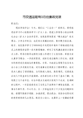 市交通运输局3月份廉政党课同志们:现在开始开会!今天,我们以三会合一的形式,将党组理论学习中心组集体学习(扩大)会、党建工作领导小组会和局长办公(扩大)会合并召开,这既是贯彻落实精文减会有关要求,少开会开短会;也是给大家腾出时间,集中精力抓发展。刚才,我们集中学习了XXXXXX在中央党校中青年干部培训班开班式上的重要讲话等一系列重要精神,研究了党风廉政建设方面有关工作,局各位领导也围绕当前工作进行了汇报安排,希望大家认真学习领会,一并抓好落实。到市交通运输局工作以来,我深切的感受到交通地位的重要性,市委、市政府主要领导在全市大会小会上多次提及交通,对交通事业发展提出了殷切要求,也对我本人提出了谆谆教诲。为尽快进入角色、熟悉情况,近期我先后到几个局直单位开展调研,对各单位的工作有了基本了解;连续跑了几个县市区,对全市重点交通项目实现个个走到。在调研的过程中,一方面我感受到了全局上下浓厚的干事创业氛围,对事业尽职尽责、尽心尽力;另一方面也发现了不少突出问题和短板,亟需尽快补齐短板、加速拼超。借此机会,我结合这段时间的感受感悟讲几点意见,既是交心谈心,也算作上一堂廉政党课与大家共勉。一、要旗帜鲜明讲政治,全面增强坚持两个确立、做到两个维护的高度自觉讲政治是做好一切工作的根本前提,是强化党的领导、维护党的权威、实现经济社会持续健康发展的政治保障,必须把讲政治贯穿于交通运输事业发展的全过程各环节,体现在毫不动摇的坚持党的领导中,体现在扎实推进党的建设中,体现于党员干部履职尽责的具体言行中。(一)信仰上要绝对忠诚。讲政治的核心是要坚定正确的政治方向和政治立场,系统广大党员干部要始终保持对党绝对忠诚的政治品格,真正把两个维护作为最高政治原则和根本政治规矩,把两个确立内化于心、外化于行,用实际行动锻造忠诚品格。要坚持读原著、学原文、悟原理,用XXX新时代中国特色社会主义思想凝心聚魂,提高驾驭复杂局面、处理复杂问题的本领,努力做到学思用贯通、知信行统一。要牢记国之大者,时刻把握XXXXXX和党中央在关心什么、强调什么,国家需要我们做什么、我们能为国家做什么,自觉把两个维护体现在贯彻党中央决策部署的行动上,体现在履职尽责、做好本职工作的实效上,体现在日常言行上,既为一域争光、又为全局添彩。(二)行动上要团结担当。团结与否是衡量一个领导班子整文可居文库——海量学习资料,手机电脑下载www.wenkeju.com体素质的重要标志,是领导班子建设的命根子。懂团结是真智慧,想团结是真境界,会团结是真本领,护团结是真觉悟。讲团结,就要一切从有利于工作的角度出发,相互间增进理解、相互包容。在工作生活中,相互支持、彼此帮助、通力合作,营造充满活力、同频共振的良好局面。要有海纳百川的胸怀格局,要客观公正公平对待和包容同志,不要斤斤计较。团结最能看出一个人的人品胸怀,团结的目的不是当好好先生,君子和而不同,不敢斗争、不能批评,一团和气的团结是伪团结,是有损我们事业的。讲担当,就是要面对大是大非敢于亮剑、面对矛盾敢于迎难而上、面对危机敢于挺身而出、面对失误敢于承担责任面对歪风邪气敢于坚决斗争。勇于担当不是让同志们去犯错误,而是在政策法律法规允许的范围内寻求解决问题的办法;担当不是要求同志们蛮干,而是艺高人大胆,充满智慧性,把要事难事巧干成功。XXXXXX说:当干部就要有担当,有多大担当才能干多大事业,尽多大责任才会有多大成就。作为市直交通运输系统的关键少数,局领导班子和各单位一把手要坚持抓本级带下级,形成一级做给一级看、一级带着一级干的良好氛围。要坚持真抓实干、埋头苦干,面对改革发展稳定的艰巨任务,敢于挑最重的担子、啃最硬的骨头,不为困难找借口、多为成功想办法。文可居文库——海量学习资料,手机电脑下载www.wenkeju.com(三)操守上要廉洁自律。一个人廉洁自律不过关,做人就没有骨气,做事就不硬气,这是千古不变的道理。自律是一种定力,心有定力,能抵御诱惑;身有定力,能笃定守志;行有定力能心静身安。一个人要自律,最重要的是要做到慎初、慎微、慎独,这是洁身自好的紧箍咒,是检验一个人的修养,考验一个的定力和意志力的试金石。所以,大家一定要坚持以更高的思想道德境界、更严的纪律标准要求自己,带头落实中央八项规定精神,严守党的纪律规矩,抵得住诱惑。要时刻把法律的戒尺、纪律的戒尺、制度的戒尺、规矩的戒尺、道德的戒尺牢记于心,做到心有所戒、行有所止,永葆清正廉洁的政治本色。二、要持之以恒转作风,切实营造追求高线不碰红线守住底线的清朗风气作风保证是落实的前提,有什么样的作风,就有什么样的工作成效。面对新形势新任务,如何让市委市政府放心,向全市人民交上一份满意的交通答卷?需要我们以铁的作风来回