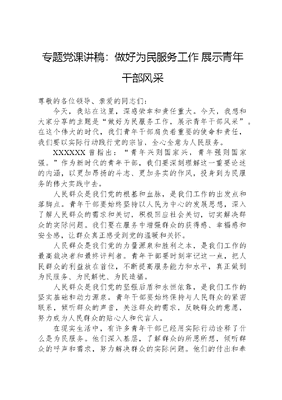 专题党课讲稿:做好为民服务工作 展示青年干部风采尊敬的各位领导、亲爱的同志们:今天,我站在这里,深感荣幸和责任重大。今天,我想和大家分享的主题是做好为民服务工作,展示青年干部风采。在这个伟大的时代,我们青年干部肩负着重要的使命和责任,我们要以实际行动践行党的宗旨,全心全意为人民服务。XXXXXX曾指出:青年兴则国家兴,青年强则国家强。作为新时代的青年干部,我们要深刻理解这一重要论述的内涵,以更加昂扬的斗志、更加务实的作风,投身到为民服务的伟大实践中去。人民群众是我们党的根基和血脉,是我们工作的出发点和落脚点。青年干部要始终坚持以人民为中心的发展思想,深入了解人民群众的需求和关切,积极回应社会关切,切实解决群众的实际问题。我们要在服务中增强群众的获得感、幸福感和安全感,让群众真正感受到党的温暖和关怀。人民群众是我们党的力量源泉和胜利之本,是我们工作的最高裁决者和最终评判者。青年干部要时刻牢记这一点,把人民群众的利益放在首位,不断提高服务能力和水平,真正做到为民服务、为民解忧、为民造福。人民群众是我们党的坚强后盾和永恒依靠,是我们工作的坚实基础和动力源泉。青年干部要始终保持与人民群众的紧密联系,倾听群众的声音,关注群众的需求,反映群众的意愿,努力成为人民群众的贴心人和代言人。在现实生活中,有许多青年干部已经用实际行动诠释了什么是为民服务。他们深入基层,了解群众的所思所想,倾听群众的呼声和需求,努力解决群众的实际问题。他们的付出和奉献,赢得了群众的信任和赞誉,也为我们树立了榜样。比如,有的青年干部主动放弃城市的舒适生活,选择到偏远地区支教,用知识和爱心点亮了孩子们的未来;有的青年干部在抗疫一线冲锋在前,舍小家顾大家,为守护人民的生命安全和身体健康做出了巨大贡献。这些青年干部的风采,是我们学习的榜样。然而,我们也要清醒地看到,在为民服务的过程中,我们还存在不少问题和不足。有些青年干部服务意识不强,工作态度不够端正,对待群众的问题漠不关心、推诿扯皮;有些青年干部能力不足,难以胜任为民服务的重任,缺乏解决问题的能力和方法。这些问题和不足,严重影响了我们为民服务的效果和形象,需要我们认真反思和改进。 那么,如何提升我们为民服务的能力和水平呢?一是要加强学习,不断提高自身素质。只有不断学习,才能跟上时代的步伐,掌握新的知识和技能,更好地为群众服务。其次,要深入基层,了解群众的需求。只有深入基层,才能真正了解群众的所思所想,找到解决问题的办法。历史上涌现出无数为民服务的英雄人物和先进事迹。比如焦裕禄同志,他在兰考县工作期间,面对自然灾害和严重困难,带领全县人民战天斗地、艰苦奋斗,展现了共产党人为民服务的崇高精神和无私奉献的优秀品质。焦裕禄同志的事迹激励着我们青年干部要始终坚守人民立场,把人民放在心中最高位置,用实际行动践行党的宗旨。二是要增强服务意识,积极回应群众关切。青年干部要始终坚持以人民为中心的发展思想,把群众的需求和关切作为工作的出发点和落脚点。要增强服务意识,主动为群众排忧解难,切实解决群众的实际问题。同时,要积极回应社会关切,关注群众的意见和建议,不断改进工作方法和作风,提高服务质量和效率。例如,我们可以通过开展青年干部为民服务月等活动,组织青年干部深入基层、深入群众,了解他们的生产生活情况,倾听他们的心声,帮助他们解决实际困难。通过这样文可居文库——海量学习资料,手机电脑均可下载www.wenkeju.com的活动,我们可以让青年干部更加深入地了解人民群众的需求和关切,增强他们的服务意识和能力。三是要加强团结协作,形成工作合力。俗语说:人心齐,泰山移。在为民服务的道路上,我们要加强团结协作,形成工作合力,共同为人民群众创造更加美好的生活。青年干部要发扬团结协作的精神,互相学习、互相支持、互相配合,共同面对困难和挑战。只有团结一心、齐心协力,我们才能更好地为人民群众服务,实现我们的共同目标。从历史中我们可以看见:秦朝的灭亡很大程度上是因为内部官员之间的争斗,导致了民不聊生,最终加速了国家的衰败,相反,唐太宗时期,由于官员们团结一致,共同努力,创造了贞观之治的盛世。无数伟大的事业都是在团结协作中取得成功的。中国共产党领导的新民主主义革命、社会主义建设和改革开放,都是在全党全军全国各族人民的团结奋斗中取得胜利的。这充分说明了团结协作的重要性。作为新时代的青年干部,我们要继承和发扬这种团结协作的精神,为实现中华民族伟大复兴的中国梦贡献自己的力量。四是要坚持创新,不断提升服务质量。在新的时代背景下,为民服务的方式和手段也需要与时俱进,不断创新。青年干部要敢于尝试新的思路和方法,善于运用现代科技手段提高服务质量。比如,我们可以利用大数据、云计算等技术手段,对群众的需求进行精准分析,提供更加个性化的服务。同时,我们还