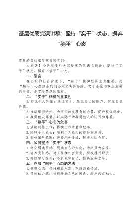 基层优质党课讲稿:坚持实干状态,摒弃躺平心态尊敬的各位基层党员同志们:大家好!今天我要和大家分享的党课主题是:坚持实干状态,摒弃躺平心态。一、引言在当前的社会背景下,实干精神显得尤为重要。而躺平心态则是我们必须坚决摒弃的。实干是推动事业发展的关键,是实现梦想的基石。二、实干精神的重要性1.实现个人价值:通过实干,展现自己的能力,实现自我价值。2.推动组织进步:为组织的发展贡献力量,促进整体进步。3.赢得他人尊重:以实际行动赢得他人的认可和尊重。三、躺平心态的危害1.消极对待工作:影响工作质量和效率。2.阻碍个人成长:限制个人能力的提升和发展。3.影响团队氛围:传播消极情绪,破坏团队合作。四、如何坚持实干状态1.树立明确目标:明确自己的方向,为之努力奋斗。2.培养责任感:对工作和社会负责,积极履行职责。3.持续学习提升:不断充实自己,提高业务水平。五、克服躺平心态的方法1.调整心态:保持积极乐观,克服消极情绪。2.寻找动力源:找到激励自己的因素,激发内在动力。3.制定行动计划:有步骤地推进工作,避免无所事事。六、实干的具体体现1.勇于担当:在困难面前不退缩,敢于承担责任。2.勤奋努力:付出更多的努力,追求卓越。3.注重细节:做好每一个环节,确保工作质量。七、基层党员的实干案例分析通过实际案例,分析基层党员如何在工作中发挥实干精神,取得优异成绩。八、培养实干文化的建议1.建立激励机制:鼓励实干,表彰优秀表现。2.加强教育培训:提升党员的实干能力和意识。3.营造良好氛围:倡导实干风气,形成积极向上的工作环境。九、总结与展望坚持实干状态,摒弃躺平心态,是我们基层党员的责任和使命。让我们以实际行动,为基层事业的发展贡献自己的力量。谢谢大家!文可居文库——海量学习资料,手机电脑均可下载www.wenkeju.com