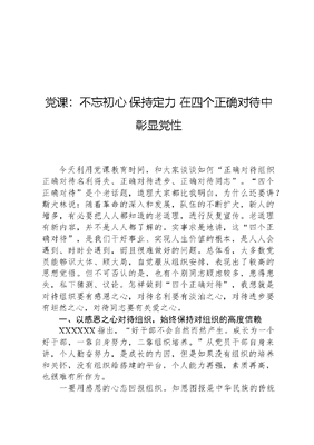 党课:不忘初心 保持定力 在四个正确对待中彰显党性今天利用党课教育时间,和大家谈谈如何正确对待组织正确对待名利得失、正确对待进步、正确对待同志。四个正确对待是个老话题,道理大家都比我明白,为什么还要讲?斯大林说:随着革命的深入和发展,队伍的不断扩大,新人的增多,有必要把人人都知道的老道理,进行反复宣传。老道理有新内容,并不是人人都了解的。实事求是地讲,这四个正确对待,是我们干好事业、实现人生价值的根本,是人人会遇到、时时会遇到,而且很难做好的问题。总体看,大多数党员能够识大体、顾大局,自觉服从组织安排,表现出了较高的思想觉悟。但不可否认的是,也有个别同志顾虑较多,患得患失,私下猜测、议论。怎样做到四个正确对待,我想就是对待组织要有感恩之心,对待名利要有淡泊之心,对待进步要有坦然之心,对待同志要有关爱之心。一、以感恩之心对待组织,始终保持对组织的高度信赖XXXXXX指出,好干部不会自然而然产生。成长为一个好干部,一靠自身努力,二靠组织培养。从党员干部自身来讲,个人勤奋努力,是成长的内因,但是如果没有组织的培养和关怀,没有组织给搭建的平台,个人能力再强,素质再高,也很难有所作为。一要用感恩的心态回报组织。知恩图报是中华民族的传统美德。大家可以回顾一下我们每个人的成长经历,我们许多人都是从一名普通青年,成长为今天的党员领导干部的,可以说,没有组织,就没有我们现在的生活。然而实际中,个别同志有时看不到这一点,比如,在个人成长进步上,总认为是自己努力奋斗的结果,与组织的培养没有多大关系;进步慢了,个人要求没有得到满足,就觉得组织亏欠了自己;有的尽管在个人进步上收获了很多,但横攀竖比总认为组织给予自己的还不够,甚至埋怨、闹情绪等等,这些都是对党组织缺乏感激之情、感恩之心的表现。工作中,我们不能只向组织伸手,更要想想我们给组织回报了什么,给单位建设贡献了什么。明成祖朱元璋在一次打仗时被困,一连几天都没有吃东西,差一点饿死,是一位老妇人给他吃了一碗饭,救了他的命。对此,他一直感激于心,当了皇帝以后还专程去看望老妇人,可谓是不忘一饭之恩。我们作为一名党员,受组织的恩情可以说远远大于一饭之恩,更应该懂得感恩图报。作为一名党员,我们都要强化组织意识、党性意识,多想想组织对自己的培养,多体谅体谅组织的难处,多为组织分忧,以听从安排的实际行动回报组织。这样,我们对组织就能多一些服从需要,少一些斤斤计较;多一些尊重理解,少一些牢骚埋怨。二要用求真的信念信任组织。过去有些同志信奉提拔靠关系、当官靠活动,所以一到干部调整、一有位置空缺的时候,便到处托关系、找门路。党的十八大以来,大气候越来越好,小环境越来越严,风清气正、生态良好。这几年我们在风气建设、选人用人上的公开公正,大家也有切身体会。作为一名党员,心理要健康,心态要阳光,相信组织一定会严格按原则办、按政策办、按规矩办、按程序办,用好机制选拔好干部,用好作风使用好干部;相信组织一定会充分考虑大家想进步、想发展的良好意愿,反复酝酿,权衡利弊,最大限度盘活现有资源,做到人岗相适、人尽其才。三是以大局利益为重服从组织。干部的选拔、任用和调配文可居文库——海量学习资料,手机电脑均可下载www.wenkeju.com具有很强的政策性和导向性,必须按照政策法规来办,结合实际情况来调,根据岗位需要来选,离开了这些去搞个人设计,结果只能是期望值越高、失落感越强。作为一名党员,你只管干好自己的工作就行了,至于你的成长进步,组织上会考察,也会从单位建设大局考虑,群众也自有公论,党委在选人用人上,是根据岗位需要和个人优长而定的,是在广泛听取群众意见的基础上,慎重考虑研究决定的,也是经得起群众监督和历史检验的,不是说谁想干啥就干啥,谁想进步就进步,这些都是不以个人的意志为转移的,组织会对每名同志的成长进步高度负责,做出公正合理的安排。二、以淡泊之心对待名利,始终保持阳光健康的好心情这里有个小故事,乾隆皇帝有一次南巡,住在金山寺,一天和方丈到江边散步,乾隆见江上百舸争流,便问方丈:你可知江上船有几艘?方丈从容回答两艘而已。乾隆笑道:这江上的船往来如织,怎么只有两艘呢?方丈答到:我只看见一艘为名,一艘为利。乾隆听后点头称赞。现实生活中,名利也往往伴随着我们一生。如何正确对待名利得失,我们常说,平平淡淡才是真。甘于平淡,是人生追求的境界,也是履行宗旨的根本要求。一要懂得知足,始终如一干工作。有人说:得之,我幸;不得,我命。如此而已。该是你的别人抢不去,不是你的也争不来。有这样的心态,才能处在一种智慧状态。现在我们的物质待遇与过去相比有了很大提高,我们应当感到知足。我看过这么一个故事:一个农民想要一块土地,去求地主。地主说:你从这里往外跑,每跑一段就插上一根竹竿,太阳落