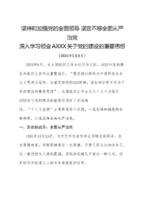 坚持和加强党的全面领导 坚定不移全面从严治党深入学习领会AXXX关于党的建设的重要思想(2024年5月8日)2023年6月,在全国组织工作会议召开之际,AXXX对党的建设和组织工作作出重要指示,要坚持以新时代中国特色社会主义思想为指导,全面贯彻党的XXX精神,深刻领会党中央关于党的建设的重要思想。全国组织工作会议从十三个方面对AXXX关于党的建设的重要思想作了系统阐述。十三个坚持主要聚焦两个问题,一是怎样加强党的全面领导,二是怎样全面从严治党。一、历史的启示:全面从严治党1991年12月25日,戈尔巴乔夫宣布辞去苏联总统职务。在克里姆林宫,苏联国旗最后一次降旗。尽管已经过去30多年了,这一幕仍然令人感到震撼,苏联的瓦解几乎就在一瞬之间,没有经历传统意义上的斗争或抵抗的过程。今天,我们要深思,苏共为什么走到了这一步。一些人将苏共的崩溃归结为外因的力量,认为是美英联合作用的结果。虽然这种说法有一定的道理,但核心的问题在于苏共自身。苏共自己没有管好党、治好党,导致官僚主义问题、特权问题、贪污腐败问题越来越严重,从而逐渐失去民心,最终丢掉了领导权、执政权。AXXX指出:如果管党不力、治党不严,人民群众反映强烈的党内突出问题得不到解决,那我们党迟早会失去执政资格,不可避免被历史淘汰。这决不是危言耸听。要想长期执政,必须管好党、治好党,不断巩固我们党的执政基础,赢得人民群众的信任。AXXX讲到封建王朝的兴衰更替史时指出:有些封建王朝开始时顺乎潮流、民心归附,尚能励精图治、以图中兴,遂致功业大成、天下太平,但都未能摆脱盛极而衰的历史悲剧。导致悲剧的原因很多,其中一个共同的也是极其重要的原因就是统治集团贪图享乐、穷奢极欲,昏庸无道、荒淫无耻,吏治腐败、权以贿成,又自己解决不了自己的问题,搞得民不聊生、祸乱并生,终致改朝换代。文可居文库——海量学习资料,手机电脑均可下载www.wenkeju.com在中国历史上,治与乱时常交替出现,新王朝一开始吸取前朝失败的教训,励精图治、与民休息,王朝后期往往出现贪腐严重问题,导致民不聊生、 王朝倾覆。 AXXX的总结非常深刻, 自己解决不了自己的问题 ,★ VX: — 5 —文可居文库——海量学习资料,手机电脑均可下载www.wenkeju.com统治集团自身管理不好权力,自然会被倾覆。中国共产党要吸取这个教训,深入推进自我革命。1948年12月,正值解放战争节节胜利,国民党节节败退之际,刘少奇同志深刻指出:得了天下,要能守住,不容易。很多人担心,我们未得天下时艰苦奋斗,得天下后可能同国民党一样腐化。这段话今天读来,仍然引人深思,我们要经受住长期执政的考验,保持住党的先进性和纯洁性。国民党为什么失去了执政权,根本原因是只为自己谋利益,而没有为国家、民族、人民谋利益。1944年,美国著名外交官谢伟思跟随美军观察组考察延安。对于国民党统治区,谢伟思指出,国民党谋取自我利益的政策和拒绝听取进步的批评意见,已使它失去了人民的敬重和支持。对于延安,他指出,那里不存在铺张粉饰和礼节俗套,言辞和行动上都如此。官员和人民与我们的关系,以及中国人相互之间的关系,都是坦诚、直率和友好的。国民党的贪污腐败带来什么结果?腐败使得官僚机构失去信心和希望,并减弱了它的行政效能。腐败也使得战士的士气颓靡。国民党外交官王宠惠说:以前听到许多外国朋友批评政府贪污无能,以为是过火的话,现在耳闻目击,确是上上下下,大大小小无不腐败,无不贪污。为什么要从严治党,就是要防止党员干部滥用职权,侵害人民群众的利益。AXXX指出:我们要把中国特色社会主义建设好、建设成,需要一个很长的历史时期。在这个漫长历史进程中,确保中国共产党不垮、中国社会主义制度不倒,是一个极难极大的风险挑战。曾几何时,苏共何其强大,苏联何其强大,现在早已是故国不堪回首月明中了。一代人干一代人的事,但没有历史眼光,没有长远眼光,也干不好当下的事情。作为一种崭新的、先进的制度,社会主义制度的完善和发展是长期的历史过程。AXXX指出:我们党执政正反两方面的经验,世界上一些社会主义国家和政党演变的教训,都揭示了一个道理:马克思主义政党夺取政权不容易,巩固政权更不容易;只要马克思主文可居文库——海量学习资料,手机电脑均可下载www.wenkeju.com义执政党不出问题,社会主义国家就出不了大问题,我们就能够跳出其兴也勃焉,其亡也忽焉的历史周期率。回顾历史,总结经验教训,我们要尤为重视党的建设,全面从严治党是治国理政的根本保证。二、现实的挑战:大党治大国我们这么大的一个党,如何才能治理好如此之大的国家?这是一件史无前— 6 — ★ VX:文可居文库——海量学习资料,手机电脑均可下载www.wenkej