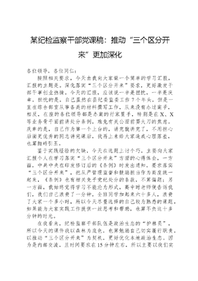 某纪检监察干部党课稿:推动三个区分开来更加深化各位领导,各位同仁:按照相关要求,今天由我向大家做一个简单的学习汇报,汇报的主题是。深化落实三个区分开来要求,更好激发干部干事创业热情。今天的汇报,应该说一半是担忧,一半是庆幸。担忧的是,自己虽然在县纪委监委工作7个年头,但是一直在综合部室从事各类的材料撰写工作,从来没有办过案子,相反,在座的各位领导都是办案的行家里手,特别是在X、X等业务骨干面前讲处分条例,难免有关公面前耍大刀的焦虑。庆幸的是,自己作为第一个上台的,讲完就讲完了,不用担心后面更优秀的同志讲完课后,我再上来给大家造成心理落差,也算抛砖引玉。鉴于实践经验的欠缺,今天在选题上讨个巧,主要向大家汇报个人在学习落实三个区分开来方面的心得体会,一方面,中共中央在印发修订后的《条例》时发出通知,要求落实三个区分开来,把从严管理监督和鼓励担当作为高度统一起来,《条例》也有相关免予党纪处分的条款,不算偏题;另一方面,我始终觉得学习不能沦为形式,高中时老师便告诉我们,我们自己浪费了一分钟,全班同学加起来六十多人,浪费了大家一个多小时,所以今天尽量选择的自己较为熟悉的课题,如果能为大家实践工作提供一丝思考和帮助,也算不负这十多分钟的时光。在我看来,纪检监察干部队伍是政治生态的护林员,所以今天的课件我以森林为底色,也算勉励自己切实履行职责,以推动三个区分开来为契机,更好优化本地政治生态。因为是内部交流,且时间要求在15分钟左右,所以主要以我们实际工作为主,没有很多高深的理论和各种高大上的理论,主要围绕学习的三个方面来说。一是三个区分开来怎么看,二是三个区分开来实践的问题和原因粗析,三是如何在深化三个区分开来上着力。一、如何认识三个区分开来的必要性三个区分开来指的是干部在推进改革过程中,由于缺乏经验和先行先试而出现的失误和错误,与明知故犯的违纪违法行为区分开来;在上级尚未明确限制的探索性试验中出现的失误和错误,与上级明令禁止后依然我行我素的违纪违法行为区分开来;为推动发展而无意中造成的过失,与为谋取私利而故意进行的违纪违法行为区分开来。个人理解,其实就是要认真区分干部出现的失误和错误是否存在,出发点是为推动发展,但没有经验可以借鉴,大胆探索作出的法律法规没有明确禁止的行为。在我看来,怎么看的问题,主要落脚点是看是否迫切需要即有没有用、要不要用的问题。唯有深化思想认识、增强思想认同,才能切实增强使用的自主性,主要体现在三个方面。一是从上级要求来看,三个区分开来是全面从严治党的政治原则。三个区分开来最早来源于2016年1月18日,XXXXXX在省部级主要领导干部学习贯彻党的十八届五中全会精神专题研讨班上的讲话,此后党的多个法规文件载入这一政治原则,并以制度规范加以固化。2020年,党中央印发修订后的《中国共产党党员权利保障条例》,以制度的形式将三个区分开来要求予以明确。此后,中央纪委、省纪委均出台容错纠错工作办法,为深入贯彻落实XXXXXX关于三个区分开来重要要求提供政策依据、提出明确要求。除了党委部门有要求,纪委也有相关的要求,比如在今年二十届中央纪委三次全会上,李希书记作工作报告提出,要推动三个区分开来具体化、规范化,依法依规严肃查处诬告陷害行为,促进文可居文库——海量学习资料,手机电脑均可下载www.wenkeju.com党员干部廉而有为、勤勉敬业,促进全党既有秩序又有活力。可以说,三个区分开来已经成为我们党在坚定推进全面从严治党过程中形成的重要政治原则和实践的要求。二是从纪委职责来看,三个区分开来是纪检监察工作的重要政策。政策是为了实现党和国家中心任务而制定的行动依据和准则,讲求政策始终是纪检监察机关的重要工作原则,新中国第一任中央纪委书记朱德就强调,提出和处理别人的问题时,一定要有根据、要慎重。进入新征程,中央纪委国家监委把正确运用政策摆在突出位置来抓,李希书记多次强调,要加强政策引导,明确政策导向。刘金国同志也反复强调,有政策而不大胆研究使用,也是不担当的表现。当前,三个区分开来已经形成制度性要求,是摆在明面上的政策,纪检监察机关必须秉承惩前毖后治病救人的理念,推动三个区分开来落地落实。三是从现实需要来看,三个区分开来是激发干部担当的有效策略。相比政策,策略是为了实现党和国家中心任务而使用的方法和手段,正确的政治路线需要政策的政策策略。一方面,干事创业,干部是核心,但从我国目前的情况来看,受成长经历、社会环境、政治生态等多方面影响,有的干部能力不足不能为、有的干部动力不足不想为、有的干部担当不足不敢为。XXXXXX指出,一些干部为官不为已经成为一个突出问题,各级党委要不等不拖、辩证施策,争取尽快扭转。另一方面,当前中国正坚持以高质量发展为