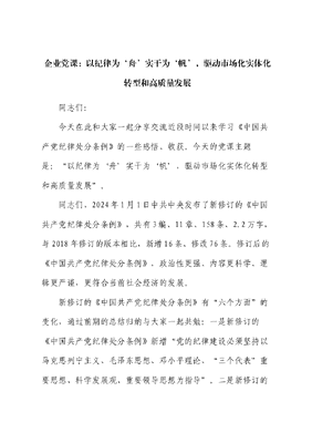 企业党课:以纪律为舟实干为帆,驱动市场化实体化转型和高质量发展同志们:今天在此和大家一起分享交流近段时间以来学习《中国共产党纪律处分条例》的一些感悟、收获。今天的党课主题是:以纪律为舟实干为帆,驱动市场化实体化转型和高质量发展。同志们,2024年1月1日中共中央发布了新修订的《中国共产党纪律处分条例》,共有3编、11章、158条、2.2万字,与2018年修订的版本相比,新增16条、修改76条。修订后的《中国共产党纪律处分条例》,政治性更强、内容更科学、逻辑更严谨,更符合当前社会经济的发展。新修订的《中国共产党纪律处分条例》有六个方面的变化,通过前期的总结归纳与大家一起共勉:一是新修订的《中国共产党纪律处分条例》新增党的纪律建设必须坚持以马克思列宁主义、毛泽东思想、邓小平理论、三个代表重要思想、科学发展观、重要领导思想为指导。二是新修订的《中国共产党纪律处分条例》新增坚决维护党的权威和集中统一领导。三是新修订的《中国共产党纪律处分条例》对主要领导责任、重要领导责任、直接责任进行了区分。四是新修订的《中国共产党纪律处分条例》将监督执纪分为四种形态,即,让红红脸、出出汗成为常态;使党纪轻处分和组织处理成为大多数;对严重违纪的重处分、作出重大职务调整是少数;对严重违纪涉嫌违法立案审查的是极少数。五是新修订的《中国共产党纪律处分条例》规定了五种加重处分的情形,即,强迫、唆使他人违纪;拒不上交或者退赔违纪所得;违纪受处分后又因故意违纪应当受到党纪处分;违纪受到党纪处分后,又被发现其受处分前的违纪行为应当受到党纪处分;党内法规规定的其他从重或者加重处分情形。六是新修订的《中国共产党纪律处分条例》进一步明确了违反政治纪律部分、违反组织纪律部分、违反廉洁纪律部分、违反群众纪律部分、违反工作纪律部分等内容。通过学习《中国共产党纪律处分条例》结合市场化实体化转型和高质量发展实际,我有三点感悟。一、在懂纪中,坚定信仰。党纪是一把戒尺,用好用实戒尺的前提是学好党章党规,学懂弄通。作为一名党员,在党纪学习教育中要逐章逐条学纪,原本本学习、逐字逐句研读,才能养成遵规守纪的自觉。要落实好带着问题学、结合实际学、全面系统学在学懂弄通上下真功夫、花大气力。始终保持求知若渴的学习态度,沉心静气、细嚼慢咽、熟记于心,真正学出实效,悟出新得,在自省自警中做思想上的明白人。在懂纪中,补足党纪党规党章的精神之钙,让自己充充电,强化坚守初心,牢记使命的行动自觉;市场化实体化转型和高质量发展工作中,戴好党纪紧箍咒时刻保持清醒的头脑、坚定的理想、高尚的品行,不断提高自身的个人素养和业务能力,用自身党纪学习教育成效不断检验工作成效。二、在守纪中,严格规矩。守纪是党员的根本和要求,要始终把学纪、知纪、明纪、守纪当终身课题,学深学透,熟知于胸、铭记于心、镶嵌于行。聚焦以学促做切实做到学在实处、想在实处、干在实处。把纪律、规纪挺在前面,发现问题及时纠正,触犯纪律立即处置,全面构筑防止小错酿成大错、违纪行为恶化为违法犯罪体系。作为党员要以身作则,自己严守规矩,当好遵守党纪的领头羊,严格要求自己做到四个一样(即,台上台下一个样、人前人后一个样、八小时内外一个样、有没有监督一个样)。党员干部既是党纪维护者、执行者也是党纪的监督者。党员干部要始终把党纪内化于心、外化于行,用党纪指导工作、指导实践。三、在用纪中,自我约束。知底线而不越红线、知规矩而不坏规矩。学会在工作中用纪严格按照规矩办事、按党纪管人,方能促进工作提质增效。俗话说,管人者先自管强调的是自我约束,由此可以看出用纪必须要有坚定的自我约束定力。作为一名党员要做到在党纪面前不越雷池,要知行知止、令行禁止,以廉者不求非其有,智者不为非其事为底线和要求,不搞团团伙伙、不立小山头、不拉小圈子、遵循组织程序、遵守组织纪律、遵照组织原则,在用纪中,增强自我约束的自觉性,明确行为的界限和底线。学习《中国共产党纪律处分条例》的关键在于思考的深度,关键要看学了之后结合综合保障服务工作思考了什么,对今后工作开展的实际指导作用和意义。同志们,我们不能有打好一仗就一劳永逸的想法,不能有差不多了、该松口气、歇歇脚的想法和思想。要在遵守党纪党规上做好表率、带好头,以身作则,千万不要以为腐败很远,一旦放松了警惕,就可能走上腐败的道路;要始终保持全面从严治党永远在路上,永不停歇的干劲,持续营造风清气正、干事创业、艰苦奋斗的良好氛围。对此我有三点收获和大家一起分享、交流。一是思想方面。党员干部要始终牢记初心使命,不断淬炼党性修养和道德涵养,工作中、生活中,树立正确的世界观、人生观、价值观和权力观、利益观,始终保持全心全意为人民服