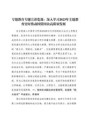 专题教育专题宣讲党课:深入学习2023年主题教育更好推动国资国企高质量发展在全党深入开展学习贯彻XXX新时代中国特色社会主义思想主题教育,是党中央为全面贯彻党的XX大精神、动员全党同志为完成党的中心任务而团结奋斗所作的重大部署,是深入推进新时代党的建设新的伟大工程的重大部署。国有企业作为经济社会发展的排头兵、顶梁柱、压舱石,扛起高质量发展大旗责无旁贷更应该在主题教育中把高标准树立起来,把严要求落实下去,自觉在主题教育中当先锋、做表率。要持续不断用XXX新时代中国特色社会主义思想凝心铸魂,始终坚持工作正确政治方向,以高度的政治自觉、饱满的政治热情、严肃的政治态度,把主题教育与推动业务结合融合,统筹谋划、一体推进,作为干部接受思想淬炼和精神洗礼、锤炼过硬政治品格、强化始终对党忠诚的重要契机,作为以彻底的自我革命精神排毒杀菌、祛病疗伤的重要抓手以学铸魂、以学增智、以学正风、以学促干,为国资国企高质量发展提供坚强保障。一、坚持党对国企的全面领导,在服务四大经济中走前头、作表率国企党组织要把党的政治建设摆在首位,教育引导党员干部职工加强党性锻炼和政治历练,着力提升政治判断力、政治领悟力、政治执行力,不断提升从政治上观察分析解决经营发展问题的意识和能力,更好把准政治方向、落实政治要求、防范政治风险,始终在思想上政治上行动上同以XXX同志为核心的党中央保持高度一致。要牢记国之大者,自觉在全国、全市大局下行动,强化XXXXXX关于国资国企的重要指示批示和党中央重大决策部署的闭环落实,坚持把国企经营党建各项工作放在强国建设、民族复兴和现代化新重庆建设中思考谋划推动,切实做到XXX有号令、党中央有部署,市委有要求,国企见行动。要严格执行新形势下党内政治生活若干准则,严守纪律规矩,深化肃清流毒影响,持续净化政治生态,切实做到五个必须、坚决防止七个有之,切实做到忠诚干净担当。(一)毫不动摇坚持党对国有企业的领导。中国特色社会主义制度的最大优势是中国共产党领导。坚持党的领导、加强党的建设是国有企业的根和魂,是我国国有企业的光荣传统和独特优势。在党的坚强领导下,国有企业为我国经济社会发展科技进步、国防建设、民生改善作出了历史性贡献。踏上新征程世界百年未有之大变局加速演进,新一轮科技革命和产业变革深入发展,国有企业肩负新重任、彰显新担当,必须毫不动摇坚持和加强党的全面领导。要坚持把党的政治建设摆在首位,不断提高政治判断力、政治领悟力、政治执行力,切实增强四个意识、坚定四个自信、做到两个维护。要坚持党对国有企业的领导不动摇,充分发挥企业党组织的领导核心和政治核心作用,保证党和国家方针政策、重大部署在国有企业贯彻落实,使国企始终成为贯彻新发展理念、推动高质量发展的重要力量。(二)持续完善中国特色现代企业制度。XXXXXX在2022年12月召开的中央经济工作会议上强调,要完善中国特色国有企业现代公司治理,真正按市场化机制运营。中国特色现代国有企业制度,特就特在把党的领导融入公司治理各环节,把企业党组织内嵌到公司治理结构之中。新时代以来,党中央、国务院出台一系列政策措施,推进中国特色现代企业制度不断完善。新时代新征程,完善中国特色现代企业制度要进一步注重完善公司治理结构,国有企业要结合自身实际,在公司章程中写明党组织的职责权限、机构设置、运行机制、基础保障等重要事项,明确党组织参与决策的基本原则、具体内容、实现途径和基本程序,厘清党委(党组)和董事会、监事会、经理层等其他治理主体的权责,分层分类、动态优化国有企业党委(党组)前置研究讨论重大经营管理事项清单,将党的领导的制度优势不断转化为治理效能。(三)正确认识和把握重要关系。进一步把加强党的领导和完善公司治理统一起来,把党的领导融入公司治理各环节。切实保障党组织发挥把方向、管大局、促落实的作用,加快完善中国特色现代企业制度,发挥国有企业各类人才积极性、主动性、创造性,激发各类要素活力。国有企业要提高政治站位,牢记国之大者,坚决执行党的路线方针政策,坚决贯彻落实党中央决策部署,推动企业聚焦主责主业,服务国家发展战略,让发展成果更好惠及全体人民。同时,国有企业要加快完善公司法人治理结构,加快形成灵活高效的市场化经营机制,公平参与市场竞争增强企业对市场需求变化的反应和调整能力。推进国有企业在完善公司治理中加强党的领导,需要统筹兼顾、系统谋划、加强顶层设计,注重制度建设的系统性、整体性、协同性。同时,也需要在实践中大胆探索,对国有企业面临的现实问题进行深入思考通过调查研究提出建设性方案,解决所遇到的难点问题。二、坚持用XXX新时代中国特色社会主义思想武装职工头脑、指导改革实践、推动经营工作,找准国企改革、转型发展的着力点国企领导人员和干部职工要原原本本研读XXXXXX重
