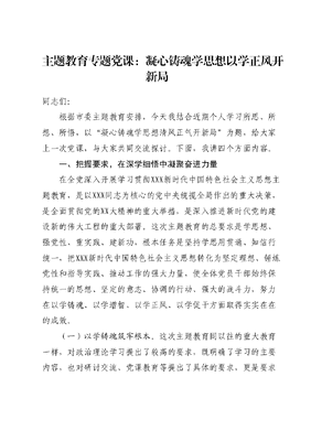 主题教育专题党课:凝心铸魂学思想以学正风开新局同志们:根据市委主题教育安排,今天我结合近期个人学习所思、所想、所悟,以凝心铸魂学思想清风正气开新局为题,给大家上一次党课,与大家共同交流探讨。下面,我讲四个方面内容。一、把握要求,在深学细悟中凝聚奋进力量在全党深入开展学习贯彻XXX新时代中国特色社会主义思想主题教育,是以XXX同志为核心的党中央统揽全局作出的重大决策,是全面贯彻党的XX大精神的重大举措,是深入推进新时代党的建设新的伟大工程的重大部署。这次主题教育的总要求是学思想、强党性、重实践、建新功,根本任务是坚持学思用贯通、知信行统一,把XXX新时代中国特色社会主义思想转化为坚定理想、锤炼党性和指导实践、推动工作的强大力量,使全体党员干部始终保持统一的思想、坚定的意志、协调的行动、强大的战斗力,努力在以学铸魂、以学增智、以学正风、以学促干方面取得实实在在的成效。(一)以学铸魂筑牢根本。这次主题教育同以往的重大教育一样,对政治理论学习提出了较高的要求,既明确了学习的主要内容,也对研讨交流、党课教育等提出了具体的要求,更是要求各级党员干部要完整全面准确掌握这一重要思想的主要内容,全面把握这一重要思想的世界观、方法论和贯穿其中的立场观点方法,深刻理解这一重要思想的道理、学理、哲理。学习是前提,是基础,更主要的是做好学习贯彻XXX新时代中国特色社会主义思想的深化、内化、转化工作。深入学习领会XXX新时代中国特色社会主义思想的科学体系、丰富内涵、精神实质、实践要求,从思想上正本清源、固本培元,筑牢信仰之基、补足精神之钙、把稳思想之舵、夯实成事之基,续写彪炳史册的壮丽篇章。要深刻领悟两个确立的决定性意义,坚持不懈用马克思主义中国化时代化最新成果武装头脑、指导实践、推动工作,以实际行动坚定捍卫两个确立,增强四个意识、坚定四个自信、做到两个维护。(二)以学增智汲取力量。我们党历来重视学习、善于学习党领导中国革命、建设和改革的历史,就是一部创造性学习的历史。新时代新征程,面对错综复杂的国际国内形势、艰巨繁重的改革发展稳定任务、各种不确定难预料的风险挑战,实现党的XX大确定的战略目标,需要广大党员干部从XXX新时代中国特色社会主义思想中汲取奋发进取的智慧和力量,熟练掌握其中蕴含的领导方法、思想方法、工作方法,不断提高履职尽责的能力和水平因此,我们广大党员领导干部要通过XXX新时代中国特色社会主义思想的学习,真正运用其中蕴含的领导方法、思想方法、工作方法去解决工作中面临的矛盾和难题,活学活用、知行合一,让理论知识在实践中发挥出更大的力量。(三)以学正风树立形象。作风反映的是形象和素质,体现的是党性。党的十八大以来,党中央坚持全面从严治党,把净化党内政治生态摆在更加突出的位置来抓,着力严明政治纪律和政治规矩,立明规矩、破潜规则,党内政治生活出现了许多新气象,党内政治生态明显好转。但我们也要清醒地认识到,党在新时代面临着各种考验和风险,全面从严治党永远在路上。党员干部要始终把纪律规矩挺在前面,把严明政治纪律、严守政治规矩放在更加突出位置,一以贯之严肃党内政治生活,一以贯之加强党规党纪教育,一以贯之抓好党规党纪执行力建设,一以贯之整治净化政治生态。要加强党章党规党纪学习,在严格的党内政治生活熔炉中砥砺忠诚之心,在时时事事中修炼火热丹心,增强对纪律要求的敬畏心和遵规守纪的自觉性,不断促进自我净化、自我完善、自我革新、自我提高。(四)以学促干推动发展。开展这次主题教育,重在联系实际、解决问题,指导实践、推动工作。只有弘扬理论联系实际的学风,紧密联系思想和工作实际,才能学出坚定信仰、学出使命担当。因此,要把主题教育与正在开展的三个年活动结合起来,与推进农业农村工作高质量发展结合起来,与完成好年度重点工作任务结合起来,以等不起、慢不得、坐不住的心态,着眼正在开展的大项任务,拧紧发条、大干快上,把规划图变成施工图,将时间表变成计程表,确保年度各项重点任务扎实推进。二、筑牢防线,在警示教育中保持廉洁本色XXXXXX在学习贯彻XXX新时代中国特色社会主义思想主题教育工作会议上指出,开展XXX新时代中国特色社会主义思想主题教育是深入推进全面从严治党、以党的自我革命引领社会革命的必然要求,反腐败斗争形势依然严峻复杂,遏制增量、消除存量的任务依然艰巨。近两年,系统先后查处3起违纪喝酒、49人违规经商办企业以及违反中央八项规定精神等案件,通过分析不难发现这些案件暴露一些共性问题:一是责任体系不完善。主体责任履行不到位,管党治党责任在一定程序上存在压力传导上热下冷、层层递减的现象;班子成员一岗双责履行不到位,对分管领域的监督指导不够;各党组织对党员干部的管理不够,党员管理教育宽松软二是制度体系不健全。制度建设可以使单位内