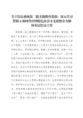关于信访系统第二批主题教育党课:深入学习贯彻A新时代中国特色社会主义思想全力做好基层信访工作按照第二批主题教育工作学思想、强党性、重实践、建新功的总要求,深入学习贯彻A新时代中国特色社会主义思想,全心全意为人民服务,坚守群众路线。AXXX在党的XX大报告中强调,全党要坚持全心全意为人民服务的根本宗旨,树牢群众观点,贯彻群众路线,尊重人民首创精神,坚持一切为了人民、一切依靠人民,从群众中来、到群众中去。我们党的最大政治优势是密切联系群众,保持党同人民群众的血肉联系,是我们党永远立于不败之地的根基,是我们党无往而不胜的法宝。信访工作是党的群众工作的重要组成部分,信访制度是践行党的群众路线的具体制度形式。党的XX大报告要求加强和改进人民信访工作。新时代新征程上,学习贯彻A新时代中国特色社会主义思想主题教育工作,必须牢固树立群众观念,维护群众合法权益,创新群众工作方法,提高群众工作能力,把党的群众路线贯彻到信访工作全过程;必须深刻领悟两个确立的决定性意义,增强四个意识、坚定四个自信、做到两个维护,在党的坚强领导下奋力谱写信访工作新篇章。一、牢固树立群众观念,坚决扛起信访工作为民解难、为党分忧的政治责任AXXX指出,人民立场是中国共产党的根本政治立场,是马克思主义政党区别于其他政党的显著标志。中国共产党的领导,就是支持和保证人民实现当家作主,要实现好、维护好、发展好最广大人民的根本利益。信访工作要践行以人民为中心的发展思想,把屁股端端地坐在老百姓的这一面,真诚倾听群众呼声,真实反映群众愿望,真情关心群众疾苦,更好地履行为民解难、为党分忧的政治责任。加强党对信访工作的全面领导。AXXX指出,中国特色社会主义最本质的特征是中国共产党领导,中国特色社会主义制度的最大优势是中国共产党领导。党的XX大报告把坚持和加强党的全面领导作为全面建设社会主义现代化国家必须牢牢把握的五条重大原则之一。坚持和加强党的全面领导是信访工作始终沿着正确政治方向前进的根本保证,也是信访工作践行全心全意为人民服务根本宗旨的内在要求。要坚持以A新时代中国特色社会主义思想为指导,贯彻落实AXXX关于加强和改进人民信访工作的重要思想,把党的领导贯彻到信访工作各方面全过程。自觉把信访工作放到党和国家工作大局中谋划推进,坚守人民情怀,坚持底线思维,为服务党和国家工作大局、维护群众合法权益、化解信访突出问题、促进社会和谐稳定发挥更大作用。健全完善党领导下的信访工作体制,构建党委统一领导、政府组织落实、信访工作联席会议协调、信访部门推动、各方齐抓共管的工作格局。信访工作联席会议作为加强党对信访工作全面领导的重要抓手,要发挥好统筹协调、整体推进和督促落实的职责作用。信访是送上门来的群众工作。AXXX指出:江山就是人民,人民就是江山。中国共产党领导人民打江山、守江山,守的是人民的心、贯彻党的群众路线,首先要对群众有感情,真正把自己当作群众的一员、把群众的事当作自己的事信访是送上门来的群众工作,要通过信访渠道摸清群众愿望和诉求,找到工作差距和不足,举一反三,加以改进,更好为群众服务。人民立场是信访工作的根本立场,人民至上是信访工作的价值追求,群众工作属性是信访工作的根本属性。要把心贴近人民,把人民放在心中最高位置,把群众来信当家书,把来访群众当家人,把群众事情当家事,全力以赴解决好群众的急难愁盼问题。及时解决群众通过信访渠道反映的合理合法诉求,既解决实际利益问题,也化解好群众思想上的疙瘩、情绪上的对立,把党和政府的温暖传递到千家万户,为党和国家事业发展凝聚民心,厚植党长期执政的群众基础。坚持以群众满意为根本标准。时代是出卷人,我们是答卷人,人民是阅卷人。想问题、作决策、办事情,应该把人民群众拥护不拥护、赞成不赞成、高兴不高兴、答应不答应作为衡量一切工作得失的根本标准。要始终坚持人民满意的价值追求,把人民群众的权益受到公平对待、利益得到有效维护作为评价信访工作的重要标尺。建立健全信访事项监督评价机制,坚持信访工作由群众评价,受群众监督,进一步增强信访工作透明度和公正性,切实保障信访群众的知情权、参与权和监督权。切实提升信访事项办理业务规范化水平,推动问题更加高效解决。严格落实信访工作责任,精益求精办理群众来信,耐心细致接待群众来访,努力保证信访群众每一个诉求都能得到认真负责处理,信访群众从每一件信访事项解决中都能感受到公平正义,创造经得起历史检验、经得起人民评判的工作业绩。##paidbegin##二、维护群众合法权益,把解决信访问题的过程作为践行党的群众路线的过程AXXX强调,要实现好、维护好、发展好最广大人民根本利益畅通和规范群众诉求表达、利益协调、权益保障通道。信访制度是我国民主政治制度的一项重要内容,是群众权利救济的重要
