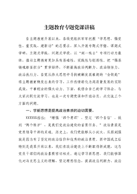 主题教育专题党课讲稿深入开展学习贯彻XXX新时代中国特色社会主义思想主题教育是党的XX大作出的重大战略部署。XXXXXX亲自出席中央主题教育工作会议,向全党郑重发出动员号令。我们要充分认清主题教育的重大意义,用XXX新时代中国特色社会主义思想统一思想、统一意志、统一行动,牢牢把握学思想、强党性、重实践、建新功的总要求,筑牢政治忠诚、统一意志行动、激扬奋进力量,汇聚攻坚克难、砥砺前行的正能量。作为新时代党员干部,必须深刻领悟两个确立的决定性意义,不断增强四个意识、坚定四个自信、做到两个维护,在思想上政治上行动上同党中央保持高度一致。要始终保持共产党人的政治本色,加强党的创新理论掌握运用,将其运用到贯彻落实党的XX大提出的重大战略部署中去,以统一的思想、坚定的意志、协调的行动、强大的战斗力踏上新征程、创造新伟业。下面,我结合自己的学习体会,与大家共同交流学习。一、提高政治站位,充分认识XXX新时代中国特色社会主义思想的重大理论和实践意义开展主题教育,首要任务是用XXX新时代中国特色社会主义思想凝心铸魂,教育引导广大党员从思想上正本清源、固本培元,以理论上的清醒确保政治上的坚定。XXX新时代中国特色社会主义思想是内涵丰富、系统完备、逻辑严密的思想体系,内容博大精深、思想系统深邃,党的十九大、十九届六中全会提出的十个明确、十四个坚持、十三个方面成就概括了这一思想的主要内容。真学真懂、学好用好XXX新时代中国特色社会主义思想,要从充分认识重大理论和实践意义入手,领会好、把握好这一思想的世界观和方法论,运用好、坚持好根本政治立场、科学的思想方法。党的XX大报告把XXX新时代中国特色社会主义思想的世界观和方法论概括为六个坚持,即必须坚持人民至上,坚持自信自立,坚持守正创新,坚持问题导向,坚持系统观念,坚持胸怀天下,这是XXX新时代中国特色社会主义思想活的灵魂,集中体现了这一思想的重大理论和实践意义。新征程上,我们要坚持不懈用XXX新时代中国特色社会主义思想凝心铸魂,完整把握、准确理解这一科学思想的世界观和方法论,坚持好、运用好贯穿其中的立场观点方法,更好指导全镇工作高质量发展。第一,要深刻理解把握坚持人民至上的根本价值取向。相信谁、为了谁、依靠谁,是否始终站在最广大人民的立场上,是衡量一种思想理论先进性的根本尺度。坚持人民至上,是贯穿XXX新时代中国特色社会主义思想的一条红线,深刻体现这一科学思想的鲜明本色和根本立场。第二,要深刻理解把握坚持自信自立的鲜明精神特质。党的百年奋斗成功道路是党领导人民独立自主探索开辟出来的,马克思主义的中国篇章是中国共产党人依靠自身力量实践出来的自信自立始终是我们党铸就伟大辉煌特有的精神气度。XXX新时代中国特色社会主义思想充分体现着独立自主的探索和实践精神,始终贯穿着坚持走自己道路的坚定信心和决心。新时代新征程,坚定中国特色社会主义道路自信、理论自信、制度自信、文化自信,必须深刻领悟两个确立的决定性意义,以实际行动践行两个维护。第三,要深刻理解把握坚持问题导向的求真务实态度。问题是时代的声音,回答并指导解决问题是理论的根本任务。坚持问题导向,是XXX新时代中国特色社会主义思想的鲜明风格。在新时代十年的伟大实践中,以XXX同志为核心的党中央始终把问题作为研究制定政策的起点,把化解矛盾、破解难题作为打开局面的突破口,推动党和国家事业在敢于斗争、敢于胜利中破浪前行新征程上,我们要继续瞄着问题去、迎着问题上,逢山开路、遇水架桥,在不断解决问题中开创全镇工作发展新局面。第四,要深刻理解把握坚持系统观念的科学思维方法。系统观念是辩证唯物主义的重要认识论和方法论,是具有基础性的思想和工作方法。XXXXXX始终坚持系统思维、全局谋划,坚持用普遍联系的、全面系统的、发展变化的观点观察事物,把握事物发展规律,为我们应对复杂局面、推动事业发展提供了科学遵循。第五,要深刻理解把握坚持胸怀天下的宏大视野格局。中国共产党是为中国人民谋幸福、为中华民族谋复兴的党,也是为人类谋进步、为世界谋大同的党。在百年奋斗历程中,我们党始终以世界眼光关注人类前途命运,始终站在历史正确的一边,站在人类文明进步的一边,为世界发展和人类进步事业作出了重要贡献。中国特色社会主义进入新时代,XXXXXX从人类前途命运出发,鲜明提出并深刻阐述了构建人类命运共同体的重大倡议,阐明了中国的安全观、发展观、义利观、全球化观、全球治理观提出弘扬全人类共同价值、建设新型国际关系、推动共建一带一路高质量发展,为维护世界和平与促进共同发展提供了中国智慧、中国方案。党的XX大着眼千秋伟业,规划世纪中叶,部署今后五年,为推进党和国家事业发展确立了行动指南。二、加强党性修养,自觉用XXX新时代中国特色社会主义思想凝心