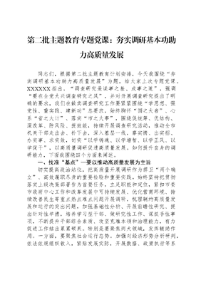 第二批主题教育专题党课:夯实调研基本功助力高质量发展同志们,根据第二批主题教育计划安排,今天我围绕夯实调研基本功助力高质量发展为题,给大家上次专题党课。XXXXXX指出,调查研究是谋事之基、成事之道,强调要在全党大兴调查研究之风,并对开展调查研究提出了明确的要求,我们在做实调查研究工作要紧紧围绕学思想、强党性、重实践、建新功总要求,始终胸怀国之大者、心系省之大计、落实市之大事,围绕促统筹、优结构、深改革、防风险、提效能,持续开展调查研究活动,推动全市机关干部走出去、扑下去,深入基层一线,察实情、出实招、办实事、求实效,切实以学铸魂、以学增智、以学正风、以学促干,以高质量调研促进高质量发展。如何提升自身的调研能力,下面我围绕四个方面来阐述。一、找准基点—要以推动高质量发展为主旨切实提高政治站位,把高质量开展调研作为捍卫两个确立、高效履职尽责的重要检验和重要实践。始终坚持把贯彻落实上级决策部署作为首要任务,立足职能和定位,紧扣市委市政府中心工作和改革发展中可持续发展、优化营商环境、持续改善民生等重点热点难点问题开展调研,梳理制约高质量发展和运行的突出问题,加强基础性分析、开展前瞻性研究、提出针对性举措,培养学习型干部、做研究性工作、谋抓手性事项,不断提升干部综合素质、攻坚克难本领和治理能力,有力促进工作结出累累硕果。特别是要聚焦两大领域,发挥辅助作用。一方面,要聚焦社会运行态势。加强对经济形势分析研判,依法依规组织收入,紧贴发展实际,开展数据、政策执行等系列分析,助推收入平稳增长。深入开展关于加强新时期经济建设的对策与建议等课题调查研究,主动将工作放在全市发展大局思考谋划,切实加强基层建设,推动基层实体经济高质量发展。同时,努力挖潜增收,统筹盘活资金、资产、资源等,拓宽收入来源,持续增强可持续性,夯实高质量发展基础。另一方面,要聚焦重点保障。聚焦经济社会发展薄弱环节和关键领域,就重点支持的产业发展、乡村振兴、基本民生等领域开展调研。围绕教育高质量发展,开展办学经费问题落实调研,以促进职业教育稳步向前;围绕企业上市登峰,开展全面注册制下推进我市企业上市调研,带动税收、就业效益;围绕涉企资金免申即享,开展产业扶持政策调研,尤其是要借助好我市作为惠企政策免申即享试点市之一,实现政企通等四网贯通融合;围绕加强地方政府重点工程管理,开展全生命周期管理调研,有效保障重大项目建设需求。二、用好标尺—要以全面提升调研质量为标准调研要注重整体推进与重点突破相结合,以年度重点任务为抓手,紧盯贯彻新发展理念、构建新发展格局、推动高质量发展中的短板和不足,聚焦加强四个中心功能建设、提高四个服务水平以及坚持五子联动服务和融入新发展格局、统筹发展和安全等重点任务,开展调查研究、强化督促检查,在贯彻落实党的XX大决策部署、推动首都经济社会发展上展现实干担当。一是政治站位要高。坚持高位推动抓调研,要认真学习党中央关于大兴调查研究的方案,贯彻落实好市委传达学习专题会上提出的具体要求。各党支部要通过三会一课、主题党日等形式,引导党员干部增强大兴调查研究的思想自觉、政治自觉、行动自觉。积极参与全市系统条线大调研活动,按照调研通知,组织课题申报,层层压实责任,高标准严要求推动全市系统全员参与大兴调查研究。二是调研内容要实。坚持求真务实抓调研,服务全市四创两高四个倍增,围绕市委市政府决策部署和管理改革中的热点难点重点问题,直面当前产业发展之急、发展之需以及人民群众急愁难盼问题。聚焦增收挖潜、产业转型升级、企业上市登峰、资金绩效管理、资产资源统筹、提升民生福祉等领域,组织开展全市系统大调研,针对存在问题寻求破解之道,推动高质量发展。三是跟踪推进要细。坚持压茬推进抓调研,上下联动,推动市局机关及下属单位、县区局共同参与,将大调研活动与全省科研活动结合,与作风建设深化年重点改革突破年结合,形成领导领衔+科室实施+集中编发模式,构建集中调研结合日常报告、联系基层结合企业走访、党团活动结合业务锻炼的大调研局面,并鼓励号召年轻干部积极参与,成立调研课题组,健全清单管理、定期调度、集中编发、成果交流、转化应用等五项工作推进机制。三、突出实效—要树好以调研促进发展为导向领导干部要率先示范,主动领题,牵头定下调研计划表,明确调研方式、责任处室和时间安排,亲自带队深入区县部门、企事业单位、农村社区等,综合运用座谈访谈、随机走访、问卷调查、抽样调查等方式开展调研,动态更新调研进展台账,确保沉下去听真话察实情,开展解剖式调研。一是以调研促党建。充分发挥党建示范引领作用,坚持跳出看,自觉从政治高度认识调查研究的重要性,通过构建党建+业务双百分考