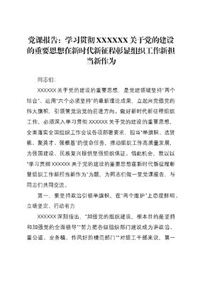党课报告:学习贯彻XXXXXX关于党的建设的重要思想在新时代新征程彰显组织工作新担当新作为同志们:XXXXXX关于党的建设的重要思想,是党建领域坚持两个结合、运用六个必须坚持的最新理论成果,立起兴党强党的伟大旗帜,引领管党治党的前进方向。做好新时代新征程组织工作,必须深入学习贯彻XXXXXX关于党的建设的重要思想,全面落实全国组织工作会议各项部署要求,担当举旗帜、选贤能、聚英才、强根基的使命任务,推动组织工作高质量发展,为强国建设、民族复兴提供坚强组织保证。借此机会,我以以学习贯彻XXXXXX关于党的建设的重要思想在新时代新征程彰显组织工作新担当新作为为题,为同志们做一堂党课报告,与同志们共同交流。第一,要坚持政治引领举旗帜,在两个维护上态度鲜明、立场坚定、行动有力XXXXXX深刻指出,加强党的组织建设,根本目的是坚持和加强党的全面领导努力把各级组织部门建设成为讲政治、重公道、业务精、作风好的模范部门对组工干部来说,第一位的是政治上绝对可靠、对党绝对忠诚。这些重要论述深刻阐明了讲政治与讲忠诚的内在一致性,揭示了组织工作、组织部门、组工干部在忠诚问题上的本质规定性。组织工作为党而生、因党而兴,坚持和加强党中央集中统一领导是最高原则,忠诚为党护党、全力兴党强党是根本使命,必须在两个维护上态度最鲜明、立场最坚定、行动最有力。组织部门是党的政治机关,坚定服从党中央、忠诚维护党中央、坚决拥护党中央是最鲜亮的底色、最纯粹的本色,必须当好坚定拥护两个确立、坚决做到两个维护第一方阵的排头兵。组工干部作为管党员的党员、管干部的干部,绝对忠诚是与生俱来的政治基因、政治品质,必须在两个维护上发挥表率作用,推动全党团结成一块坚硬的钢铁。做好新时代新征程组织工作,必须把两个维护作为最大政治责任,以实际行动擦亮对党绝对忠诚的政治底色。学思想铸牢忠诚。深入开展主题教育,组织实施XXX新时代中国特色社会主义思想凝心铸魂计划,健全落实第一议题第一主课等制度,完善党员干部理论教育培训长效机制,坚定用党的创新理论统一思想意志行动,打牢坚定拥护两个确立、坚决做到两个维护的思想根基。讲政治坚守忠诚。把坚持和加强党的全面领导和党中央集中统一领导作为首要政治任务,健全维护党的集中统一的组织制度,完善XXXXXX重要指示批示和党中央重大决策部署落实机制,推动两个维护具体化、常态化、制度化,从组织上制度上确保党的领导全面、系统、整体落实。强担当践行忠诚。坚定不移推进全面从严治党,落实全的要求、严的基调、治的理念,严密上下贯通、执行有力的组织体系,建强忠诚干净担当的高素质专业化干部队伍,做两个确立的坚定拥护者和两个维护的坚决践行者。第二,要坚持党管干部选贤能,把选人用人作为关系党和人民事业的关键性、根本性问题来抓XXXXXX深刻指出,党管干部、组织选人,这是选用干部的基本原则要坚持党管干部原则,保证党对干部人事工作的领导权和对重要干部的管理权。这些重要论述深刻阐释了党的领导是中国特色社会主义干部人事制度最本质特征,阐明了用人权是最重要的执政权。组织部门负责干部工作和干部队伍的统一管理,在选人用人上承担着强化党组织领导和把关作用的具体职责。第一位的是把好政治关,如果这个首要之关、定性之关把不严、把不准,让问题从我们自己手中溜走,用人标准就会失守、用人导向就会偏向。关键是把好条件关,如果德不配位、才不配位,没有做到该用谁而是谁该用,选人用人就会丧失公信力,影响党的权威和形象。要害是把好程序关,严格地、具体地贯彻民主集中制原则,每个程序都充分体现党组织的主导地位和集体把关作用,真正把忠诚干净担当的干部选出来、用起来。做好新时代新征程组织工作,必须把选人用人作为关系党和人民事业的关键性、根本性问题来抓,着力建设一支政治过硬、适应新时代要求、具备领导现代化建设能力的干部队伍。突出政治标准精准知事识人。把政治素质考察摆在首要位置,把政绩考核评价作为着力重点,把调研分析研判作为重要手段,建好用好干部政治素质档案,完善干部综合考核评价体系和结果运用机制,健全领导班子和领导干部全覆盖调研谈话制度,着重加强一把手重要行为特征分析,提高知事识人的精准性。突出事业为上促进担当作为。鲜明用人导向解决不想为问题,加强正确政绩观教育解决乱作为问题,推进干部能上能下解决不作为问题,强化能力提升解决不善为问题,打好激励干部担当作为组合拳,充分激发干部干事创业的积极性主动性创造性。突出严字当头加强管理监督。坚持严管就是厚爱,厚爱必须严管,注重抓早、抓小、抓苗头,在从严管理干部上树立全周期管理理念,健全全方位管理和经常性监督机制,把行为管理和思想管理统一起来,把八小时之内管理和八小时之外管