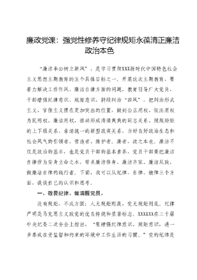 廉政党课:强党性修养守纪律规矩永葆清正廉洁政治本色廉洁奉公树立新风,是学习贯彻XXX新时代中国特色社会主义思想主题教育的五个具体目标之一。开展这次主题教育,要着力解决工作作风、廉洁自律方面的问题,教育引导广大党员、干部增强纪律意识、规矩意识,持续纠治四风,把纠治形式主义、官僚主义摆在更加突出的位置,做到公正用权、依法用权为民用权、廉洁用权,推动形成清清爽爽的同志关系、规规矩矩的上下级关系、亲清统一的新型政商关系,当好良好政治生态和社会风气的引领者、营造者、维护者。廉者,政之本也。廉洁不仅是政治的基石,也是党员干部的基本素养,党员干部要把廉洁自律作为安身立命之本,带头廉洁修身、廉洁齐家、廉洁从政,做廉洁自律的践行者。下面,我可以从纪律、自律、他律三个方面,谈谈自己的认识和思考。一、敬畏纪律、做清醒党员。没有规矩,不成方圆;人无规矩则废,党无规矩则乱。纪律严明是马克思主义政党的优良传统和显著标志。XXXXXX在二十届中央纪委二次全会上指出,要增强纪律意识、规矩意识,进一步养成在受监督和约束的环境中工作生活的习惯。党的纪律是为维护党和人民利益、保证全党行动一致而要求党员必须遵守的各项规定,作为新时代党员干部,要知敬畏、存戒惧,时刻保持头脑清醒,坚决不踩红线,不越底线。一要尊崇党章。党章是党的总章程,对坚持党的全面领导、推进全面从严治党、加强党的建设具有根本性的规范和指导作用中国共产党第二十次全国代表大会审议并一致通过十九届中央委员会提出的《中国共产党章程(修正案)》,决定这一修正案自通过之日起生效。治国必先治党,治党务必从严,从严必依法度回顾党的百年征程,党章党规在维护党中央的集中统一领导、保障党长期执政和国家长治久安等方面发挥重大政治保障作用。新时代党员干部要身体力行,切实增强自身的党章党规意识,全面提升党章党规的治理效能。学好党章党规不仅要在思想上坚定理想信念,更要在行动中践行初心使命,广大党员要在学好党章党规的基础上,坚定贯彻落实好党章党规。在全面依法治国的当下党员要时刻切记纪在法前,决不能踩在法律的底线上行事;在深入推进依规治党的当下,党员要时刻牢记纪严于法决不能站在纪律的边缘线上做事。什么能做、什么不能做,要做到心中有数、行中有度。无论身处何种环境,都要做到出淤泥而不染,要时刻用党章党规来提升自己、约束自我,做到心中有党规、行为合党规、工作依党规,真正将党章党规外化于行。二要坚守高线。加强纪律建设是全面从严治党的治本之策。《准则》和《条例》的颁布实施,是党在长期执政和全面依法治国条件下实现依规管党治党,加强党内监督的重大举措。《准则》坚持正面倡导、重在立德,体现了党章规定的理想信念和宗旨德行,是党员和党员领导干部能够看得见、够得着的高线。知敬畏,淡泊名利之心。畏则不敢肆而德以成,无畏则从其所欲而及于祸。知敬畏不是瞻前顾后、畏首畏尾,人为地把讲规矩和有作为对立起来,而是要敬畏党、敬畏人民、敬畏法纪,不断增强政治定力、纪律定力、道德定力和抵腐定力,始终做到不放纵、不越轨、不逾矩,在大有可为的时代大有作为。焦裕禄、孔繁森、杨善洲……这些党的好干部之所以受到人民群众称赞,关键在于他们心中有党、心中有民、心中有责、心中有戒能够始终如一严守政治关、品行关、作风关、廉洁关。敬畏是自律的开端,敬畏也是行为的界限,对党员干部而言,心有所畏,才能行有所止,才能淡泊名利,永葆政治本色。三要严守底线。底线是主体依据自身利益、情感、道义、法律所设定的不可跨越的临界线,一旦跨越了,主体的态度、立场和决策就会发生质的变化,从可以接受,变成不可以接受。换句话说,底线是指不可逾越的红线、警戒线、限制范围、约束框架。底线一旦被突破,就会出现行为主体无法接受的坏结果,甚至导致彻底失败。从近年被查处的贪腐案例来看因有恃无恐、目无法纪,越界脱缰而落马的官员有不少。有恃之人,往往自视甚高,自认为有靠山、有功劳、有来头,资历深、人脉广、能力强。因为有所恃,高估自己的能力,故而产生不怕的狂妄。他们将党纪国法全不放在眼里,任着性子恣意妄为,在不受约束的环境中目空一切、飘飘然,故而产生无所不能的错觉这些人在一地一位呼风唤雨,有恃无恐,无所顾忌,进而为所欲为、不加收敛,最终一步步跌入深渊。事实证明,那些自认为有所恃、所谓天不怕地不怕的党员干部,往往会在不怕的狂妄中走向自我毁灭。一个手持公权力的人,有恃无恐、心中无怕,是可怕的。他们的不怕与胆大是建立在对纪律和规矩的突破、对法律和程序的无视上。因为心中无恐,精神就无敬畏,行为也没有底线,很快就会堕入自大、自满、自我膨胀的情绪之中,为人处世就会变得狂妄自大、无法无天,甚至贪得无厌、肆无忌惮,最终吞下自酿的苦果。作为一名公务人员,在某些具体工作中,有一定