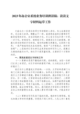 在2023年XX市办公室系统业务培训班上授课稿之前也在一些场合给写文字材料的人讲过,怎么起草好材料。这次给大家讲,侧重点不一样。我感觉在座的分管领导可能是指导的多些、亲自动笔的少些,办公室主任也许是一半写、一半不写,有时候写、有时候不写。希望通过今天的授课,提高大家对材料的评价标准,看材料的眼光更高些,达到两个效果:一是严格指导把关各类材料,做到工作有亮点、材料有体现;二是培养引导本单位出更多的材料写作人才,提高以文辅政的能力水平,助力XX高质量发展。主要讲五个方面的内容。一、要高度重视文字材料工作(一)要解决思想不重视的问题。总的感觉,当前一些部门认识上有误区,对文字材料的重视不够,认为把业务工作干好就行了。我们为什么要重视文字材料:一方面,文字材料是部门与部门之间公事往来必不可少的媒介。如果在文字材料中,要开展什么工作都说不清楚,影响了沟通效率,就会导致工作大打折扣。另一方面,文字材料也是本级部门向上级部门、上级领导汇报工作的重要手段。工作干得再出色,如果不能很好地概括和提炼亮点,写成了流水账,让上级部门、上级领导看得云里雾里,就会非常可惜。所以,我们要把文字材料工作等同于业务工作的重要性来看,就像人要有两条腿一样,才能正常行走。(二)要解决写作队伍不强的问题。有的单位领导说,我也知道文字材料很重要,但是找不到人来写。人怎么来?靠发现和培养。怎么发现能写的人?首先,文字材料工作不看学历专业、不分男女老少,只要用心,方法得当,都能写出合格的文字材料。其次,哪些人会更容易进入状态?跟篮球队选拔球员要身高190厘米以上,而体操运动员一般160厘米左右,有些干部具备的一些特质,会更适应写材料。比如,责任心驱动(服从工作安排、能够随时加班)、学历较高(学习能力强)、学生时代作文被当过范文(有写作基础)、逻辑思维严谨(问题导向较强)、杂家(喜欢涉猎各种知识)。重点还是要靠培养。怎么培养写作的人?一方面要言传身教。重大材料分管领导要带着办公室主任和写作骨干一起研究,不能一味地甩手丢下去,特别是新手多,不熟悉情况,就会耽误时间,影响工作。另一方面要严格要求。短时间内,让新手了解单位乃至全市工作情况,几种常用的材料怎么写,就要压任务给他们,而不是要等一年半载,把人给荒废了。刚开始,时间要服从质量,一些不那么紧急、常规的材料,可以给他们练练手。培养人还要靠好的机制,要奖优罚劣,树立导向。干得好的年度考核评优、优先晋级提拔;干得不好、态度还差的,及时警示,直至调整岗位。个人认为除了两办等综合部门外,一般部门除了办公室主任,要有1-2人比较专于负责文字材料工作,大部门2-3人。二、文字材料起草的几个步骤(一)接受任务。有周期常规性材料(如年初部署、年底总结等)、突发随机性材料(上级检查、专项活动等)。周期性的要提前准备谋划,不要等领导要求,或者时间快到了,才匆忙开始。(二)确定主题。要清楚这个材料是用来干嘛的?向上汇报还是向下部署?有些材料接受任务时候就知道主题,但有些不那么明晰,比如作经验介绍,要围绕哪些方面?最好能跟领导沟通再着手,避免推倒重来。(三)拟定提纲。不论文章长短,提纲必不可少,特别是大材料,用来统一想法,免得写着七零八落,甚至离题。一般不超过三级标题,最后哪级标题要写什么内容,可以标注关键词来提醒,以免遗漏。(四)充实内容。内容是要对应标题来写的。一个小标题下的内容可以是并列关系,也可以是递进关系,一件事一件事来写,条理要清楚。现在都提倡短文,要多些结果性表述,多用数据和事例说话。写的时候要一气呵成,不要死磕在一个地方。(五)修改打磨。成文后要回过头来,一字一句地看。不要提一些不切实际的目标任务,不要有语句上的硬伤、数据上的错误,甚至出现错别字等问题。事关几年的长远规划和工作报告,还要反复征求意见完善。三、几种常见文稿写法(一)报告总结类文稿。比如各级党代会的报告、各级党委全会的工作报告、各级人代会的政府工作报告,各地各单位的工作总结、工作报告等。这类文稿的写法是:第一部分,一般是总结工作,包括做法、成效、体会、存在的不足等。第二部分,分析面临的形势、提出指导思想、目标等。第三部分,今后的工作任务。第四部分,加强党的建设或关于加强组织领导、狠抓落实的要求。注意事项:一是开头段表述要新,紧跟形势,有时候看到一些部门总结开头,明显感觉是一直沿用下来的。二是总结成绩要用数据说话,全面又要突出重点。写不足要表述到位。三是下一步要精炼简要,有干货,不能都是虚的。(二)专项部署类文稿。这类文稿用得还比较多。一般结构是:第一部分,开展这项工作的重大意义(可融合成绩和不足来写)。第二部分,具体目标和工作任务(要抓好的几项重点工作)。第三部分,加强组织领导,明确责任分工,强化队伍建设,抓好督导落实等要求。也就是常说的三段论。比如我们年初召开