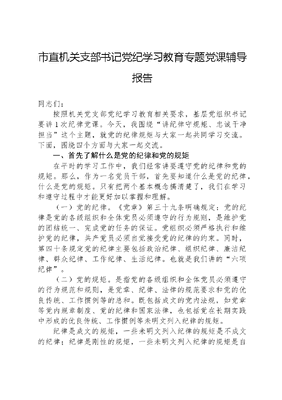 市直机关支部书记党纪学习教育专题党课辅导报告同志们:按照机关党支部党纪学习教育相关要求,基层党组织书记要讲1次纪律党课。今天,我围绕讲纪律守规矩、忠诚干净担当这个主题,就党的纪律规矩与大家一起共同学习交流。下面,围绕四个方面与大家一起交流。一、首先了解什么是党的纪律和党的规矩在平时的学习工作中,我们经常讲要遵守党的纪律和党的规矩。那么,作为一名党员干部,首先要知道什么是党的纪律,什么是党的规矩。只有把两个基本概念搞清楚了,我们在学习和遵守过程中才能更好加以掌握和理解。(一)党的纪律。《党章》第三十九条明确规定:党的纪律是党的各级组织和全体党员必须遵守的行为规则,是维护党的团结统一、完成党的任务的保证。党组织必须严格执行和维护党的纪律,共产党员必须自觉接受党的纪律的约束。同时,第四十条规定党的纪律主要包括政治纪律、组织纪律、廉洁纪律、群众纪律、工作纪律、生活纪律。也就是我们讲的六项纪律。(二)党的规矩。是指党的各级组织和全体党员必须遵守的行为规范和规则,是党章、纪律、法律的规范要求和党的优良传统、工作惯例等的总和。既包括成文的党内法规,如党章等党内规章制度、党的纪律和国家法律,也包括党在长期实践中形成的优良传统、工作惯例等未明文列入纪律的规矩。纪律是成文的规矩,一些未明文列入纪律的规矩是不成文的纪律;纪律是刚性的规矩,一些未明文列入纪律的规矩是自我约束的纪律。党内很多规矩是我们党在长期实践中形成的优良传统和工作惯例,经过实践检验,约定俗成、行之有效,反映了我们党对一些问题的深刻思考和科学总结,需要全党长期坚持并自觉遵循。这些规矩看着没有白纸黑字的规定,但都是一种传统、一种范式、一种要求。违反了这些优良传统和工作惯例,在政治上造成了不良影响,应当受到党纪惩处。比如:我们党的三大优良作风:理论联系实际、密切联系群众、批评与自我批评。工作惯例,比如:党委会开会要有事先议题通知,班子成员要互相交流情况,如果意见不同,要把问题摆到桌面上来,不在背后议论等。《中国共产党纪律处分条例》第七十六条规定,违反党的优良传统和工作惯例等党的规矩,在政治上造成不良影响或者严重后果的,给予相应处分。本条规定是对党员、干部遵守党的政治规矩提出的纪律要求。对违反党的规矩的行为,在政治上造成不良影响的要视情节给予党纪处分。在政治上造成不良影响,主要是指损害党的政治形象,破坏党同人民群众的关系,破坏党的团结统一等。新修订的《条例》将违反党的规矩的行为危害后果修改为在政治上造成不良影响或者严重后果,进一步明确了认定此类问题的标准,体现以高标准、严要求严明党的政治纪律和政治规矩,进而带动其他纪律严起来。二、深入扎实开展党纪律学习教育开展党纪学习教育,是加强党的纪律建设、推动全面从严治党向纵深发展的重要举措。中共中央办公厅专门印发了《关于在全党开展党纪学习教育的通知》,要求今年4至7月集中时间开展党纪学习教育。我们要深入学习贯彻XXXXXX的重要讲话和重要指示精神,切实把思想和行动统一到党中央决策部署上来,不折不扣落实《通知》要求,扎实开展党纪学习教育,以实际行动坚定拥护两个确立、坚决做到两个维文可居文库——海量学习资料,手机电脑均可下载www.wenkeju.com护。(一)要充分认识开展党纪学习教育的重大意义。首先要了解党纪学习教育的重要性:党的纪律是管党治党的戒尺,也是党员、干部约束自身行为的标准和遵循,各级党组织要把严守纪律、严明规矩放到重要位置来抓,努力在全党营造守纪律、讲规矩的氛围。其次要了解党纪学习教育的必要性:每个党员干部脑子里要有个紧箍咒,这个紧箍咒就是党规党纪。党员干部学好了党规党纪,就能弄清楚自己该做什么、不该做什么,能做什么、不能做什么。再次是要了解党纪学习教育的紧迫性:很多领导干部犯错误,最后在忏悔书中都说对党章和党规党纪不了解、不熟悉,出了事重新学习后幡然醒悟,惊出一身汗。这说明平时对党纪的学习教育不够,如果我们把党章和党规党纪学好了、掌握了,又自觉遵守了,防患于未然,就可以防止一些干部今天是好干部、明天是阶下囚的现象。(二)开展党纪学习教育的方法途径。一是原原本本学习《条例》。坚持个人自学与集中学习相结合。党组采取理论学习中心组学习、举办读书班等形式,逐条学习《条例》,紧扣党的六大纪律进行研讨,推动《条例》入脑入心。党支部要采取三会一课、主题党日以学习《条例》为主题,组织全体党员认真学习,基层党组织书记讲纪律党课。二是坚持党性党风党纪一起抓。党性、党风、党纪是有机整体,党性是根本,党风是表现,党纪是保障,要把党章和党规党纪学习教育作为党性教育的重要内容。(党性教育是通过特定的思想教育活动和实践锻炼方式使党的本质属性和价值目标内化为党员干部的价值选择和行动自觉的过程)。三是加强