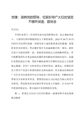 党课:坚持党的领导,切实引导广大妇女坚定不移听党话、跟党走同志们:中国妇女第十三次全国代表大会的胜利召开,标志着跟党奋斗、与党同行的妇联组织迈入了新的征程。2023年10月30日,XXXXXX同全国妇联新一届领导班子成员集体谈话时强调,要坚持党的全面领导,坚决维护党中央权威和集中统一领导,始终同党中央保持高度一致。要始终保持政治上的清醒和坚定,牢牢把握我国妇女事业的政治属性和妇联组织的政治定位,加强妇女思想政治引领,坚持不懈用新时代中国特色社会主义思想凝心铸魂,引导广大妇女坚定不移听党话、跟党走。妇联组织是中国共产党创立和领导的妇女群众组织,肩负着动员和组织广大妇女为完成党的中心任务而奋斗的历史使命。妇联组织要带领全市各族各界妇女,紧紧团结在以XXX同志为核心的党中央周围,坚持把党的全面领导贯穿妇女工作始终,在大局中牢牢把握职能定位,着力强化妇女思想政治引领。第一,要领会XXXXXX同全国妇联新一届领导班子成员集体谈话精神党政军民学、东西南北中,党是领导一切的。坚持党的领导,是做好党的妇女工作的根本保证,只有坚持党的领导,才能胜利完成妇联组织的职责使命。妇女事业和妇联工作要始终坚持正确政治方向,与党同心同行。妇女事业和妇联工作要始终坚持正确政治方向,与党同心同行。新时代妇女工作坚持党的领导,既是沿着正确政治方向前进的原则彰显,更是我们党的性质和初心使命所系。举旗定向,行向远方。妇联组织要不断提高政治判断力、政治领悟力、政治执行力,胸怀国之大者,确保把坚持党的全面领导作为最高政治原则,自觉贯彻落实到妇联工作全过程各方面。这关系到凝聚中国社会发展半边天的巾帼智慧和力量,使命光荣、责任重大。妇女事业和妇联工作要加强妇女思想政治引领,与党同声共气。政治上的坚定源于思想上的坚定。新时代妇女事业取得历史性成就,根本在于以XXX同志为核心的党中央掌舵领航,在于XXX新时代中国特色社会主义思想的科学指引。妇女价值观念日趋多样化,妇联组织必须增强四个意识,坚持不懈用XXX新时代中国特色社会主义思想凝心铸魂,引导妇女群众向着建设社会主义现代化强国的百年目标不断奋进。妇女事业和妇联工作要贯彻党的XX大战略部署,与党同频共振。党的十八大以来,从决战脱贫攻坚的第一线到科技创新的最前沿,从抗击传染病的逆行者到作为乡村振兴的领头雁,广大妇女以自尊自信自立自强的新时代女性风貌积极投身于中国特色社会主义事业。党的XX大报告提出以中国式现代化全面推进中华民族伟大复兴,确定了新时代新征程党的中心任务。妇联必须紧紧围绕党的中心任务发展妇女事业、开展妇女工作、履行妇联职能,凝聚广大妇女奋进新征程的磅礴力量。妇联组织和妇联工作要切实发挥桥梁纽带作用,与党同心协力。XXXXXX指出,群众性是群团组织的根本特点。妇联组织的根本任务是联系和服务广大妇女,真正做到妇女在哪里,妇联组织和妇联工作就延伸到哪里,既要注重妇女的个体诉求,也要深入了解不同妇女群体的所思所想所盼所求;既要注重各领域影响大的妇女工作,也要注重基层妇女工作,从中发现共性需求和普遍性问题,解决妇女群众急难愁盼问题,不断推动妇女事业顶层设计更加完善。妇联组织和妇联工作要整合党内外力量,与党同休共戚。各级党委要坚持党管妇女工作原则,为妇联组织开展工作提供支持、创造条件。妇女工作是一项涉及多部门、各层面、宽领域的系统工程,必须形成社会合力,以上下联动、齐抓共管、协同推进的工作局面,以党委领导、政府主责、妇儿工委协调、多部门合作、全社会参与的妇女儿童工作机制,推进妇女全面发展取得更为明显的实质性进展,推动形成尊重和关爱妇女、关心妇女事业、支持妇女工作的良好社会环境。第二,要把握新时代坚持和加强党对妇女工作的全面领导的重大意义坚持党的领导是做好党的妇女工作的根本保证,是妇女事业发展的立身之本。党的十八大以来,党对妇女工作的领导全面加强,对促进妇女全面发展、依法保障妇女权益作出一系列重要战略安排,为做好新时代妇联工作提供了坚强政治保证。坚持和加强党对妇女工作的全面领导是实现中国特色妇女发展道路的根本保证。道路决定命运。要坚定不移走中国特色社会主义妇女发展道路,组织动员广大妇女为中国式现代化建设贡献巾帼力量。党的XX大擘画了以中国式现代化全面推进强国建设、民族复兴的宏伟蓝图。中国特色社会主义妇女发展道路植根于中国的历史与现实。XXXXXX指出,要紧紧围绕贯彻落实党的XX大的战略部署,找准工作着力点,把党中央决策部署转化为妇联工作的具体任务。这将指引新时代中国妇女事业与中国式现代化建设、民族复兴的伟业同步发展,从而开辟出一条中国特色妇女解放之路。坚持和加强党对妇女工作的全面领导是妇女运动走向更大胜利的根本保证。纵观历史,没有妇女解放和进步,就没有人类解放和进步。实现性别平等与妇女解放始终贯穿在党的历