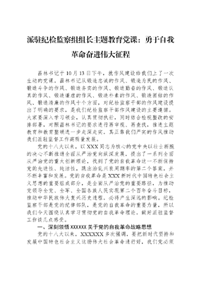派驻纪检监察组组长主题教育党课:勇于自我革命奋进伟大征程昌林书记于10月13日下午,就作风建设给我们上了一次生动的党课。昌林书记从锻造忠诚的作风、锻造为民的作风、锻造斗争的作风、锻造务实的作风、锻造勤奋的作风、锻造认真的作风、锻造谦虚的作风、锻造朴素的作风、锻造团结的作风、锻造清廉的作风十个方面,对纪检监察干部的作风建设提出了明确的要求,是我们纪检监察干部作风建设的主要遵循。大家要深入学习领会,认真贯彻执行,同时结合检视整改的安排部署,对照昌林书记的要求进行再审视、再查找,推进主题教育和教育整顿进一步走深走实,真正靠我们严实的作风推动我们派驻监督工作高质量发展。党的十八大以来,以XXX同志为核心的党中央以壮士断腕的决心不断推进全面从严治党向纵深发展,提出了一系列全面从严治党的重大创新理论,找到了党的自我革命这一不断保持党的先进性、纯洁性,跳出治乱兴衰周期率的第二个答案,并不断丰富和发展。党的自我革命是XXX新时代中国特色社会主义思想的重要组成部分,是全面从严治党的重要路径,为推动党领导全党、全军、全国各族人民实现第二个百年奋斗目标,推动中华民族伟大复兴历史进程,必将产生深远的影响。纪检监察干部是党的纪律部队,是党的自我革命的重要力量,所以我们今天围绕认真学习贯彻党的自我革命理论,做好派驻监督工作谈几点感受。一、深刻领悟XXXXXX关于党的自我革命战略思想党的十八大以来,XXXXXX多次强调,要把新时代坚持和发展中国特色社会主义这场伟大社会革命进行好,我们党必须勇于进行自我革命,把党建设得更加坚强有力,坚持全面从严治党永远在路上,以新时代党的自我革命引领新的伟大社会革命。XXXXXX在庆祝中国共产党成立95周年大会上,首次提出全党要以自我革命的政治勇气,着力解决党自身存在的突出问题。此后又先后在很多重要会议上就党的自我革命作出深入阐述。在十九届六中全会上,XXXXXX指出,如何跳出治乱兴衰的历史周期率,经过百年奋斗特别是党的十八大以来新的实践,我们党又给出了第二个答案,这就是自我革命;在十九届中央纪委六次全会上,XXXXXX指出,一百年来,党外靠发展人民民主、接受人民监督,内靠全面从严治党、推进自我革命,勇于坚持真理、修正错误,勇于刀刃向内、刮骨疗毒,保证了党长盛不衰、不断发展壮大,全面从严治党是新时代党的自我革命的伟大实践,开辟了百年大党自我革命的新境界。在党的XX大上,XXXXXX郑重宣示,全党必须牢记,全面从严治党永远在路上,党的自我革命永远在路上。在强调继续协调推进四个全面战略布局的同时,还进一步提出,要以新时代党的建设新的伟大工程的两个全面,即党的全面领导和全面从严治党,去适配和保障新征程上党领导的伟大事业的两个全面,即全面建设社会主义现代化国家、全面推进中华民族伟大复兴。全面建设社会主义现代化国家、全面推进中华民族伟大复兴,关键在党。我们党已经走过了百年光辉历程,现在又踏上了实现第二个百年奋斗目标新征程。今天,我们党比历史上任何时期都更接近、更有信心和能力实现中华民族伟大复兴。在新征程上,我们党面临的风险考验只会越来越复杂,甚至会遇到难以想象的惊涛骇浪,我们面临的各种斗争不是短期的,而是长期的,将伴随实现第二个百年奋斗目标全过程。我们党作为世界第一大党,没有什么外力能够打倒我们,能够打倒我们的只有我们自己。以XXX同志为核心的党中央清醒地认识到,解决这个难题的关键,就是要实事求是地认识和把握自己,以勇于自我革命精神打造和锤炼自己,以党的伟大自我革命引领伟大社会革命,以伟大社会革命促进伟大自我革命。正是在深刻总结党的百年奋斗历程特别是新时代实践基础上,基于对党的伟大自我革命和伟大社会革命相互作用的战略视角,XXXXXX就建设什么样的长期执政的马克思主义政党、怎样建设长期执政的马克思主义政党这一重大时代课题,创造性提出了党的自我革命战略思想。强调要始终赢得人民拥护、巩固长期执政地位,必须时刻保持解决大党独有难题的清醒和坚定。重点是进一步研究解决六个方面的独有难题:一是如何始终不忘初心、牢记使命,二是如何始终统一思想、统一意志、统一行动,三是如何始终具备强大的执政能力和领导水平,四是如何始终保持干事创业精神状态,五是如何始终能够及时发现和解决自身存在的问题,六是如何始终保持风清气正的政治生态。从理论和实践的结合上解决这些难题,是实现新时代新征程党的使命任务必须迈过的一道坎,是全面从严治党适应新形势新要求必须啃下的硬骨头。强调勇于自我革命,是我们党最鲜明的品格,也是我们党最大的优势。XXXXXX在党的十九大上强调,伟大斗争,伟大工程,伟大事业,伟大梦想,紧密联系、相互贯通、相互作用,其中起决定性作用的是党的建设新的伟大工程。要把新时代坚持和发展中国特色社会主义这场伟大社会革命进行好,我们党必须