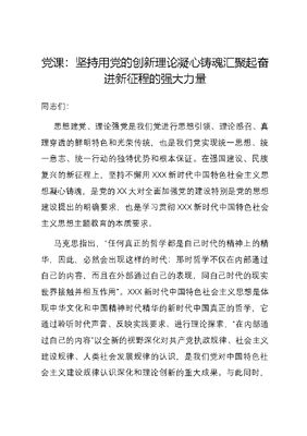 党课:坚持用党的创新理论凝心铸魂汇聚起奋进新征程的强大力量同志们:思想建党、理论强党是我们党进行思想引领、理论感召、真理穿透的鲜明特色和光荣传统,也是我们党实现统一思想、统一意志、统一行动的独特优势和根本保证。在强国建设、民族复兴的新征程上,坚持不懈用XXX新时代中国特色社会主义思想凝心铸魂,是党的XX大对全面加强党的建设特别是党的思想建设提出的明确要求,也是学习贯彻XXX新时代中国特色社会主义思想主题教育的本质要求。马克思指出,任何真正的哲学都是自己时代的精神上的精华,因此,必然会出现这样的时代:那时哲学不仅在内部通过自己的内容,而且在外部通过自己的表现,同自己时代的现实世界接触并相互作用。XXX新时代中国特色社会主义思想是体现中华文化和中国精神时代精华的新时代中国真正的哲学,它通过聆听时代声音、反映实践要求、进行理论探索,在内部通过自己的内容以全新的视野深化对共产党执政规律、社会主义建设规律、人类社会发展规律的认识,是我们党对中国特色社会主义建设规律认识深化和理论创新的重大成果。与此同时,通过从新的实际出发,在外部通过自己的表现源于实践并回应实践问题、遵循实践规律并取得实践成果,对新时代党和国家事业发展和推进中华民族伟大复兴历史进程发挥了决定性作用。当下,坚持不懈用XXX新时代中国特色社会主义思想凝心铸魂的时代价值,就在于其与新时代新征程中国的现实世界接触并相互作用,锚定党和国家正确的前进方向,凝聚全体中国人民的磅礴力量,确保中国式现代化在攻坚克难中从胜利走向胜利。一、锚定党和国家正确的前进方向只有社会主义才能救中国,只有中国特色社会主义才能发展中国,只有中国共产党才能领导当代中国的发展和进步,只有中国共产党领导的中国式现代化才能实现中华民族伟大复兴,这是经过理论证明和实践佐证了的真理性认识和权威性结论。守正创新是XXX新时代中国特色社会主义思想鲜明的世界观和方法论。守正主要体现在既不抛弃马克思主义这个魂脉,也不抛弃中华优秀传统文化这个根脉,具体体现为坚持马克思主义基本原理不动摇,坚持党的全面领导不动摇,坚持中国特色社会主义不动摇;创新主要体现在有效地把马克思主义思想精髓同中华优秀传统文化精华贯通起来,在人类知识的总和中汲取优秀思想文化资源来创新和发展党的理论,具体体现为开创马克思主义中国化时代化之新,开创党的自我革命之新,开创中国式现代化之新。正是基于此,XXX新时代中国特色社会主义思想才能聚变为新的理论优势,不断攀登新的思想高峰并形成兼收并蓄、博采众长的理论大格局大气象。正是由于守正与创新体现了继承与发展、原则性与创造性的辩证统一,才使得XXX新时代中国特色社会主义思想成为引航定向、保驾护航、指明路径的思想灯塔和指路明灯。时代催生思想,思想引领时代。坚持不懈用XXX新时代中国特色社会主义思想凝心铸魂,首先也是最为关键的,在于通过党的理论武装引领时代发展的正确航向。对马克思主义的信仰,对社会主义和共产主义的信念,是共产党人的政治灵魂,这是理论武装需要始终强调的。但是,马克思的整个世界观不是教义,而是方法。它提供的不是现成的教条,而是进一步研究的出发点和供这种研究使用的方法,这也是理论武装需要强调的。因此,理论武装所要达到的,既包括坚持马克思主义基本原理不动摇,又包括开创马克思主义中国化时代化新境界。其次,党是最高政治领导力量,在坚持党的全面领导的问题上决不能含糊,这是理论武装需要特别坚持的。同时,对于党内存在的各种问题不能视而不见、熟视无睹,特别是对于影响党对一切工作领导的体制机制问题不能麻木不仁、得过且过,这也是理论武装需要特别坚持的。因此,理论武装所要达到的,既包括坚持党的全面领导不动摇,又包括进行党的自我革命不懈怠。再次,中国特色社会主义制度是当代中国发展进步的根本保证,任何怀疑、观望甚至动摇都是不可取的,不该改的、不能改的坚决不改,这是理论武装需要秉持的立场。但同时,不断完善和发展中国特色社会主义制度、推进中国式现代化建设,该改的、能改的我们坚决改,这也是理论武装需要秉持的立场。因此,理论武装所要达到的,既包括坚持中国特色社会主义不动摇,又包括推进中国特色社会主义制度自我完善和健康发展不懈怠。二、凝聚全体中国人民的磅礴力量古人讲水有源,故其流不穷;木有根,故其生不穷。引申开来说,就是只要有精神支柱,人就永远不会垮掉;只要有人民群众的磅礴力量,全面建设社会主义现代化国家就有了无坚不摧的底气。积攒精神、凝聚力量,既要厚植精神沃土,铸牢中华民族共同体意识,确保各民族像石榴籽一样紧紧抱在一起;又要不断凝聚共识,携手并肩、团结奋斗,形成海内外全体中华儿女心往一处想、劲往一处使的生动局面。党的十八大以来,党和国家事业发展所取得的历史性成就、所发生的历史性变革,背后少不了精神积攒的作
