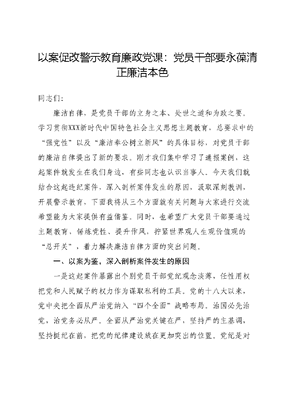以案促改警示教育廉政党课:党员干部要永葆清正廉洁本色同志们:廉洁自律,是党员干部的立身之本、处世之道和为政之要。学习贯彻XXX新时代中国特色社会主义思想主题教育,总要求中的强党性以及廉洁奉公树立新风的具体目标,对党员干部的廉洁自律提出了新的要求。刚才我们集中学习了通报案例,这起案件就发生在我们身边,有些同志也认识当事人。今天我们就结合这起违纪案件,深入剖析案件发生的原因,汲取深刻教训,开展警示教育,下面我将从三个方面就有关问题与大家进行交流希望能为大家提供有益借鉴。同时,也希望广大党员干部要通过主题教育,锤炼党性、提升作风,拧紧世界观人生观价值观的总开关,着力解决廉洁自律方面的突出问题。一、以案为鉴,深入剖析案件发生的原因一是这起案件暴露出个别党员干部党纪观念淡薄,任性用权把党和人民赋予的权力作为谋取私利的工具。党的十八大以来,党中央把全面从严治党纳入四个全面战略布局。治国必先治党,治党务必从严。全面从严治党关键在严,坚持严的主基调,坚持挺纪在前,把党的纪律建设放在更加突出的位置。党纪是对党员最基本的要求,敬畏党纪是对党的拥护。我们经常用三条线来形容党的纪律,第一,党的纪律是政治底线;第二,党的纪律是行为红线。党员不能越过红线;第三,党的纪律是检验党员先进性纯洁性标准的及格线,党员不能低于及格线。一个合格公民的最低要求是遵守法律,而一个合格党员的最低标准要更进一层,必须不折不扣遵守党的各项纪律,党员必须承担比普通公民更重的政治责任。事实上,纪律松懈、规矩一破,很多问题就会随之产生。纪律坚如铁,谁碰谁流血。身边的教训在验证这个道理。我们党历来重视纪律建设,纪律严明是党的光荣传统和独特优势。XXXXXX指出,坚持纪严于法、纪在法前。体现了从严治党、从严执纪的决心,每一个党员干部都必须有党章党规党纪认识,如果我行我素,逆潮流而动、顶风违纪,就必须严肃处理。我们查处的这起案件,作为直接面向企业的执法人员李某某,工作中的一言一行代表的是其所在单位和部门,而他却利用职权向企业索要钱物,这种行为带来的影响不光是企业对其个人品质的不良评价,更会引起企业对我们市营商环境的不满,他的吃拿卡要行为破坏了营商环境,破坏了执法部门的公信力,破坏了党和政府的形象。纪委介入调查期间,李某某还不予配合,找到企业法人要订立攻守同盟,要求企业不要说出事情真相,严重干扰、妨碍了组织审查,性质十分恶劣,这就是错上加错了,对上述案件的当事人必须依照处分条例和相关规定从重处理。这起案件的查处也体现了市委全面从严治党的鲜明态度和坚持零容忍、全覆盖、无禁止惩治腐败的坚定决心。二是这起案件暴露出我们的个别党员干部还存在不担当、不作为、乱作为,不收手不收敛、顶风违纪问题,说明四风问题具有顽固性反复性复杂性。党的十八大以来,党中央从制定和落实中央八项规定开局破题,持之以恒纠治四风,释放出严的信号。浏览一下中纪委公众号会发现,通报曝光违反中央八项规定精神典型问题已经成为常态,充分彰显了党中央一以贯之从严推动落实中央八项规定精神的坚定意志。今年以来,市纪委监委把查处案件摆在突出位置,查处了一批违规收受礼金、公款宴请、违规发放补贴、公款旅游等问题。应该说前车之鉴不远但仍有个别党员干部心存侥幸、置若罔闻,反映出作风问题具有顽固性、反复性,抓一抓就好转,松一松就反弹,必须时刻保持清醒坚定,作风建设仍需持续发力,久久为功,作风建设永远在路上,必须严抓不放、常抓不懈。天下事,做于细,成于严。抓作风建设就是要从司空见惯的小节改起,从见怪不怪的小事抓起,从违规吃喝的小圈子查起,聚沙成塔、积小成大保持定力,寸步不让,所以我们广大党员干部必须深刻认识作风建设的重要性,自觉落实中央八项规定精神,坚持把自己摆进去把职责摆进去、把工作摆进去,驰而不息纠四风树新风,推动中央八项规定精神化风成俗。三是这起案件也反映出一些党员干部依规依法履职意识不强有的执法人员违反法定程序随意执法。我们在调查中发现,李某某在执法过程中发现企业违规经营问题后没有按规定对相关物品进行查封和下达执法文书,也未将此事向主管领导进行汇报,而是以此作为条件向企业索要钱物。执法工作是一项很严肃的工作而上述行为显然不符合相关规定,是违反程序违法,没有正确履行职责,并且索贿行为影响十分恶劣,必须严肃处理。大家一定要引以为戒,不要以为工作上有点过失或疏忽不是什么大不了的问题,也不要把一些程序、规定看作可有可无的东西。XXXXXX在XXX报告中强调,全面推进国家各方面工作法治化。为把法治化要求落到实处,党员干部尤其是执法领域人员要树立依规依法办事理念,严格依规依法开展工作,把提升法治素养作为必修课,学好用好本职工作领域的法律法规,守好党纪守好法律法规。四是这起案件也反映出当前一