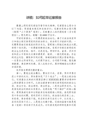 讲稿:如何起草巡察报告根据上级巡视巡察指导督导相关精神,巡察报告主要分为以下内容:简述基本情况和总体评价;巡察发现的主要问题(按照三个聚焦框架);反映重点人的问题线索(另专题报告);意见建议。篇幅一般6000字左右。写好巡察报告,一定要提高政治站位,善于从政治高度审示和指出被巡察党组织的政治担当、政治责任方面的问题;一定要聚焦被巡察党组织职责定位,紧盯核心职能反映突出问题,体现个性问题;一定要做到精准反映,客观评价被巡察党组织政治生态是好转、持平、还是恶化,贯彻中央、省委、苏州市委和昆山市委相关决策部署是好、较好、一般还是较差,存在的突出风险、腐败和作风问题、体制机制性问题主要有哪些;一定要务必写准写实,大问题不放过、小问题不纠缠,强化精准数据、典型事例支撑,深入比较分析,具体明确指出问题并讲深讲透。起草报告需要把握的重点:第一,要突出政治属性。要回应中央、省委、苏州市委及昆山市委的关切。具体要体现五个突出。一是突出政治站位。巡察报告反映的问题要坚持以XXXXXX重要讲话精神和上级部署要求为标尺,从政治高度审示被巡察党组织的政治立场、政治方向、政治原则、政治担当。二是突出职责定位。这是深化政治巡察的本质要求,也是检验两个维护的核心指标。要聚焦被巡察单位职能责任特别是核心职能,查找贯彻落实中存在的问题,看有没有认识到位,政治站位有没有上去,责任感、使命感强不强,有没有把责任放在心中、扛在肩上、落实到具体行动上。三是突出关键少数。巡察的监督对象是党委(党组)领导班子及其成员,对巡察发现的种种现象和问题要以下看上,首先反映党委(党组)领导班子成员特别是一把手的态度、立场、站位和责任,让人看完后就知道这个班子在三个聚焦方面的差距。四是突出个性特点。要把握不同巡察对象的特点及其所承担的职责,深入查找存在问题,让领导小组听了以后感觉画的是这个地方(单位)的样貌,避免千人一面。五是突出人民立场。坚持以人民为中心是巡察工作根本价值取向。要把发现和推动解决群众身边腐败问题和不正之风作为巡察报告重要内容,督促被巡察党组织把惩治基层腐败问题牢牢抓在手上,让群众感受到从严管党治党就在身边、正风肃纪反腐就在身边,夯实党的执政根基。第二,要善于归纳提炼。善于从落实政治责任的高度归纳提炼巡察发现的问题,是起草高质量巡察报告的基本功。否则,即使巡得很好,报告也很难写好写到位。巡好很重要,而在此基础上进一步加以分析、概括、提炼同样重要。具体要做到四个注重。一要注重问题分析。坚持用发展的、联系的、辩证的观点分析问题。发展地看,就是要坚持以发展的观点看方向、看变化、看趋势,联系历史背景认识问题、分析问题,看这些问题是越来越严重,还是有所好转;联系地看,要将中央、省委、苏州市委及昆山市委相关决策部署以及行业领域政策与地区(单位)实际结合起来研判,不能孤立地看问题,坚持以上看下和以下看上相结合,从现象看本质、从问题看责任、从客观看主观;辩证地看,要坚持两点论,善于抓住主要矛盾和矛盾的主要方面,别把一些鸡毛蒜皮的事写入巡察报告。党的十八大以来,全面从严治党取得显著成效。把握全面从严治党阶段性特征,必须结合被巡察单位从严治党趋势态势,以及落实两个责任、净化政治生态等方面情况综合分析,从而揭示出现阶段主要矛盾和矛盾的主要方面,不能捡到筐里都是菜。二要注重问题提炼。在全面掌握问题来龙去脉基础上,概括提炼出鲜明的观点。当然,概括提炼观点一定要精准,不能因词害意。特别是涉及对重要问题的定性和判断,要把握分寸、客观准确,不能搞大概好像差不多,也不能简单扣四个意识不强、两个维护不坚决等大帽子。尤其不能在没有事实支撑的情况下先入为主对问题定性,把推论当结论。三要注重问题归类。在对巡察报告谋篇布局阶段,就要对所涉及的问题进行分类、分层、分块,把每个小问题归到大类问题中。四要注重问题排序。注意区分问题之间主与次、轻与重、大与小的关系,一般是按照重要问题在前、次要问题在后的顺序排列。 概括提炼过程中,要把握好四个关系。一是共性和个性的关系。既要把握加强党组织领导班子和领导干部政治建设等普遍性要求,也要把握被巡视巡察党组织履职过程中存在的突出问题,这样才能精准画像。二是主观和客观的关系。对发现的问题,要看是客观原因造成的,还是主观上不担当不作为乱作为造成的,不能简单归结为主观上不落实。三是历史和现实的关系。注意把握时间节点,重点反映上次巡视巡察以来特别是十九大以来发生的问题。同时,要注意区分现任班子和前任班子的问题,对前任遗留的问题,重点看现任班子的态度、责任担当和推进措施,看有没有新官不理旧账。如果新任班子有改进,要如实写。四是宏观和微观的关系。十九届四中全会对推进治理体系和治理能力现代化作了全面部署。在这个背景下,巡察报告要充