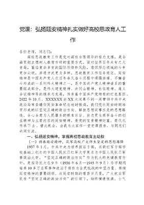 党课:弘扬延安精神扎实做好高校思政育人工作各位老师,同志们:高校思政教育工作是党对高校全面领导的有力支撑,是全面贯彻立德树人教育方针的重要方式。面对世界百年未有之大变局,面临复杂多变的国际形势和风险,意识形态领域的斗争更加尖锐,渗透方式更为多样,思政教育工作任务艰巨。延安精神是中国共产党人在百年非凡奋斗历程中顽强拼搏、不懈奋斗形成的一系列伟大精神之一,是中国共产党人精神谱系的重要组成部分,是伟大建党精神、井冈山精神、长征精神、遵义会议精神等的继承与发展,传承着中国共产党特有的红色基因。2022年10月,XXXXXX在XX大闭幕不到一周带领中共中央政治局常委瞻仰延安革命纪念地时强调,我们党在延安时期培育形成的以坚定正确的政治方向、解放思想实事求是的思想路线、全心全意为人民服务的根本宗旨、自力更生艰苦奋斗的创业精神为主要内容的延安精神,是党的宝贵精神财富,要代代传承下 去 。借此机会,由我为大家作一堂党课报告,与同志们共同交流。一、弘扬延安精神,掌握高校思政教育主动权(一)传承延安精神,筑牢高校广大师生坚定的思想屏障1937年1月,中共中央为培养抗日干部,在将红军干部学校基础上创办的中国人民抗日红军大学更名为中国人民抗日军事政治大学。坚定正确的政治方向作为抗大的关键教育方针,是指导抗大在9年(1936年6月—1945年9月)办学期间培养10多万名军事和政治干部作为全民抗战的中坚力量、赓续延安精神的重要纲领。在延安时期的艰苦岁月里,广大抗日军民在坚定正确的政治方向的引领下,始终情绪饱满、士气高昂,充满不畏艰难困苦的革命乐观主义精神和勇于牺牲的无私奉献精神,也正是这种为民族和人民的解放事业矢志不渝的理想信念,构成延安精神的灵魂。政治建设是党的建设的首要任务,也是高校意识形态工作的关键任务。延安时期强有力的政治建设肃清了左倾冒险主义和右倾保守主义两大障碍,确立了毛泽东思想作为党的指导思想,为中国革命确立了正确的政治方向。深刻总结党的百年奋斗历程和党的十八大以来伟大实践,党的十九届六中全会确立XXX同志党中央的核心、全党的核心地位,确立XXX新时代中国特色社会主义思想的指导地位。党的XX大通过的《中国共产党章程(修正案)》决议强调,两个确立是党在新的时代条件下取得的重大政治成果,是推动党和国家事业取得历史性成就、发生历史性变革的决定性因素。新的历史时期要用XXX新时代中国特色社会主义思想武装全党,是坚定共同理想、明确前进方向的需要。开展高校思政教育工作,要牢记坚定正确的政治方向政治建设核心,深入学习宣传贯彻XXX新时中国特色社会主义思想,坚定正确的政治方向,确保高校思政教育的纯洁性和正确性,让高校师生在复杂环境中保持初心,提升师生在思想上明辨是非、防腐拒变的意识和能力,坚定为实现中华民族复兴的伟大使命而不懈奋斗、为中国特色社会主义事业奋斗终身的理想信念。(二)擦亮马克思主义底色,武装高校师生头脑高校思政教育工作要坚持马克思主义在意识形态领域的指导地位,以高度的理论自信和行动自觉推进XXX新时代中国特色社会主义思想入脑入心。延安时期,中国共产党人以革命实践为基础,形成逻辑严密完整的马克思主义辩证法理论体系,立足革命实际,继承中华优秀文化传统思想,最终带领广大军民取得了革命的胜利 。实践表明,只有将马克思主义中国化理论成果作为强有力的理论武装,才能更好地明辨方向、统一思想,不断地坚定信心、汇聚力量。高校应擦亮马克思主义底色,精心打造一批马克思主义精品成果,利用微信公众号、微博等平台积极推送,主动自觉宣讲马克思主义基本理论,增强师生思想认同。把握高校思想宣传主流阵地,推动马克思主义基本原理进高校、进教材、进课堂,用先进的理论武装高校师生头脑,持续推进马克思主义思想入脑入心,筑牢全体师生团结奋斗的共同思想基础。(三)凝聚改革创新价值共识,推动高校事业高质量发展延安时期,中共中央将中华苏维埃人民共和国中央政府西北办事处正式更名为陕甘宁边区政府,是革命道路的实践创新,形成农村包围城市,武装夺取政权论持久战等马克思主义中国化创新思想,使党在腹背受敌、物质匮乏等极其艰难困苦的环境中披荆斩棘、攻坚克难,最终取得抗日战争胜利和新民主主义革命胜利。当前,高校正走内涵式高质量发展道路,正不断深化人才发展机制改革,破除壁垒对人才的束缚,提高行政管理效能和治理水平。只有用创新发展的眼光来认识、理解、阐释当前教育改革所面临的问题与困境,在高校中凝聚敢于打破常规、破旧立新,敢于变革创新、与时俱进,敢于攻坚克难、锐意进取的价值共识,才能在最大程度上推进高校高质量改革和发展并取得新进展、新成效。高校党委要从党和国家的战略高度贯彻党的XX大报告中关于人才、科技、教育的要求,深入学习贯彻XXXXXX关于教育的重要论述。党的XX大报告强调,教育、科
