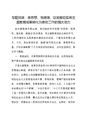 专题党课:学思想、悟原理、促发展切实将主题教育成果转化为推动工作的强大动力自主题教育开展以来,我们始终牢牢把握学思想、强党性、重实践、建新功的总要求,将主题教育焕发出来的学习、工作热情转化为高质量发展的实际成效、干事创业的强大动力。今天,我以党课形式,围绕筑牢政治之魂、厚植党性之基、开创发展新篇三个方面谈谈我的体会,共同交流探讨、相互学习提高。一、提高站位,在学思践悟中筑牢政治之魂,以更高标准、更严要求推动主题教育走深走实开展主题教育,首要任务是用XXX新时代中国特色社会主义思想凝心铸魂,教育引导广大党员干部从思想上正本清源、固本培元,以理论上的清醒确保政治上的坚定。XXX新时代中国特色社会主义思想是内涵丰富、系统完备、逻辑严密的思想体系,内容博大精深、思想系统深邃,党的十九大、十九届六中全会提出的十个明确、十四个坚持、十三个方面成就概括了这一思想的主要内容。真学真懂、学好用好XXX新时代中国特色社会主义思想,要从充分认识重大理论和实践意义入手,领会好、把握好这一思想的世界观和方法论,运用好、坚持好根本政治立场、科学的思想方法。党的XX大报告把XXX新时代中国特色社会主义思想的世界观和方法论概括为六个坚持,即必须坚持人民至上,坚持自信自立,坚持守正创新,坚持问题导向,坚持系统观念,坚持胸怀天下,这是XXX新时代中国特色社会主义思想活的灵魂,集中体现了这一思想的重大理论和实践意义。一是要提高站位。广大党员干部一定要提升政治觉悟,深刻认识开展开展XXX新时代中国特色社会主义思想主题教育的重大现实意义和深远历史意义,切实增强做好工作的责任感和使命感,以坚韧顽强的斗争精神、较真碰硬的工作态度、务实创新的工作作风,把这项重大政治任务扛在肩上、抓在手上,务求取得扎扎实实的成效。二是要学深悟透。以开展XXX新时代中国特色社会主义思想主题教育为契机,推进XXX新时代中国特色社会主义思想主题教育常态化制度化,注重采取理论和实践、历史和现实、当前和未来相结合的方法,真正领会深、领会透这一科学理论,更加自觉地为实现新时代党的历史使命不懈奋斗。三是要融会贯通。要以高度自觉接受主题教育锻造洗礼,推动主题教育同业务工作深度融合,不断提高政治判断力、政治领悟力、政治执行力,自觉从伟大思想中寻找破解发展难题的金钥匙,作为推动事业发展的最高政治原则和根本政治责任,确保各级党组织和广大党员干部坚定沿着XXXXXX指引的方向奋勇前进。二、唯真唯实,在学思践悟中厚植党性之根,以更大力度、更实举措推动党员教育提质增效一是构建体系、创新形式,让党性之根增质效更加贴实。XXXXXX指出,党性是党员干部立身、立业、立言、立德的基石。党性基石不牢固,各类问题就很难从根本上解决。这次主题教育,把加强党性修养作为重要内容。我们要认真落实强党性要求,自觉用XXX新时代中国特色社会主义思想改造主观世界,深刻领会这一思想关于坚定理想信念、提升思想境界、加强党性锻炼等一系列要求,一刻不停地加强党性修养和党性锤炼,永葆政治本色。二是全身投入,沉到一线,让调查研究下基层更加求实。XXXXXX在《摆脱贫困》一书中这样勉励青年干部。青年干部不能只热衷于做质变的突破工作,而要做量变的积累工作。小事和大事看似差别很大,不在同一个档次和段位,但他们之间存在着必然的联系,做好小事是做好大事的铺垫,小事做不好,大事难做成。群众的衣食住行,看似普通简单,微不足道,但是把群众鸡毛蒜皮小事情解决好了,就等于解决了与群众生活息息相关的大事。要通过四下基层,用心解决一桩桩看似简单的小事,解决一件件朴实无华的问题,让群众放心、让群众舒心、让群众暖心,能够进一步拉近群众之间的距离。利民之事,丝发必兴;厉民之事,毫末必去。要牢固树立以人民为中心的发展思想,以群众满意不满意作为衡量的标尺,全面做好关乎群众利益的小事,做到在思想上尊重群众、感情上贴近群众、工作上依靠群众。要站在群众的立场和观点看问题、做决策、办实事,抛弃眼高手低的态度,剔除妄自尊大的心态,避免会陷入大事做不了、小事不愿干的尴尬境地。因此要牢牢盯住居民群众关心的一些衣食住行、柴米油盐、急难愁盼等小事,一件件地做好、一件件地解决,多一点微不足道的雪中送炭,少一点装点门面的虚头巴脑,切实把好事办到群众心坎上。三是身体力行,解难帮困,让调查研究提本领更加务实。XXXXXX指出,调查研究是做好工作的基本功,一定要学会调查研究,在调查研究中提高本领。提高本领,不能好高骛远,骄傲自满,看不起一些零碎的小事。要清醒地认识到,为企业服务的小事,不是凭空捏造的,都是通过调查研究感悟和提炼出来的。纸上得来终觉浅、绝知此事要躬行。作为干部,要善于处理小与大的辩证关系,选准方向、找准定位、瞄准目标