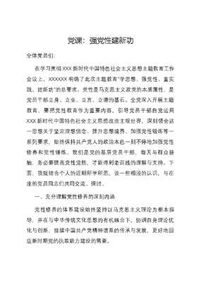 党课:强党性建新功全体党员们:在学习贯彻XXX新时代中国特色社会主义思想主题教育工作会议上,XXXXXX明确了此次主题教育学思想、强党性、重实践、建新功的总要求。党性是马克思主义政党的本质属性,是党员干部立身、立业、立言、立德的基石。全党深入开展主题教育,要把党性教育作为重要内容,引导党员干部自觉运用XXX新时代中国特色社会主义思想改造主观世界,深刻领会这一思想关于坚定理想信念、提升思想境界、加强党性锻炼等一系列要求,始终保持共产党人的政治本色一刻不停地加强党性修养和党性锤炼。我们是党的基层党员干部,每天与群众接触,务必要提高党性觉悟,才能得到老百姓的理解与支持。下面,我就结合个人的近期所学所思,谈一些粗浅的认识,与在座的党员同志们共同交流、探讨。一、充分理解党性修养的深刻内涵党性修养的体系建设始终坚持以马克思主义理论为根本指导,并在与中华传统文化思想的有机融合下,协调自身理论优化与创新,接续中国共产党精神谱系的传承与发展,更好地回应新时期党的执政能力建设的需要。1945年4月,毛泽东同志在党的七大上指出:讲到个性与党性,党性就是普遍性,个性就是特殊性。没有一种普遍性不是建在特殊性的基础上的。没有特殊性哪里有普遍性?没有党员的个性,哪里有党性一致的行动,一致的意见,集体主义,就是党性。每名党员在大是大非面前,在党的原则、纪律面前,要毫不犹豫地讲党性;在党的利益、人民的利益与个人利益发生矛盾时,必须坚持党的利益、人民利益至上。同时,讲党性并非否定个性,而是要在遵守党章、服从党的决议、遵守党的纪律、维护党的团结的前提下,尊重每名党员的个性和党章赋予的权利,充分发挥党员的主动性、创造性。正如毛泽东同志强调的:其实人有各种各样的,只要他服从党纲、党章、党的决议,在这个大原则下,大家发挥能力就行了。讲清楚这一点,对于党的进步,对于全体党员积极性的发挥是会有好处的。2015年12月11日,XXXXXX指出:党性教育是共产党人修身养性的必修课,也是共产党人的心学。可以说,强党性的关键环节就是修炼好共产党人的心学,通过走心的方式做到内外兼修,既处心有道,又行己有方。为人民谋福祉,为民族谋复兴,是一代代共产党人砥砺奋进的初心和使命,也是对党性原则的高度概括。党性修养作为党性建设的根基,接续着中国共产党精神谱系的核心要义,传承着百年来中国共产党的价值理念,凝聚起实现国家富强和人民富裕的民族力量,内化为一代代共产党人的修为涵养与精神品格。二、注重加强个人党性修养1.加强理论修养。XXXXXX在中央党校建校90周年庆祝大会暨2023年春季学期开学典礼上的重要讲话中强调:理论修养是领导干部综合素质的核心,理论上的成熟是政治上成熟的基础,政治上的坚定源于理论上的清醒。这要求领导干部持续深化理论学习、提升理论素养、强化理论思维、注重理论转化,以理论上的清醒筑牢政治上的坚定,以思想自觉引领行动自觉。一方面,要以史为鉴增强理论修养。理论学习是普遍且永久的,不仅要学习革命的理论还要学习民族的历史知识,并以马克思主义的方法加以批判地总结,成为马克思主义的历史主义者。同时,要学会运用马克思主义的立场观点方法,结合古今中外历史的发展,研究中国共产党治国理政的探索史、奋斗史、创业史和发展史。另一方面,要与时俱进地学习和运用马克思主义中国化的理论成果。2.加强政治修养。旗帜鲜明讲政治这始终是党的政治组织建设的首要任务和发展方向,是衡量党性修养的关键环节。一讲对党和人民忠诚,拥护党的纲领,履行党员义务,执行党的决定。二讲严明党纪,遵守党的章程,严守党的纪律,保守党的秘密。三讲政治信仰,坚持正确政治方向,坚持思想统一,站稳人民立场,做好政治规矩表率。四讲政治能力,心系大局,居安思危,增强政治敏锐性和政治鉴别力。五讲政治教育,增强四个意识,坚定四个自信,做到两个维护,提高战斗力,发扬党的优良传统和政治优势。3.加强作风修养。严肃工作纪律,坚守正道、弘扬正气,对党的执政建设至关重要。一方面要注重加强密切联系群众的作风,始终坚持人民至上,与民情感互通,保民生促发展,把党的方针政策落到实处,坚定不移地保障最广大人民的根本利益,就像我们一直以来强调的党员联户工作,就是要求大家深入群众去,认真了解群众真实需求。另一方面要保持好批评和自我批评的作风,这是中国共产党在革命时期提升党性修养的理论独创,是实现自我革命的具体体现,是保持谦虚、谨慎、不骄不躁、艰苦奋斗的行为准则,我们要继承和发扬党的传统优良作风,以新时期执政队伍建设的新要求,加强党性锻炼,实现新形势下党员的自我更新、自我改造和自我完善。三、以实际行动强党性建新功本次主题教育以学习贯彻党的创新理论为主题,以学习为起点,更以贯彻为重点。无论是总要求、根本任务