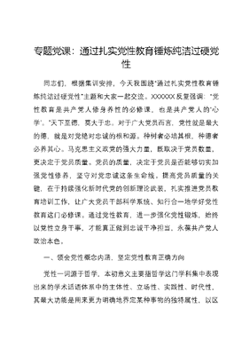 专题党课:通过扎实党性教育锤炼纯洁过硬党性同志们,根据集训安排,今天我围绕通过扎实党性教育锤炼纯洁过硬党性主题和大家一起交流。XXXXXX反复强调:党性教育是共产党人修身养性的必修课,也是共产党人的心学。天下至德,莫大于忠。对于广大党员而言,党性就是最大的德,就是对党绝对忠诚的根和源。种树者必培其根,种德者必养其心。马克思主义政党的强大力量,既取决于党员数量,更决定于党员质量。党员的质量,决定于党员是否能够切实加强党性修养,坚守对党忠诚这条生命线。提高党员质量的关键,在于持续强化新时代党的创新理论武装,扎实推进党员教育培训工作,让广大党员干部科学系统、知行合一地学好党性教育这门必修课。通过党性教育,进一步强化党性锻炼,始终以党性立身干事,才能真正做到忠诚干净担当,永葆共产党人政治本色。一、领会党性概念内涵,坚定党性教育正确方向党性一词源于哲学,本初意义主要指哲学这门学科集中表现出来的学术话语体系中的主体性、立场性、实践性、时代性,其最大功能是用来更为明确地界定某种事物的独特属性,以区别于同类的其他事物,体现出普遍性与特殊性的内在逻辑关系。正是因为这种独特的指代有效性,党性逐渐被发展用来作为区分唯物主义与唯心主义的有效判断工具。后来,党性被人们广泛用来指代政党的党性,也就是政党的本质属性,是阶级性最高而集中的表现,是一个政党的生命所系、力量所在。党性有双重内涵,一是指政党的党性,二是指党员的党性。政党的党性表明一个政党是什么,从本源上深刻诠释了这个政党我是谁、为了谁、依靠谁,指明了这个政党的阶级基础和群众基础,是一个政党区别于其他政党最显著的标志和特征。党员的党性是政党的党性在党员身上的具体体现和生动实践,表现在党员的信仰信念、担当作为、意志品质、作风本质等方方面面,体现在学习、工作和社会生活的具体实践中。马克思主义政党领导的斗争实践证明,过去的一切运动都是少数人的,或者为少数人谋利益的运动。无产阶级的运动是绝大多数人的,为绝大多数人谋利益的独立的运动,在当前的运动中同时代表运动的未来,而没有任何同整个无产阶级的利益不同的利益。马克思主义政党自觉地认定自己是人民群众在特定的历史时期为完成特定的历史任务的一种工具。作为马克思主义政党,中国共产党是中国工人阶级的先锋队,同时是中国人民和中华民族的先锋队,是中国特色社会主义事业的领导核心,代表中国先进生产力的发展要求,代表中国先进文化的前进方向,代表中国最广大人民的根本利益。党的最高理想和最终目标是实现共产主义。中国共产党的党性,构成共产党人的内在硬核。作为人民的政党,中国共产党从创立时就把为人民谋利益作为自身的奋斗目标,将自身的理想信念、目标追求、政策决策和具体行为与党的宗旨紧密联系起来,始终代表最广大人民根本利益,与人民休戚与共、生死相依,没有任何自己特殊的利益,从来不代表任何利益集团、任何权势团体、任何特权阶层的利益。为此,广大党员的任何言行都必须体现人民的意志、代表人民的意愿、维护人民的利益、赢得人民的信任,自觉地作为人民实现自身利益的特殊工具来开展一切活动,而不谋取任何私利,从而真正成为人民利益的忠实代言人。党性教育的目的,就是要教育引导广大党员加深对中国之路、中国之治、中国之理的深刻认识,坚定中国共产党的领导不动摇、坚定中国特色社会主义道路不动摇、坚定党的根本宗旨不动摇、坚持中华民族伟大复兴不动摇,为实现共产主义远大理想奋斗终身。二、明确党性根本标准,体现党性教育学习要求中国共产党党员是中国工人阶级的有共产主义觉悟的先锋战士。中国共产党党员必须全心全意为人民服务,不惜牺牲个人的一切,为实现共产主义奋斗终身。《中国共产党章程》关于党员的定义,内含了对共产党员的政治性和价值性、阶级性和人民性、先进性和纯洁性、革命性和斗争性、组织性和纪律性、科学性和实践性的要求,是加强党性修养的根本标准,有利于锻造有信仰有信念有担当有使命的强大政党。党的先进性和纯洁性是中国共产党人的政治灵魂,也是任何一个共产党员加强党性修养、安身立命的根本。加强党性修养,坚定理想信念,是切实解决好任何一个共产党人世界观、人生观、价值观这个总开关问题的钥匙,是推进中国特色社会主义事业的发动机。这就要求我们必须始终保持党的先进性和纯洁性,保持党员素质的先进、党的理论的先进和党的实践的先进。评价党性标准主要应包含如下几个方面的内容,即政治立场坚定、理想信念崇高、工作态度务实、为民鞠躬尽瘁、执政廉洁干净。新时代中国共产党人只有持之以恒地进行党性修养锤炼、坚定理想信念,才能锻造成为引领人民群众追求美好生活的主心骨。党性教育是一个有机的整体,更是一个长期锤炼的过程,需要全体共产党员付出艰辛的努力才能达到纯而又纯的两个先锋队的内在要求。因为,