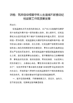 讲稿:筑牢信仰根基守牢人生底线不断推动纪检监察工作高质量发展同志们:纪检监察机关作为党的政治机关,从产生之日起就担负维护党中央权威和集中统一领导的重大使命。进入新时代,纪检监察机关自觉担负起两个维护的特殊使命和重大责任,党的团结统一更加巩固。纪检监察机关维护党中央权威和集中统一领导的初心使命一脉相承、历久弥坚。纪检监察干部要更加深刻领悟身上肩负的特殊职责和光荣使命,更加主动担负起推进全面从严治党的历史责任。青年纪检监察干部是纪检监察系统的生力军,是纪检监察事业的接班人,要不断提升自己的精神境界,要有真抓的实劲、敢抓的狠劲、常抓的韧劲,当好党和人民的忠诚卫士,永葆初心本色。要坚决扣好廉洁从政的第一粒扣子,切实把苦练干事本领作为克服本领恐慌的应有姿态和内生动力,把艰苦奋斗拼搏作为纪检监察青年干部的青春底色和优良作风,努力锻造堪当时代重任的纪检监察铁军。一、筑牢信仰的根基,不断锤炼意志力、坚忍力、自制力,坚守政治红线、纪律高压线和廉洁底线志气是志向、价值取向,是党员干部干事创业的根和魂。纪检监察干部使命光荣、责任重大,要筑牢信仰之基、补足精神之钙、把稳思想之舵,以坚定的理想信念砥砺对党的赤诚忠心,涵养矢志报国的浩然正气。要筑牢信仰之基、补足精神之钙、把稳思想之舵,在山雨欲来风满楼的形势考验中永葆越是艰险越向前的担当精神,从纪检监察先辈们的手中接过打虎拍蝇接力棒,以坚定的步伐、昂扬的斗志在反腐败斗争中愈战愈勇。第一,坚持以XXX新时代中国特色社会主义思想凝心铸魂,以理论上的清醒保证政治上的坚定。坚持把XXX新时代中国特色社会主义思想作为改造主观世界和客观世界的强大思想武器,坚持读原著、学原文、悟原理,全面把握其科学体系、精髓要义、实践要求,贯通把握其世界观方法论和贯穿其中的立场观点方法,深刻把握道理学理哲理,做到知其言更知其义、知其然更知其所以然。自觉运用两个结合、六个必须坚持观察时代、把握时代、引领时代,不断深化对共产党执政规律、社会主义建设规律、人类社会发展规律的认识,全面深刻理解中国共产党能、中国特色社会主义好、马克思主义行的整体逻辑,把马克思主义的科学真理性、中国特色社会主义的巨大优越性、中华民族伟大复兴的历史必然性紧密结合、贯通掌握,切实筑牢信仰之基、补足精神之钙、把稳思想之舵,不断增强道路自信、理论自信、制度自信、文化自信,为强国建设、民族复兴坚定必胜信心、注入强大动能。第二,把牢政治方向,确保党中央决策部署和XXXXXX重要指示要求不折不扣落到实处。纪检监察干部肩负着维护党中央权威和集中统一领导的重大使命,是两个维护的忠实践行者和坚定捍卫者,必须深刻领悟两个确立的决定性意义,始终胸怀国之大者,突出政治监督首责,善于用政治的眼光看待问题、识别本质、明辨是非,善于从业务看政治、从问题看责任、从成效看作风,及时校正偏差。要把XXX新时代中国特色社会主义思想作为看家本领,深刻领会党中央重大战略决策部署背后的政治考量,更加坚定中国特色监督体系制度自信,更加坚定不移完善党和国家监督体系,更加坚定不移推进全面从严治党,更加坚定不移推进反腐倡廉,确保纪检监察工作始终沿着XXXXXX指引的方向坚定前行。第三,践行初心使命,持续整治群众身边腐败和作风问题,提升人民群众的获得感、幸福感、安全感。纪检监察工作必须坚持人民至上的根本立场和价值取向,牢固树立以人民为中心的发展思想,紧紧抓住人民群众最关心最直接最现实的利益问题,盯住民生领域的热点、难点问题,持续推进民生领域问题专项整治,监督保障党中央惠民政策落地见效,持续整治群众身边腐败和作风问题,提升人民群众的获得感、幸福感、安全感。要在学思践悟中牢牢把握这一思想蕴含的根本政治立场,深刻体悟XXXXXX我将无我、不负人民的崇高精神境界,树牢群众观点、践行群众路线,始终同人民同呼吸、共命运、心连心。牢记让人民生活幸福是国之大者,坚持执纪执法为民、纠风治乱为民,凡是群众反映强烈的问题都要严肃认真对待,凡是损害群众利益的行为都要坚决纠正,深入开展乡村振兴领域不正之风和腐败问题专项整治,严肃惩治就业创业、教育医疗、养老社保、生态环保、食品药品安全等领域的腐败,推动解决群众急难愁盼问题,始终保持党同人民群众的血肉联系,不断厚植党长期执政的政治根基和群众基础。二、守牢人生的底线,不断提高依规依纪依法履职能力,练就敢于斗争、善于斗争的硬脊梁、铁肩膀、真本事纪检监察干部作为监督别人的人、执纪执法的人,必须始终保持自身干净,始终保持赶考的清醒,保持对腐蚀、围猎的警觉,自觉接受最严格的约束和监督,坚决防止家人、亲属利用纪检监察干部影响谋取私利,持续整治灯下黑。要时刻保持政治清醒,把纪律挺在前面,注重自我提升,做守纪律、讲规矩的表率
