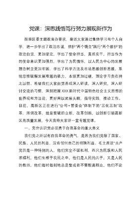 党课:深思践悟笃行努力展现新作为按照区委主题教育办要求,最近大家通过集体学习和个人自学,进一步学出了政治忠诚,拥护两个确立践行两个维护的政治自觉,更加坚定,学出了使命担当,真抓实干,担当作为的使命意识更加强烈,学出了为民情怀,以人民为中心的发展理念树立更加牢固,学出了科学方法及市场思维创新思维,系统思维破解发展难题的能力,本领更加过硬,理论学习贵在持之以恒。希望我们大家自觉养成深入研读,深入研究,深入研讨交流的习惯,深刻把握XXX新时代中国特色社会主义思想的世界观和方法论,更好用以武装头脑,指导实践,推动工作。目前,高新区正在进行公司+管委会体制下的三化三制改革,所谓改革,就是要破旧立新,改革创新,以创新引领高新区高质量发展,今天我给大家讲一堂专题党课。一、充分认识党必须勇于自我革命的重大意义我们党之所以有自我革命的勇气,是因为我们党除了国家、民族、人民的利益,没有任何自己的特殊利益。毛主席说共产党员是一种特别的人,他们完全不谋私利,而只为民族和人民求福利,他们生根于农民之中,他们是人民的儿子,又是人民的教师,他们每时每刻地总是警戒着不要脱离群众,他们不论遇着何事总是以群众的利益为考虑问题的出发点,因此他们就能获得广大人民群众的衷心拥护,这就是他们的事业必然获得胜利的根据无私者,可量以为政。不私,而天下自公。回顾党的百年历史,从1921年7月红船摇篮,到南昌起义,秋收起义,广州起义,井冈会师,三湾改编,湘西战役,遵义会议,四渡赤水,突破乌江,飞夺泸定桥,强渡大渡河,爬雪山,过草地,突破腊子口,三大主力会师,西安事变,瓦窑堡会议,国共合作全面抗战,党的七大确立毛泽东思想作为党的指导思想;社会主义建设时期,1978年开始拨乱反正转入以经济建设为主,实施改革开放。特别是党的十八大以来,面对百年未有之大变局和全球经济下滑的压力,以XXX同志为核心的党中央率领全党和全国各族人民团结奋斗,开拓创新,取得了举世瞩目的伟大成就,我国成为世界第二大经济体屹立在世界的东方。走过的每一段艰辛的路,都无不从失败中汲取教训跌倒了爬出来,总结经验重整行装再出发。彰显了一个百年大党勇于刀刃向内,割骨疗毒,自我革命的博大胸襟。二、笃行足下,不断提高自己的思想政治素质和业务水平(一)找准定位,明确责任。高新区推行管委会+公司模式的关键在于去行政化,强化以企业为中心的服务功能,为园区企业创造一流的营商环境。围绕这个改革方向,营商保障工作要更加明确自己的核心服务对象就是园区企业,核心定位就是要为园区企业保驾护航,通过制度性的安排,专业化的服务,贴心型的关怀,让企业在高新区可以放心投资、专心创业、安心发展,为高新区高质量发展提供有利营商环境。(二)摸清底数,建立台账。结合助企活动,尽快建立全区规模以上企业台账,掌握企业的生产地址、企业规模、经营范围、特色拳头产品、外贸内销概况等基本信息,做到心中有数,才能与企业进行有效交流。成立由分包区县级领导牵头的工作协调专班,收集企业反映的各种问题、项目建设需要协调解决的疑难问题。充分发挥智慧社区的创新平台作用,建立企业服务微信公众号,搭建企业家宣传和信息交流平台,学会与企业家交朋友,所谓的交朋友不是泛泛的吃吃喝喝烟酒朋友,而是企业在生产经营中遇到实际困难时,可以不用犹豫地直接给你打电话进行求助,做企业家可以信赖的朋友。作为长期与企业打交道,必须进一步提升政治站位,胸怀全局,想企业所想、急企业所急,才能赢得尊重,建立起既贴心又清朗的政商关系。(三)建立制度,强化服务。规范企业退出机制。企业无论以哪种方式退出都是市场经济的正常现象,诸如高新区现有一定数量的待重组及破产企业,存在大量的闲置厂房,如何依法收回和盘活企业闲置用地是个亟待解决的问题。法治工作的核心是既要保障经营者正当合法的权益不受侵害,让企业利益相关者尤其是员工的利益得到维护,妥善处置好员工的问题,更要加大招商力度,盘活用好闲置用地,把大项目摆进去,使企业焕发生机,让土地发挥更大效益,维护经济社会的稳定。优化公共法律服务供给,提供专业法律服务。在管委会层面设立企业法律顾问小组,为管委会和公司在招商引资,项目落地等决策提供法律服务保障,同时可以为企业免费提供相关法律咨询服务,帮助企业健全内控机制,加强合规工作,规避经营风险,尽量避免经济诉讼;加强对涉企案件法律监督,在企业遇到经济纠纷进行诉讼时,及时协调法院尽可能在法定时间最短时间内进行立案、判决,尽可能减少因诉讼给企业带来的司法干扰。(四)完善措施,提质增效。继续落实好企业安静生产日制度,除大气污染防治、环保和安全生产例行检查外,任何单位,未经区主管部门同意,不得找借口到企业乱检查、乱摊派干扰和影响企业正常的生产经营秩序。为企业提供一个科学有序安全的周边营商环境,保证企业合法经营权益免受