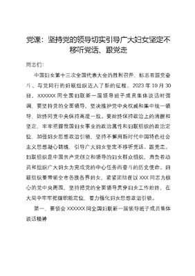 党课:坚持党的领导切实引导广大妇女坚定不移听党话、跟党走同志们:中国妇女第十三次全国代表大会的胜利召开,标志着跟党奋斗、与党同行的妇联组织迈入了新的征程。2023年10月30日,XXXXXX同全国妇联新一届领导班子成员集体谈话时强调,要坚持党的全面领导,坚决维护党中央权威和集中统一领导,始终同党中央保持高度一致。要始终保持政治上的清醒和坚定,牢牢把握我国妇女事业的政治属性和妇联组织的政治定位,加强妇女思想政治引领,坚持不懈用新时代中国特色社会主义思想凝心铸魂,引导广大妇女坚定不移听党话、跟党走。妇联组织是中国共产党创立和领导的妇女群众组织,肩负着动员和组织广大妇女为完成党的中心任务而奋斗的历史使命。妇联组织要带领全市各族各界妇女,紧紧团结在以XXX同志为核心的党中央周围,坚持把党的全面领导贯穿妇女工作始终,在大局中牢牢把握职能定位,着力强化妇女思想政治引领。第一,要领会XXXXXX同全国妇联新一届领导班子成员集体谈话精神党政军民学、东西南北中,党是领导一切的。坚持党的领导,是做好党的妇女工作的根本保证,只有坚持党的领导,才能胜利完成妇联组织的职责使命。妇女事业和妇联工作要始终坚持正确政治方向,与党同心同行。妇女事业和妇联工作要始终坚持正确政治方向,与党同心同行。新时代妇女工作坚持党的领导,既是沿着正确政治方向前进的原则彰显,更是我们党的性质和初心使命所系。举旗定向,行向远方。妇联组织要不断提高政治判断力、政治领悟力、政治执行力,胸怀国之大者,确保把坚持党的全面领导作为最高政治原则,自觉贯彻落实到妇联工作全过程各方面。这关系到凝聚中国社会发展半边天的巾帼智慧和力量,使命光荣、责任重大。妇女事业和妇联工作要加强妇女思想政治引领,与党同声共气。政治上的坚定源于思想上的坚定。新时代妇女事业取得历史性成就,根本在于以XXX同志为核心的党中央掌舵领航,在于XXX新时代中国特色社会主义思想的科学指引。妇女价值观念日趋多样化,妇联组织必须增强四个意识,坚持不懈用XXX新时代中国特色社会主义思想凝心铸魂,引导妇女群众向着建设社会主义现代化强国的百年目标不断奋进。妇女事业和妇联工作要贯彻党的XX大战略部署,与党同频共振。党的十八大以来,从决战脱贫攻坚的第一线到科技创新的最前沿,从抗击传染病的逆行者到作为乡村振兴的领头雁,广大妇女以自尊自信自立自强的新时代女性风貌积极投身于中国特色社会主义事业。党的XX大报告提出以中国式现代化全面推进中华民族伟大复兴,确定了新时代新征程党的中心任务。妇联必须紧紧围绕党的中心任务发展妇女事业、开展妇女工作、履行妇联职能,凝聚广大妇女奋进新征程的磅礴力量。妇联组织和妇联工作要切实发挥桥梁纽带作用,与党同心协力。XXXXXX指出,群众性是群团组织的根本特点。妇联组织的根本任务是联系和服务广大妇女,真正做到妇女在哪里,妇联组织和妇联工作就延伸到哪里,既要注重妇女的个体诉求,也要深入了解不同妇女群体的所思所想所盼所求;既要注重各领域影响大的妇女工作,也要注重基层妇女工作,从中发现共性需求和普遍性问题,解决妇女群众急难愁盼问题,不断推动妇女事业顶层设计更加完善。妇联组织和妇联工作要整合党内外力量,与党同休共戚。各级党委要坚持党管妇女工作原则,为妇联组织开展工作提供支持、创造条件。妇女工作是一项涉及多部门、各层面、宽领域的系统工程,必须形成社会合力,以上下联动、齐抓共管、协同推进的工作局面,以党委领导、政府主责、妇儿工委协调、多部门合作、全社会参与的妇女儿童工作机制,推进妇女全面发展取得更为明显的实质性进展,推动形成尊重和关爱妇女、关心妇女事业、支持妇女工作的良好社会环境。第二,要把握新时代坚持和加强党对妇女工作的全面领导的重大意义坚持党的领导是做好党的妇女工作的根本保证,是妇女事业发展的立身之本。党的十八大以来,党对妇女工作的领导全面加强,对促进妇女全面发展、依法保障妇女权益作出一系列重要战略安排,为做好新时代妇联工作提供了坚强政治保证。坚持和加强党对妇女工作的全面领导是实现中国特色妇女发展道路的根本保证。道路决定命运。要坚定不移走中国特色社会主义妇女发展道路,组织动员广大妇女为中国式现代化建设贡献巾帼力量。党的XX大擘画了以中国式现代化全面推进强国建设、民族复兴的宏伟蓝图。中国特色社会主义妇女发展道路植根于中国的历史与现实。XXXXXX指出,要紧紧围绕贯彻落实党的XX大的战略部署,找准工作着力点,把党中央决策部署转化为妇联工作的具体任务。这将指引新时代中国妇女事业与中国式现代化建设、民族复兴的伟业同步发展,从而开辟出一条中国特色妇女解放之路。坚持和加强党对妇女工作的全面领导是妇女运动走向更大胜利的根本保证。纵观历史,没有妇女解放和进步,就没有人类解放和进步。实现性别平等与妇女解放始终贯穿在党的历史