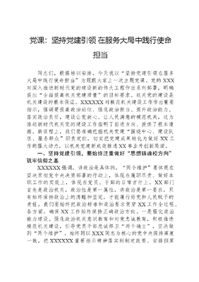 党课:坚持党建引领 在服务大局中践行使命担当同志们,根据培训安排,今天我以坚持党建引领在服务大局中践行使命担当为题跟大家上一次主题党课。党的XXX对深入推进新时代党的建设新的伟大工程作出系列部署,明确提出全面提高机关党建质量的目标要求。机关党的建设是机关建设的根本保证。XXXXXX对模范机关建设工作作出重要指示,强调要提高政治站位、强化政治担当、提升政治能力、落实政治责任,建设让党放心、让人民满意的模范机关,这为推动新时代机关党的建设工作指明了前进方向、提供了根本遵循。新征程上,我们要准确把握机关党建围绕中心、建设队伍、服务群众职责定位,切实把党建成果转化为做好XX工作的强大动力,以机关党建新成效推进XX事业开创新局面。一、坚持党建引领,要始终注重做好思想铸魂校方向筑牢信仰之基XXXXXX强调,讲政治是具体的,两个维护要体现在坚决贯彻党中央决策部署的行动上,体现在履职尽责、做好本职工作的实效上,体现在党员、干部的日常言行上。XX部门首先是政治机关,政治性是第一属性,讲政治是第一要求,只有始终保持政治上的清醒和坚定,才能履行好党和人民赋予的责任。我们要始终把政治标准和政治要求贯穿XX工作全过程、各方面,确保XX工作始终保持正确政治方向。一是强化政治能力建设。强化政治机关意识教育和对党忠诚教育,积极推进模范机关建设,引导党员干部忠诚捍卫两个确立,坚决做到两个维护,始终同以XXX同志为核心的党中央保持高度一致,把XXXXXX重要指示精神落实到制定政策、安排预算收支、推进XX改革等工作中,坚决做到财随政走、政令财行。二是深化理论学习武装。坚持用XXX新时代中国特色社会主义思想凝心铸魂,严格执行第一议题制度,抓好理论学习中心组学习,实施青年理论学习提升工程,及时跟进学习XXXXXX重要讲话和重要指示批示精神,巩固拓展以学铸魂、以学增智、以学正风、以学促干长效机制,不断提升政治能力和履职本领。三是严守政治纪律规矩。严明政治纪律和政治规矩,严肃党内政治生活,严格执行党内法规和各项纪律规定,以铁的纪律确保党中央政令畅通、令行禁止。始终坚持严的主基调不动摇,扎实做好巡视发现问题整改,常态化开展政治性警示教育,聚焦预算安排、债务管理、政府采购等重点领域,认真梳理权力运行廉政风险点,完善XX内控制度体系,严肃财经纪律,扎紧扎牢制度笼子。二、坚持党建引领,要始终注重做好夯实基础强支部凝聚进取之力XXXXXX指出,要把基层党组织建设成为有效实现党的领导的坚强战斗堡垒。基层党组织是党的全部工作和战斗力的基础,只有基层党组织坚强有力、党员先锋模范作用充分发挥,党的根基才能牢固,干事创业才有动力。要坚持大抓基层的鲜明导向,持续夯基固本,推动基层党组织全面进步、全面过硬。一是夯实基层基础,着力增强组织力。深入推进党支部标准化规范化建设,实施政治领航、理论提升、强基固本、正风肃纪、创先争优五项工程,开展四强党支部创建活动,着力提升基层党组织政治功能和组织功能。加强支部书记和党务干部教育培训,通过系统轮训、述职测评、任职谈话等方式压实主体责任、提升履职能力。拓展联学共建工作机制,加强纵向横向交流,推动党建与业务深度融合。二是深化锤炼党性,着力增强凝聚力。深入开展党章党规党纪教育,组织主题党日、XX微党课、青年干部交流展示系列活动,筑牢对党忠诚之魂。用好红色资源,到红色教育基地研学跟训,接受思想洗礼。加强实践锻炼,让党员干部在乡村振兴等艰苦一线和重大攻坚中淬火磨砺,增长真才实学。三是建强党员队伍,着力增强战斗力。坚持运动场上选冠军,树牢重实干、重实绩、重担当的鲜明导向,发挥量化考核指挥棒作用,不断激发党员干部内生动力。抓好干部培养,实施XX干部专业能力提升工程,线上线下、分层分批组织系统化专业化培训,及时补齐短板、提升素质。坚持典型引路,广泛开展两优一先双十佳优秀人才等选树活动,推动党员干部对标先进、争先创优。三、坚持党建引领,要始终注重做好党建赋能促融合勇担使命之责XXXXXX强调,要围绕中心抓党建、抓好党建促业务,坚持党建工作和业务工作一起谋划、一起部署、一起落实。向中心聚焦、为群众办事,是机关党建的职责所在。要充分发挥党建工作在业务工作中的政治引领、督促落实、监督保障作用,促进党建业务深度融合、相互贯通,形成党建、业务一盘棋。一是围绕中心促融合。把讲政治的要求落实到业务工作中,把抓中心工作完成、重大任务落实作为检验党建工作质量的试金石,助推重大战略实施。紧扣贯彻落实党中央重大战略和省委部署要求,围绕协同发展、新区建设、科技创新、产业转型、乡村振兴、生态环保等中心工作,打好政策资金组合拳,强化重大战略任务财力保障,以XX担当助推大事要事落地见效。二是转变作风促融合。把改进作风作为优化