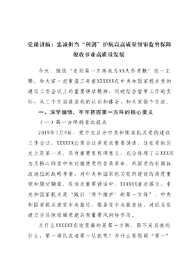 党课讲稿:忠诚担当利剑护航以高质量督审监督保障税收事业高质量发展今天,围绕走好第一方阵我为XX大作贡献这一主题,和大家一起重温三年前XXXXXX在中央和国家机关党的建设工作会议上的重要讲话精神,同时结合督审工作的实际,从三个方面谈谈我的认识和体会,和大家做个交流。一、深学细悟,牢牢把握第一方阵的核心要义(一)第一方阵的首次提出2019年7月9日,党中央召开中央和国家机关党的建设工作会议,XXXXXX出席会议并发表重要讲话,这在党的历史上是第一次,具有重要里程碑意义,充分体现了以XXX同志为核心的党中央对推进党的自我革命、巩固党的长期执政地位的战略考量,对中央和国家机关党的建设的高度重视和殷切期望。在这次重要讲话中,XXXXXX首次提出,中央和国家机关是践行两个维护的第一方阵,中央和国家机关离党中央最近,服务党中央最直接,对机关党建乃至其他领域党建具有重要风向标作用。为什么XXXXXX在这里提的是第一方阵,而不是其他的什么,第一梯队或者第一队伍呢?为什么要强调第一呢?我们先来探讨一下第一方阵的定义。(二)第一方阵的概念及主要属性方阵一词,最早是源于古代军队作战时的一种队形,是智谋与力量的结合。据古代兵书《六韬·均兵》记载,古代不列阵的单个士兵,如果车骑使用不当,一名骑兵抵挡不了一名步兵,如果全军布列成阵,配合得当,则骑兵可以与八倍数量的步兵抗衡。因此,方阵的出现,可以说是兵法发展史上的一次飞跃,是智慧战胜蛮力的标志一支指挥有力、配合默契且敢打、能打、善打硬仗的队伍才能成为第一方阵。那么,第一方阵有些什么属性呢?我们可以联想阅兵式中打头阵的三军仪仗队和领导指挥方队。这个第一方阵有什么特点属性呢?我个人认为主要有三点。首先,它作为一个方阵,不管是横向看,还是纵向看,一定是整整齐齐的。为什么这么齐?因为齐则有序,齐则有效齐则有力。为什么第一个亮相?因为堪称表率,是标杆,更是引领。一方面,这个方阵离指挥核心最近,它对上级指令领会得最清楚、最精准、最深刻,因此,它必须时刻及时、准确地传递上级指令,必须率先喊出看齐口令另一方面,这个方阵对整个队伍起到引领示范的作用,只文可居文库——海量学习资料,手机电脑均可下载www.wenkeju.com有它率先向指挥核心看齐,整个队伍才能以此为标杆,同步向指挥核心看齐,上级的指令传递才不会递减失真。如果一个队伍锣齐鼓不齐,是无法称之为方阵的,那它更不可能靠前指挥,成为引领整个队伍作战的第一方阵。因此,看齐意识,是第一方阵的基础属性。其次,它在前进的过程中,始终是作为一个整体、一个系统的,协同发力才有最大值,步调一致才能得胜利,否则它就无法达到作战能力最大化,更不可能顺利完成目标。因此,协同共进是基于看齐意识衍生的第二个基础属性。最后,第一方阵是走在队伍最前面的先锋部队,它能够逢山开路,遇水架桥,引领整个大队伍,踏平坎坷成大道。这是第一方阵的关键属性——敢为人先。第一方阵必须坚持创新,保持先进,以不竭动力确保自身始终处在第一的领先位置。(三)走好第一方阵的极端重要性作为中央和国家机关,作为总局机关,作为督察内审司,我们为什么要走好第一方阵?可以从三个层面来理解和把握:第一,深刻认识中央和国家机关的政治属性。XXXXXX指出,中央和国家机关首先是政治机关,必须旗帜鲜明文可居文库——海量学习资料,手机电脑均可下载www.wenkeju.com讲政治,坚定不移加强党的全面领导,坚持不懈推进党的政治建设。如果党的理论和路线方针政策在这里失之毫厘,到了基层就可能谬以千里;如果贯彻落实的第一棒就掉了链子,两个维护在最先一公里就可能落空。这就决定了,中央和国家机关必须坚定不移地走好第一方阵。第二,深刻认识总局机关的政治属性。总局机关是税务系统和税收领域贯彻落实党的路线方针政策和党中央、国务院决策部署的起跑点第一棒,必须把加强党的全面领导贯穿于税收工作各方面、全过程,把服从和服务于党和国家工作大局、服务国家战略作为自身的根本任务。同时,税务系统属于垂直管理,抓机关带系统的任务很重,也很具体。作为全国税务系统的司令部,总局机关不仅是税收业务工作的主管机关,更是统领百万税务大军的政治领导机关,只有以上率下,以最高的标准、最严的标尺、最实的举措来推进自身的政治建设,才能为全国税务系统立标杆、当表率、作示范。第三,深刻认识督察内审部门的政治属性。督审部门具有职能监督部门和党建部门的双重属性,在做好贯彻党中央、国务院重大税收决策部署落实情况的监督工作的过文可居文库——海量学习资料,手机电脑均可下载www.wenkeju.com程中,必须时刻对标对表,坚定不移地纠正政策落实偏差在协助总局党委加强