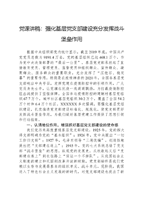 党课讲稿:强化基层党支部建设充分发挥战斗堡垒作用根据中央组织部党内统计显示,截至2019年底,中国共产党党员总数为9191.4万名,党的基层组织已达468.1万个,作为党中央决策部署的最后一公里,基层党支部承担起了直接教育党员、管理党员、监督党员和组织群众、宣传群众、凝聚群众、服务群众的重要职责,充分发挥了压舱石、稳定器的重要作用。特别是在疫情肆虐的2020年,全国各基层党支部响应中央号召,发挥党建在疫情防控中的引领作用,广大党员身先士卒,让党旗在抗疫一线高高飘扬,为打赢疫情防控阻击战提供了坚强保障。全国参与疫情防控的建制村基层党组织67.7万个,城市社区基层党组织30.2万个,覆盖了全国54.2万个村和6.4万个社区。XXXXXX多次强调,要强化基层党组织建设,扎实推进党支部建设标准化、规范化,使党支部更好发挥战斗堡垒作用,为我们做好基层党建工作提供了思想引领和行动指南。一、认清地位作用,增强抓好基层党支部建设的使命感我们党历来高度重视基层党支部建设。1925年,党的四大将支部明确为党的基本组织;1926年,党中央提出一切工作归支部;1927年,毛泽东领导三湾改编,创造性地提出把支部建在连上;1945年,党的七大系统总结了党支部战斗堡垒的思想。纵观党的发展史,从秋收起义后支部建在连上到长征路上保证一个不掉队,从我国社会主义制度的建立和巩固到改革开放新时期,党支部始终是我们党赖以生存与发展最基本的组织单元、战斗单元。现阶段,我国进入了特色社会主义发展的新时代,对党支部建设也提出了新命题。XXXXXX指出,基础不牢,地动山摇。基础就是党支部,上面千条线、下面一根针,必须夯实基层。党支部建设直接关系基层党建工作质量,要以严的精神、实的作风抓好,把新时代基层党建工作提升到一个新水平。二、抓基层打基础,持之以恒推进党支部建设规范化加强党支部建设必须注重继承和发扬党的优良传统,落实全面从严治党的要求、推动基层党组织建设全面进步、全面过硬,坚持实抓严抓党支部建设标准化、规范化,要把加强思想政治工作,教育管理党员工作,服务广大群众工作落到支部,激活党组织,增强组织力,努力使每个党支部都不断规范起来,为完成新使命新任务提供坚强组织保证。1、抓住关键少数,严格规范党支部书记选任工作。支部强不强,关键看头羊。要坚持以选优、训强、管好基层党支部书记为重点,严格按照政治坚定、素质优良、敢于担当、作用突出的标准,选好配强基层党支部班子,特别是要把那些优秀党员选拔到党支部书记岗位上来。要注重突出领域特色,坚持分类选拔,农村重点从党性强、作风好的致富带头人、外出务工经商人员、复员退伍军人、大学生村官党员中选拔村党支部书记;社区重点从政治素质好、熟悉城市基层社会治理、热心服务群众的党员社区工作者中选拔党支部书记;国有企业重点从讲政治顾大局、讲原则守规矩、懂经营善管理的党员中选拔党支部书记;非公有制经济组织和社会组织重点从思想素质好、熟悉基层党建工作的出资人和经营管理骨干党员中选拔党支部书记;机关、事业单位重点从政治坚定、业务过硬、廉洁奉公、实绩突出、群众公认的党员中选拔党支部书记。同时要通过现场观摩、案例分析、典型宣讲等方式,每年对基层党支部书记进行重点培训。坚持严管和厚爱相结合,落实报酬待遇,打通晋升渠道,让基层党支部书记有干头、有盼头、有奔头,成为振兴发展的基层骨干力量。2、牵住牛鼻子,严格规范基层党建重点任务落实制度。文可居文库——海量学习资料,手机电脑下载www.wenkeju.com牢固树立大抓基层的鲜明导向,牵住责任制这个牛鼻子,要求各级党委认真履行管党治党职责,把抓好党建作为最大的政绩,将党建工作抓具体、抓深入、抓到位,推动党建各项任务落到基层、落到支部。完善市县乡党委书记抓基层党建述职评议考核制度,坚持年初安排部署、年中督查通报、年底检查考核,探索建立基层党建巡察制度,健全承诺、述职、评议、考核、问责常态长效机制。坚持把党建工作重点任务落实到基层,将任务落实情况作为检验党支部建设规范化的重要标尺,每年都提出重点任务、责任清单,明确分工和完成时限,确保以重点任务落实推动党支部建设规范化。3、拧紧总开关,严格规范党员教育管理。遵循党管党员、党管干部的原则,运用党的制度对党员干部进行教育、培养、管理、监督、奖惩等,使党员干部在政治上、思想上、作风上符合党的要求。具体怎么管,就要做到以下几点:一是用正字管住思想。党员干部都是在党领导下工作的,必须把思想政治摆在第一位。首先,要加强思想政治教育,树立正确的世界观、人生观和价值观,保证理想信念不偏航;其次,要通过主题教育、三会一课、专题党日等,加强党性锻炼,提高政治觉悟;再次,要提高防范意识,自觉抵制错误思想侵蚀,坚定政治立场