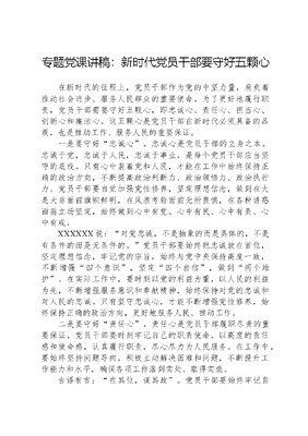 专题党课讲稿:新时代党员干部要守好五颗心在新时代的征程上,党员干部作为党的中坚力量,肩负着推动社会进步、服务人民群众的重要使命。为了更好地履行职责,党员干部需要守好五颗心,即忠诚心、责任心、担当心、创新心和廉洁心。这五颗心是党员干部在新时代必须具备的品质,也是推动工作、服务人民的重要保证。一是要守好忠诚心。忠诚心是党员干部的立身之本。忠诚于党,忠诚于人民,忠诚于事业,是每个党员干部应当坚守的底线。只有心中装着党和人民,才能在工作中始终保持正确的政治方向,不断提高政治判断力、政治领悟力、政治执行力。党员干部要自觉加强党性修养,坚定理想信念,做到在大是大非面前旗帜鲜明,在风浪考验面前无所畏惧,在各种诱惑面前立场坚定,始终做到心中有党、心中有民、心中有责、心中有戒。XXXXXX说:对党忠诚,不是抽象的而是具体的,不是有条件的而是无条件的。党员干部要始终把忠诚放在首位,坚定理想信念,牢记党的宗旨,始终与党中央保持高度一致,不断增强四个意识,坚定四个自信,做到两个维护。在实际工作中,要时刻以党的利益为重,以人民的利益为先,不断增强服务意识和奉献精神,始终保持对党的忠诚和对人民的忠诚。只有坚守忠诚心,才能不断增强党性修养,始终保持正确的政治方向,更好地服务人民、推动工作。二是要守好责任心。责任心是党员干部履职尽责的重要保证。党员干部要时刻牢记自己的职责使命,以高度的责任感和使命感,认真履行职责,尽心尽力为人民服务。在工作中,要始终坚持问题导向,积极主动解决困难和问题,不断提升工作能力和水平,确保各项工作落到实处、取得实效。古语有言:在其位,谋其政。党员干部要始终牢记自己的职责使命,以高度的责任感和使命感,认真履行职责,尽心尽力为人民服务。无论是处理日常事务,还是面对重大挑战,都要以高度的责任心去对待,做到守土有责、守土担责、守土尽责。这不仅是对自己负责,更是对党和人民事业的负责。在实际工作中,党员干部要时刻关注人民群众的需求和期望,积极回应社会关切,努力解决人民群众最关心、最直接、最现实的利益问题。只有这样,才能真正做到为人民服务,赢得人民群众的信任和拥护。三是要守好担当心。担当是党员干部在新时代必须具备的重要品质。在新的历史条件下,我们面临着许多前所未有的挑战和困难,需要党员干部以更加坚定的决心和更加有力的行动去应对。党员干部要敢于担当、勇于负责,始终保持奋发有为的精神状态,以实际行动推动工作、服务人民。担当心意味着在面对困难和挑战时,党员干部要敢于迎难而上,不回避、不推诿,主动承担责任。在实际工作中,要敢于触及矛盾和问题,积极寻求解决办法,推动工作取得实效。同时,党员干部还要勇于创新,敢于尝试新的思路和方法,以更加开放的姿态和更加务实的作风,推动各项工作取得新的突破和进展。四是要守好创新心。创新是推动社会进步的重要动力,也是党员干部必须具备的重要素质。在新的历史条件下,我们需要不断创新思路、创新方法、创新机制,以更加科学的态度和更加高效的手段,推动工作取得新的进展和成效。从深圳改革开放前沿阵地,到上海自贸试验区等创新高地,再到北京中关村等科技创新中心,改革创新的脚步一直未停歇。党员干部要始终保持对创新的热情和追求,敢于尝试新的思路和方法,不断推动工作取得新的突破和进展。要关注时代发展趋势和人民群众需求变化,积极探索新的工作思路和方法。同时,还要注重学习新知识、掌握新技能、运用新技术,不断提升自己的综合素质和能力水平。只有这样,才能更好地适应时代发展的文可居文库——海量学习资料,手机电脑均可下载www.wenkeju.com需要,更好地服务人民群众的需求。五是要守好廉洁心。廉洁心是党员干部保持先进性和纯洁性的重要保证。在新的历史条件下,我们面临着更加严峻的反腐倡廉形势和任务,需要党员干部始终保持清醒头脑和坚定立场,做到清正廉洁、自律自警。从各类违法违纪的典型案例中,我们可以看到,廉洁心是党员干部最基本的道德底线,也是维护党的形象和公信力的关键。例如:某市原副市长张某,因贪污受贿、滥用职权等多项罪名被依法判处有期徒刑。他的堕落之路,正是从丧失廉洁心开始的。再比如:某县原县委书记李某,在担任领导职务期间,利用职权为亲友谋取利益,收受巨额贿赂,最终因严重违纪违法被开除党籍和公职。这些案例都警示我们,党员干部一旦丧失廉洁心,就会陷入腐败的泥潭,不仅个人身败名裂,还会给党和人民事业带来严重损害。因此,党员干部要始终坚守廉洁心,自觉做到自重、自省自警、自励。要时刻保持清醒头脑,牢记廉洁自律的各项规定,做到知敬畏、存戒惧、守底线。同时,还要加强自我监督,主动接受组织和群众的监督,及时发现和纠正自己的缺点和错误。只有这样,才能始终保持清正廉洁的政治本色,赢得人民群众的信任和尊重。总之,新时代党员干部要
