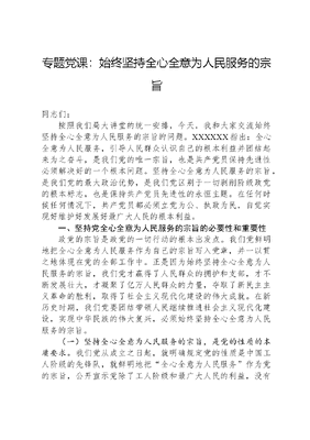 专题党课:始终坚持全心全意为人民服务的宗旨同志们:按照我们局大讲堂的统一安排,今天,我和大家交流始终坚持全心全意为人民服务的宗旨的问题。XXXXXX指出:全心全意为人民服务,引导人民群众认识自己的根本利益并团结起来为之奋斗,是我们党的唯一宗旨,也是共产党员保持先进性必须解决好的一个根本问题。坚持全心全意为人民服务的宗旨,是我们党的最大政治优势,是我们党区别于一切剥削阶级政党的根本标志,也是保持共产党员先进性的永恒主题。在任何时候任何情况下,共产党员都必须立党为公、执政为民,自觉实现好维护好发展好最广大人民的根本利益。一、坚持党全心全意为人民服务的宗旨的必要性和重要性政党的宗旨是政党的一切行动的根本出发点。我们党鲜明地把全心全意为人民服务作为自己的宗旨写入党章,并一以贯之地体现在党的全部工作中。正是因为始终坚持全心全意为人民服务的宗旨,我们党才赢得了人民群众的拥护和支部,才不断发展壮大,才凝聚了亿万人民群众的力量,夺取了新民主主义革命的胜利,取得了社会主义现代化建设的伟大成就。在新历史时期,我们党要团结带领人民继续推进社会主义现代化建设,实现中华民族的伟大复兴,必须始终坚持全心全意为人民服务的宗旨。(一)坚持全心全意为人民服务的宗旨,是党的性质的本质要求。我们党从成立之日起,就明确规定党的性质是中国工人阶级的先锋队,就鲜明地把全心全意为人民服务作为党的宗旨,公开宣示党除了工人阶级和最广大人民的利益,没有自己的特殊利益。100多年来,无论形势任务发生怎样的变化,无论面对什么样的冲击和考验,党的宗旨始终没有改变,而且其内涵不断得到丰富和拓展。XXX党章对党的性质作出了新表述,明确指出:中国共产党是中国工人阶级的先锋队,同时是中国人民和中华民族的先锋队,是中国特色社会主义事业的领导核心,代表中国先进生产力的发展要求,代表中国先进文化的前进方向,代表中国最广大人民的根本利益。这就把党的性质和宗旨紧紧地连在一起,鲜明地揭示了坚持党的宗旨是坚持党的性质的本质要求。一是把党的先锋队性质由一个先锋队表述为两个先锋队,更加清楚地表明我们党不仅代表着中国工人阶级的利益,而且代表着中国人民和中华民族的利益,这是我们党依据新的历史方位和历史条件,对党的性质认识的进一步深化和发展,也是对坚持党的宗旨要求进一步发展。二是突出强调党要始终做到三个代表,并把代表先进生产力的发展要求和代表先进文化的前进方向,最终归结到代表最广大人民的根本利益,丰富了党的宗旨的内涵。也就是说,坚持党的先锋队性质,做到三个代表,核心都是坚持全心全意为人民服务的宗旨。改变或丢掉了这一条,就从根本上改变了党的性质,就会使党丧失先进性。(二)坚持全心全意为人民服务的宗旨,是党的各项事业取得胜利的重要保证。党的事业就是人民的事业。无论是争取民族独立和人民解放,还是实现国家繁荣富强和人民共同富裕,都需要我们坚持全心全意为人民服务的宗旨,动员和率领千千万万人民群众为之共同奋斗。广大人民群众正是从党的奋斗历程中,从党领导人民进行的革命和建设实践中,从广大党员不怕牺牲、英勇奋斗的具体行动中,从不断获得经济、政治和文化权益的切身感受中,深切领悟到我们党是实实在在地为全体人民谋利益的,因而自觉自愿地跟党走,积极投身并不断推进革命、建设和改革的伟大事业。在新民主主义革命时期,我们党领导人民翻身求解放,得到了人民的广泛拥护和支部。妻子文可居文库——海量学习资料,手机电脑均可下载www.wenkeju.com送郎当红军,母亲送儿上战场,千百万父老乡亲推小车、抬担架支援前线的动人情景,都是人民支持党领导的革命战争的真实写照。新中国成立后,为改善人民生活,实现广大人民群众改变我国经济文化落后状况的迫切愿望,我们党积极探索在一个经济文化相对落后的东方大国建设社会主义的正确道路。广大党员干部在极其困难的条件下,坚持党的宗旨,密切联系群众,与人民群众同甘共苦、顽强拼搏,闯过了一个又一个难关,迅速改变了一穷二白的面貌,为进行社会主义现代化建设奠定了坚实的基础。邓小平同志在总结这段历史时说:为什么过去很困难的局面我们都能渡过?根本的问题是我们的干部、党员同人民群众一块苦。十一届三中全会以来,我们党团结带领全国人民坚持以经济建设为中心,大力推进改革开放和社会主义现代化建设,不断提高人民群众的物质文化生活水平。进入新世纪,我们党明确提出了本世纪头20年,集中力量,全面建设惠及十几亿人口的更高水平的小康社会的宏伟目标。这是坚持全心全意为人民服务宗旨的集中体现,是人民意愿的集中反映,鼓舞了广大人民群众团结一致为建设中国特色社会主义的伟大事业不懈奋斗。我们党100多年的历史证明,在任何时候任何情况下,全心全意为人民服务的宗旨不能忘,与人民群众同呼吸共命运的立场不能变,坚信群众是真正英