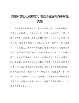党课不忘初心保持定力 在四个正确对待中彰显党性今天利用党课教育时间,和大家谈谈如何正确对待组织、正确对待名利得失、正确对待进步、正确对待同志。四个正确对待是个老话题,道理大家都比我明白,为什么还要讲?斯大林说:随着革命的深入和发展,队伍的不断扩大,新人的增多,有必要把人人都知道的老道理,进行反复宣传。老道理有新内容,并不是人人都了解的。实事求是地讲,这四个正确对待,是我们干好事业、实现人生价值的根本,是人人会遇到、时时会遇到,而且很难做好的问题。总体看,大多数党员能够识大体、顾大局,自觉服从组织安排,表现出了较高的思想觉悟。但不可否认的是,也有个别同志顾虑较多,患得患失,私下猜测、议论。怎样做到四个正确对待,我想就是对待组织要有感恩之心,对待名利要有淡泊之心,对待进步要有坦然之心,对待同志要有关爱之心。一、以感恩之心对待组织,始终保持对组织的高度信赖XXXXXX指出,好干部不会自然而然产生。成长为一个好干部,一靠自身努力,二靠组织培养。从党员干部自身来讲,个人勤奋努力,是成长的内因,但是如果没有组织的培养和关怀,没有组织给搭建的平台,个人能力再强,素质再高,也很难有所作为。一要用感恩的心态回报组织。知恩图报是中华民族的传统美德。大家可以回顾一下我们每个人的成长经历,我们许多人都是从一名普通青年,成长为今天的党员领导干部的,可以说,没有组织,就没有我们现在的生活。然而实际中,个别同志有时看不到这一点,比如,在个人成长进步上,总认为是自己努力奋斗的结果,与组织的培养没有多大关系;进步慢了,个人要求没有得到满足,就觉得组织亏欠了自己;有的尽管在个人进步上收获了很多,但横攀竖比总认为组织给予自己的还不够,甚至埋怨、闹情绪等等,这些都是对党组织缺乏感激之情、感恩之心的表现。文可居文库——海量学习资料,手机电脑均可下载www.wenkeju.com工作中,我们不能只向组织伸手,更要想想我们给组织回报了什么,给单位建设贡献了什么。明成祖朱元璋在一次打仗时被困,一连几天都没有吃东西,差一点饿死,是一位老妇人给他吃了一碗饭,救了他的命。对此,他一直感激于心,当了皇帝以后还专程去看望老妇人,可谓是不忘一饭之恩。我们作为一名党员,受组织的恩情可以说远远大于一饭之恩,更应该懂得感恩图报。作为一名党员,我们都要强化组织意识、党性意识,多想想组织对自己的培养,多体谅体谅组织的难处,多为组织分忧,以听从安排的实际行动回报组织。这样,我们对组织就能多一些服从需要,少一些斤斤计较;多一些尊重理解,少一些牢骚埋怨。二要用求真的信念信任组织。过去有些同志信奉提拔靠关系、当官靠活动,所以一到干部调整、一有位置空缺的时候,便到处托关系、找门路。党的十八大以来,大气候越来越好,小环境越来越严,风清气正、生态良好。这几年我们在风气建设、文可居文库——海量学习资料,手机电脑均可下载www.wenkeju.com选人用人上的公开公正,大家也有切身体会。作为一名党员,心理要健康,心态要阳光,相信组织一定会严格按原则办、按政策办、按规矩办、按程序办,用好机制选拔好干部,用好作风使用好干部;相信组织一定会充分考虑大家想进步、想发展的良好意愿,反复酝酿,权衡利弊,最大限度盘活现有资源,做到人岗相适、人尽其才。三是以大局利益为重服从组织。干部的选拔、任用和调配具有很强的政策性和导向性,必须按照政策法规来办,结合实际情况来调,根据岗位需要来选,离开了这些去搞个人设计,结果只能是期望值越高、失落感越强。作为一名党员,你只管干好自己的工作就行了,至于你的成长进步,组织上会考察,也会从单位建设大局考虑,群众也自有公论,党委在选人用人上,是根据岗位需要和个人优长而定的,是在广泛听取群众意见的基础上,慎重考虑研究决定的,也是经得起群众监督和历史检验的,不是说谁想干啥就干啥,谁想进步就进步,这些都是不以个人的意志为文可居文库——海量学习资料,手机电脑均可下载www.wenkeju.com转移的,组织会对每名同志的成长进步高度负责,做出公正合理的安排。二、以淡泊之心对待名利,始终保持阳光健康的好心情这里有个小故事,乾隆皇帝有一次南巡,住在金山寺,一天和方丈到江边散步,乾隆见江上百舸争流,便问方丈:你可知江上船有几艘?方丈从容回答两艘而已。乾隆笑道:这江上的船往来如织,怎么只有两艘呢?方丈答到:我只看见一艘为名,一艘为利。乾隆听后点头称赞。现实生活中,名利也往往伴随着我们一生。如何正确对待名利得失,我们常说,平平淡淡才是真。甘于平淡,是人生追求的境界,也是履行宗旨的根本要求。一要懂得知足,始终如一干工作。有人说:得之,我幸;不得,我命。如此而已。该是你的别人抢不去,不是你的也争不来。有这样的心态,才能处在一种智慧状态