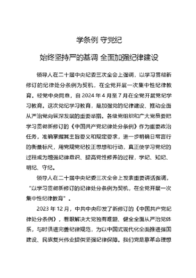 学条例 守党纪始终坚持严的基调 全面加强纪律建设领导人在二十届中央纪委三次全会上强调,以学习贯彻新修订的纪律处分条例为契机,在全党开展一次集中性纪律教育。经党中央同意,自2024年4月至7月在全党开展党纪学习教育。这次党纪学习教育,是加强党的纪律建设、推动全面从严治党向纵深发展的重要举措。各级党组织和广大党员要把学习贯彻新修订的《中国共产党纪律处分条例》作为重要政治任务,准确掌握其主旨要义和规定要求,进一步明确日常言行的衡量标尺,用党规党纪校正思想和行动,真正使学习党纪的过程成为增强纪律意识、提高党性修养的过程,学纪、知纪、明纪、守纪。领导人在二十届中央纪委三次全会上发表重要讲话强调,以学习贯彻新修订的纪律处分条例为契机,在全党开展一次集中性纪律教育。2023年12月,中共中央印发了新修订的《中国共产党纪律处分条例》,着眼解决大党独有难题、健全全面从严治党体系,与时俱进完善纪律规范,为以中国式现代化全面推进强国建设、民族复兴伟业提供坚强纪律保障。我们党是靠革命理想和铁的纪律组织起来的马克思主义政党,纪律严明是党的光荣传统和独特优势。党的十八大以来,以领导人为核心的党中央把纪律建设摆在更加突出的位置,作为全面从严治党的治本之策,与时俱进推进理论、实践和制度创新,纪律建设成为新时代党的建设总体布局的突出亮点。党中央先后于2015年、2018年和2023年三次修订《条例》,始终坚持严的基调,不断完善纪律规矩,释放了全面从严治党越来越严、越往后执纪越严的强烈信号,充分彰显了我们党推进自我革命的坚定决心和坚强意志。促进全党深刻领悟两个确立的决定性意义、坚决做到两个维护两个确立是党的十八大以来党的建设最重大的政治成果,是党战胜一切艰难险阻、应对一切不确定性的最大确定性、最大底气、最大保证,两个维护是党的最高政治原则和根本政治规矩,必须以严明纪律作保障。《条例》旗帜鲜明,把坚决维护领导人党中央的核心、全党的核心地位,坚决维护以领导人为核心的党中央权威和集中统一领导作为出发点和落脚点,进一步严明政治纪律和政治规矩。完善保障党中央政令畅通的纪律条款,将贯彻党中央决策文可居文库——海量学习资料,手机电脑均可下载www.wenkeju.com部署只表态不落实行为由违反工作纪律调整到违反政治纪律;充实政绩观错位,违背新发展理念、背离高质量发展要求的处分规定;增写对搞政治攀附、结交政治骗子等行为的处分规定;对私自阅看、浏览、收听有严重政治问题资料、情节严重行为作出处分规定……《条例》充实完善各级党组织和全体党员在政治方向、政治立场、政治言论、政治行为方面必须遵守的纪律规矩。党的十八大以来,领导人反复强调严守政治纪律和政治规矩的极端重要性。政治纪律是六项纪律中最重要、最根本、最关键的纪律,必须首先从政治上看,始终把讲政治、遵守政治纪律和政治规矩排在首要位置。作为规范党组织和党员行为的基础性法规,《条例》突出政治纪律和政治规矩,有利于推动全党更加深刻领悟两个确立的决定性意义、更加坚决做到两个维护,确保全党在政治立场、政治方向、政治原则、政治道路上同以领导人为核心的党中央保持高度一致,在新征程上统一思想、统一意志、统一行动,步调一致向前进,使全党团结成一块坚硬的钢铁。贯彻落实领导人新时代中国特色社会主义思想,将领导人关于全面加强党的纪律建设重要论述转化为纪律要求文可居文库——海量学习资料,手机电脑均可下载www.wenkeju.com坚持用马克思主义中国化时代化最新成果武装全党、指导实践、推动工作,是我们党创造历史、成就辉煌的一条重要经验。2018年《条例》施行以来,在加强党的纪律建设,推动全党形成遵规守纪的高度自觉方面发挥了重要作用。党的十九大以来,领导人围绕健全全面从严治党体系、解决大党独有难题、全面加强党的纪律建设提出一系列新思想新观点新论断,强调把严的基调、严的措施、严的氛围长期坚持下去,把纪律建设摆在更加突出位置,坚持党性党风党纪一起抓,使全党形成遵规守纪的高度自觉。这是我们党对新时代新征程全面从严治党规律的深刻把握,是领导人新时代中国特色社会主义思想的重要组成部分。思想指引制度建设,制度推动思想落实。落实领导人关于党的自我革命的重要思想,关于全面加强党的纪律建设重要论述的要求,在第二条增写坚持自我革命推动解决大党独有难题、健全全面从严治党体系为以中国式现代化全面推进强国建设、民族复兴伟业提供坚强纪律保障等内容;在第四条增写把严的基调、严的措施、严的氛围长期坚持下去……《条例》将领导人关于全面加强党的纪律建设重要论述转化为纪律要求,用贯穿党的创新理论的立文可居文库——海量学习资料,手机电脑均可下载www.wenkeju.com场观点方法引领纪律建设工作,有利于增强法